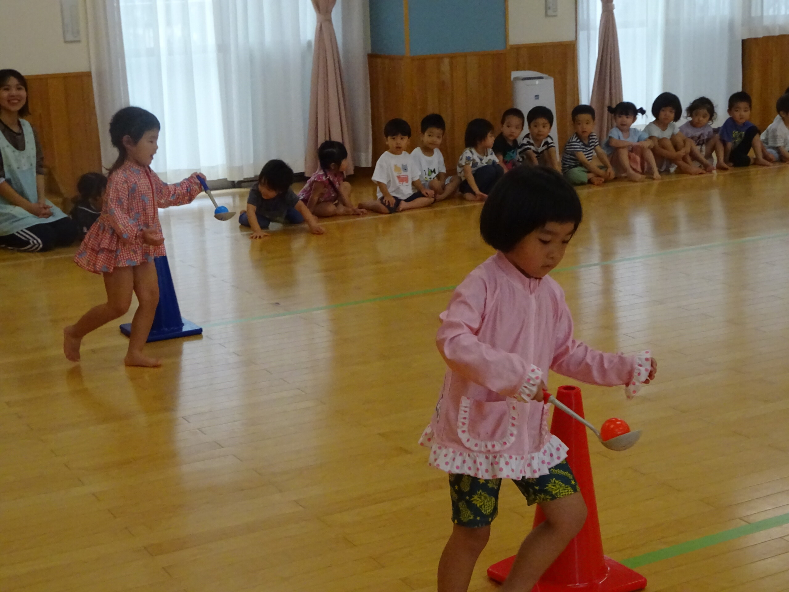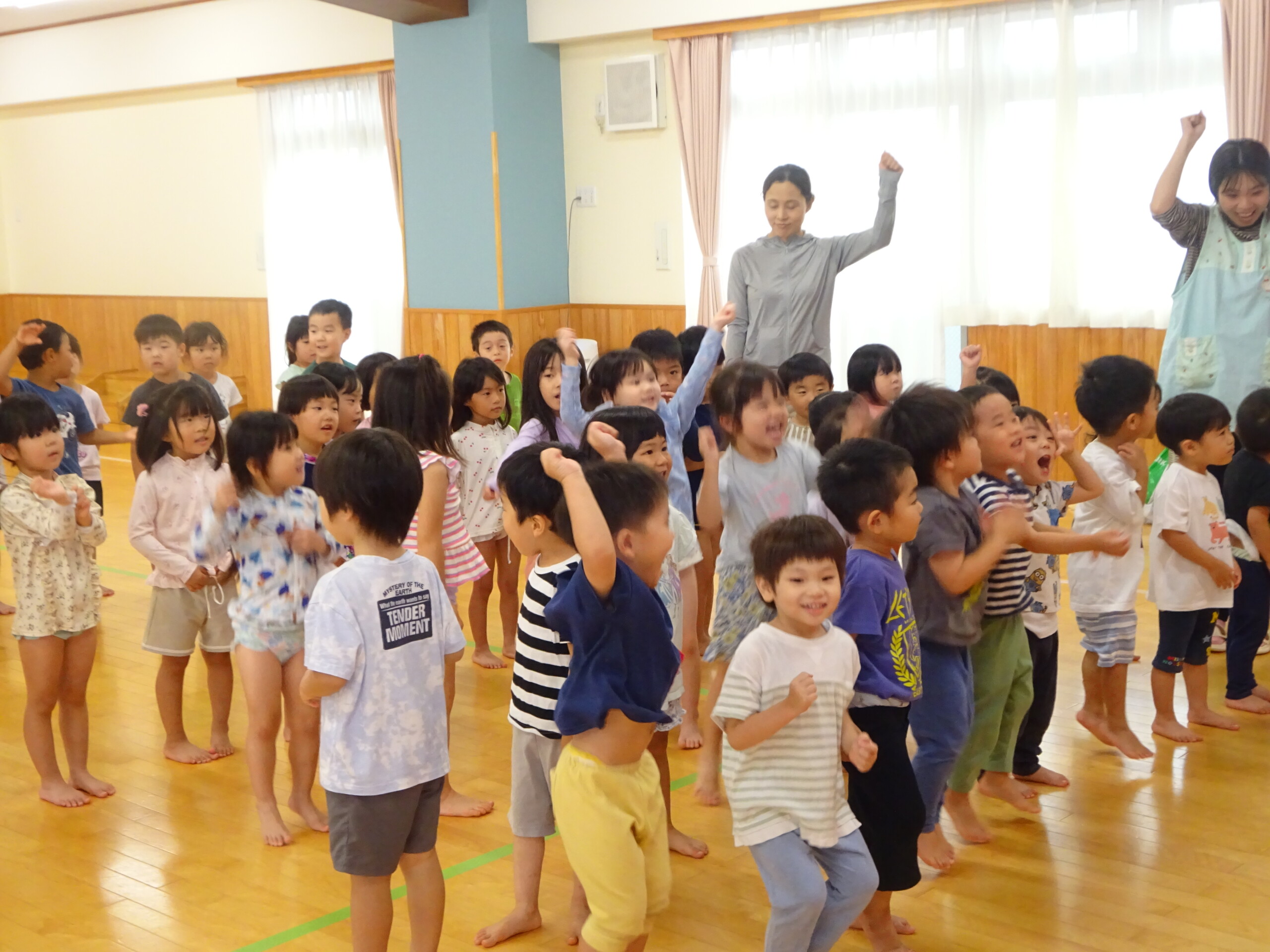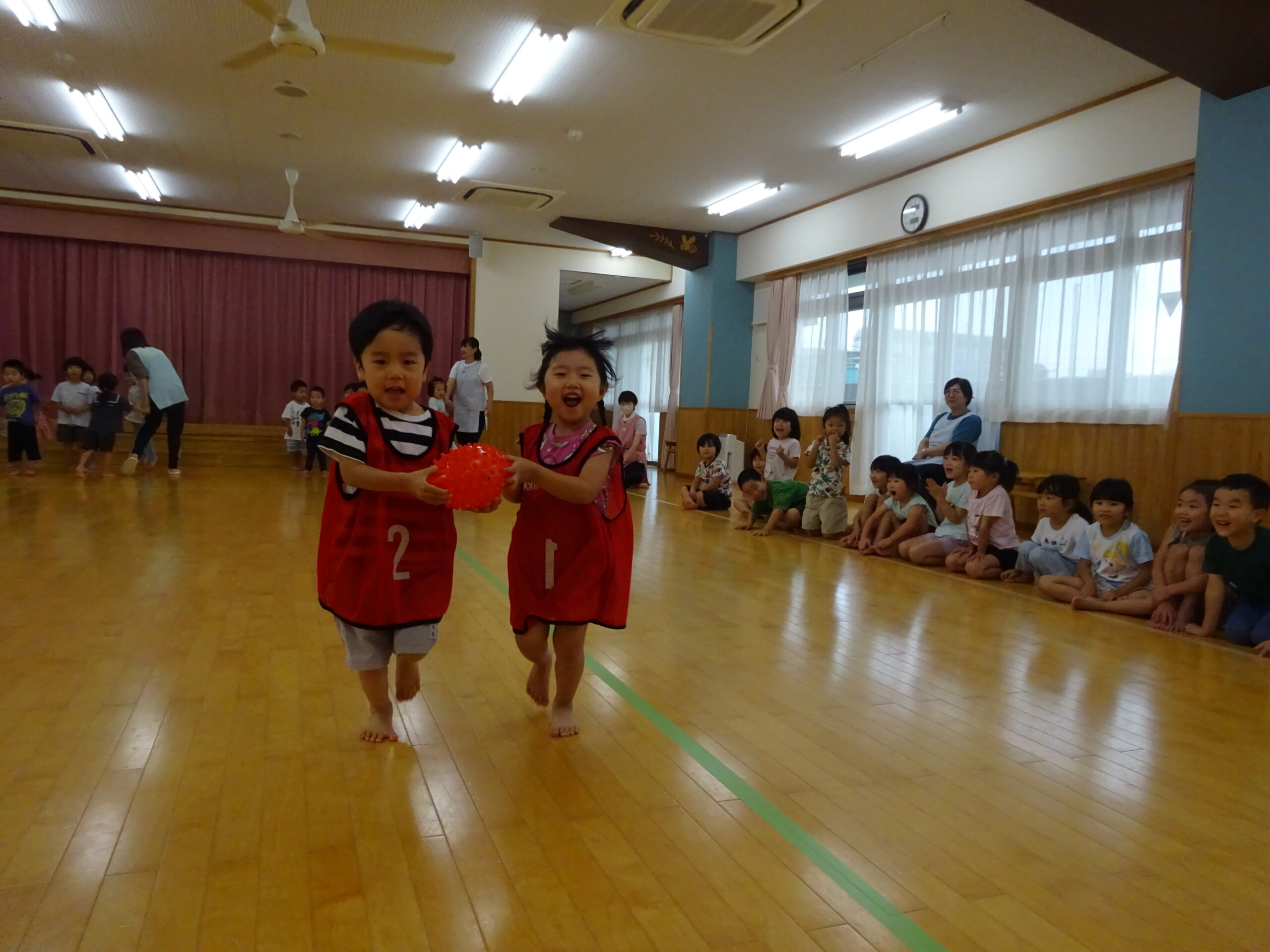 8月28日(木) みつばちホールで、プール納めがありました。今年も楽しく安全に行うことが出来たことに感謝して、保育園オリジナルの歌『プールありがとうの歌』を歌いました。ゲーム大会では、ピンポン玉やボール運びのゲームをして盛り上がりました。今年最後のプール遊びも、存分に楽しみました!太田