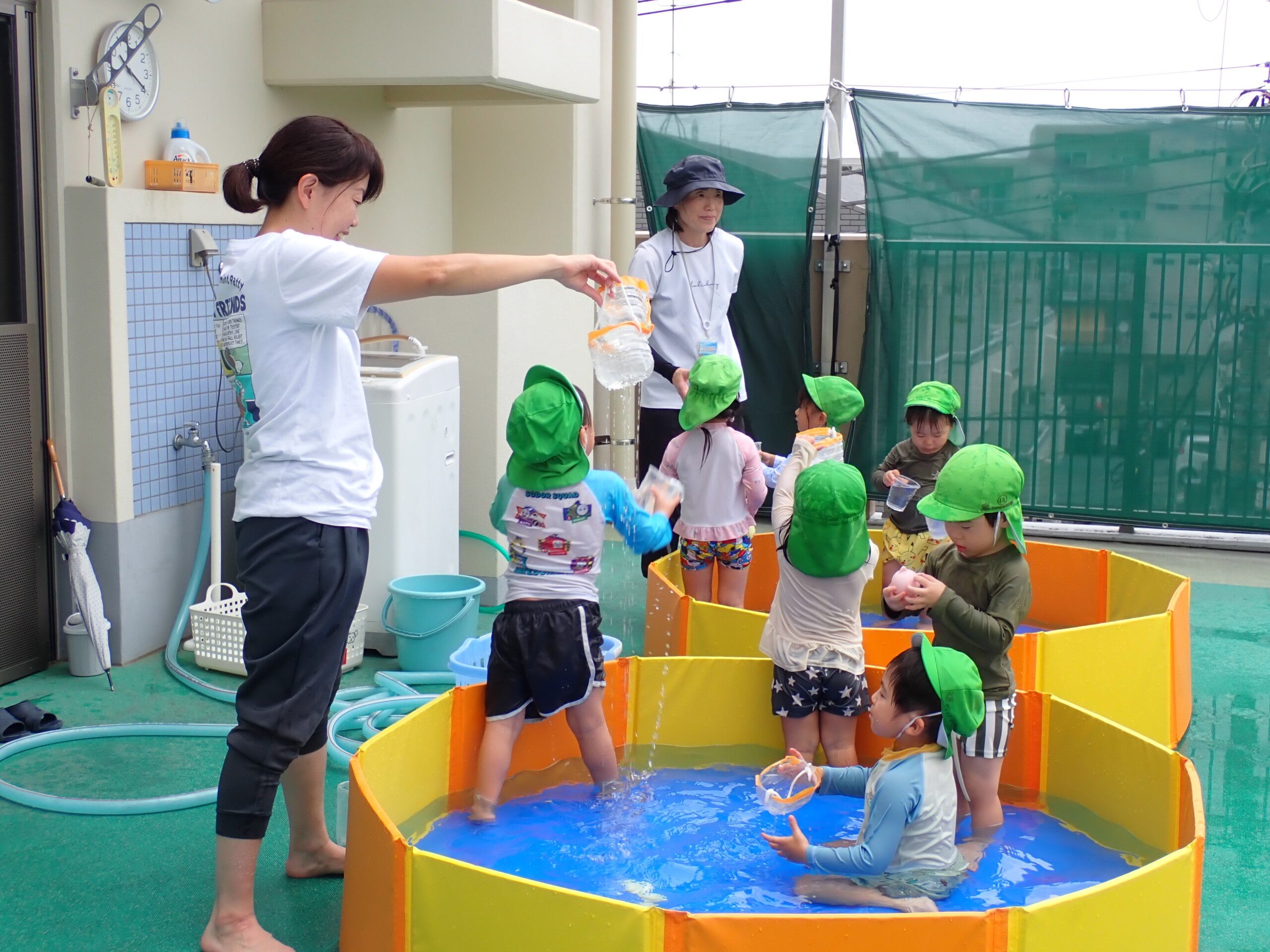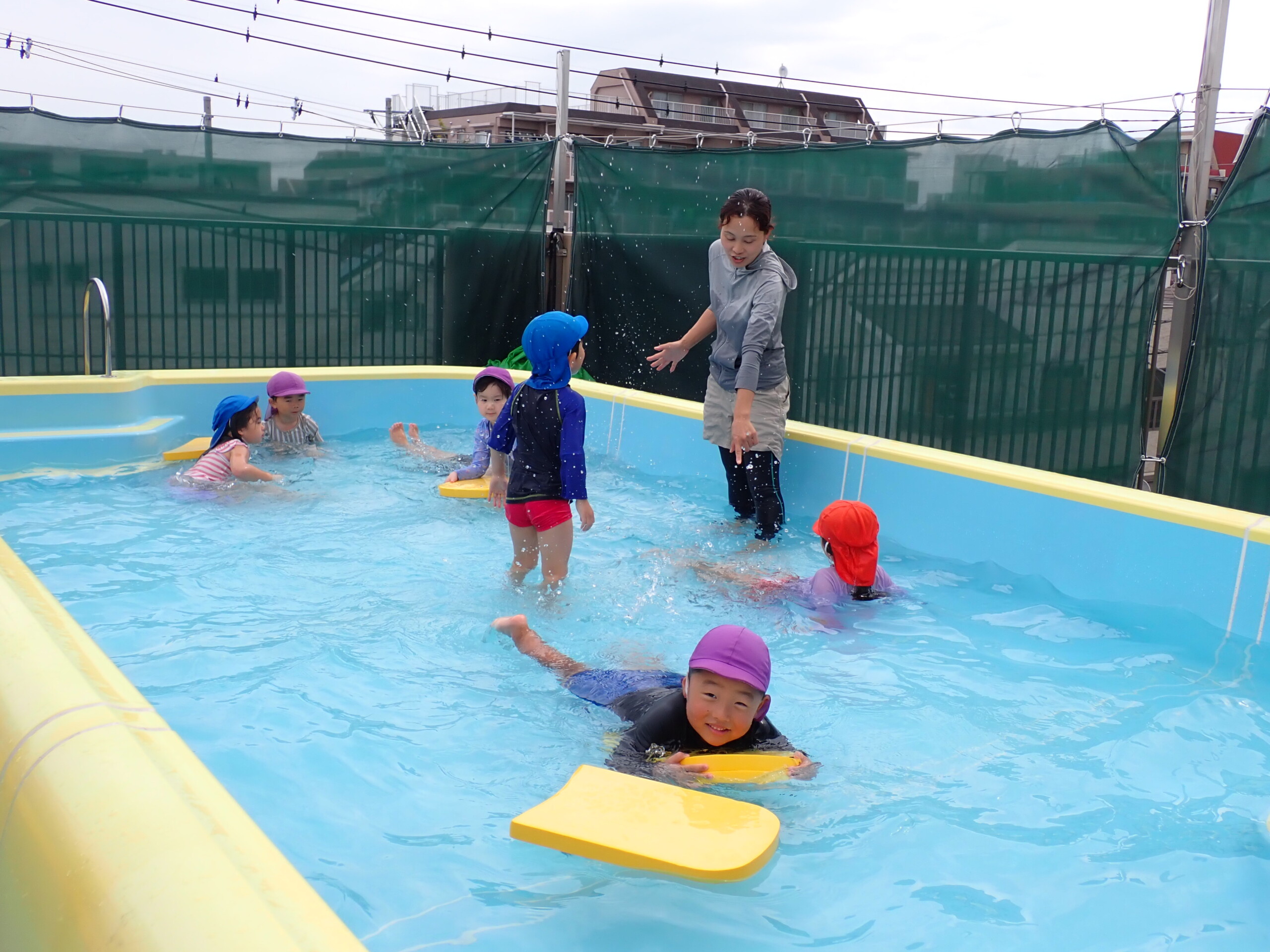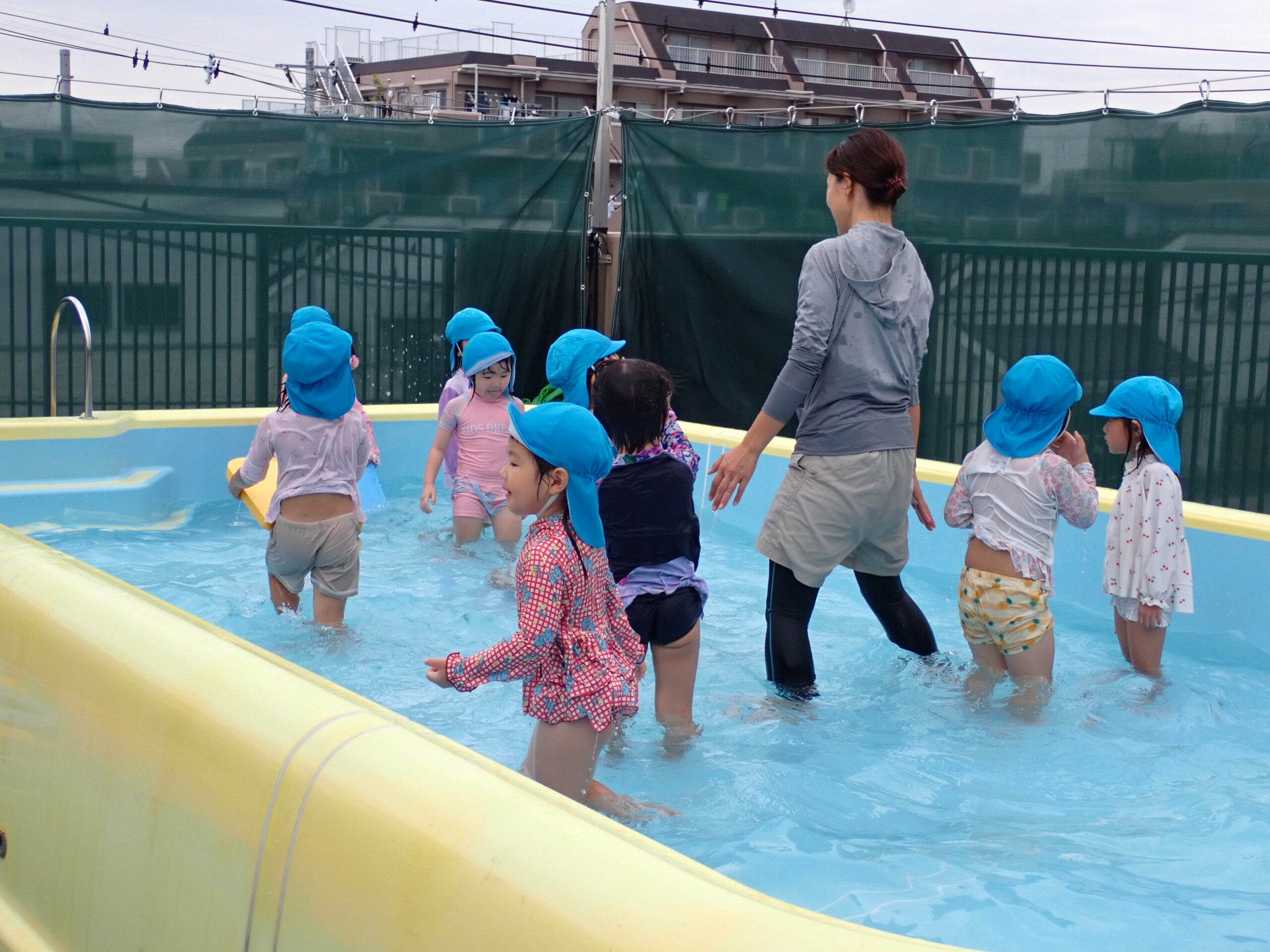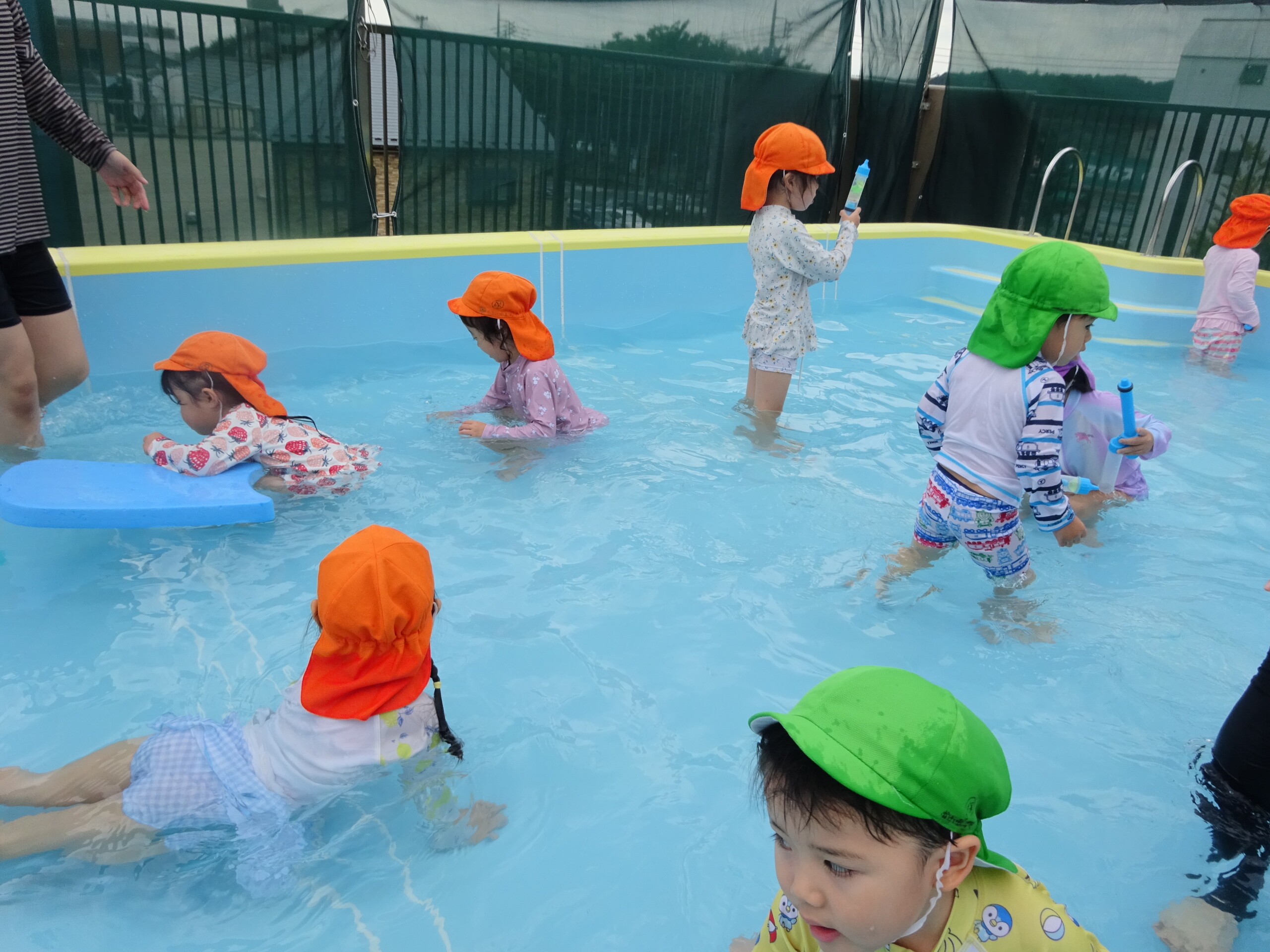 8月28日(木) みつばちホールで、プール納めがありました。今年も楽しく安全に行うことが出来たことに感謝して、保育園オリジナルの歌『プールありがとうの歌』を歌いました。ゲーム大会では、ピンポン玉やボール運びのゲームをして盛り上がりました。今年最後のプール遊びも、存分に楽しみました!太田