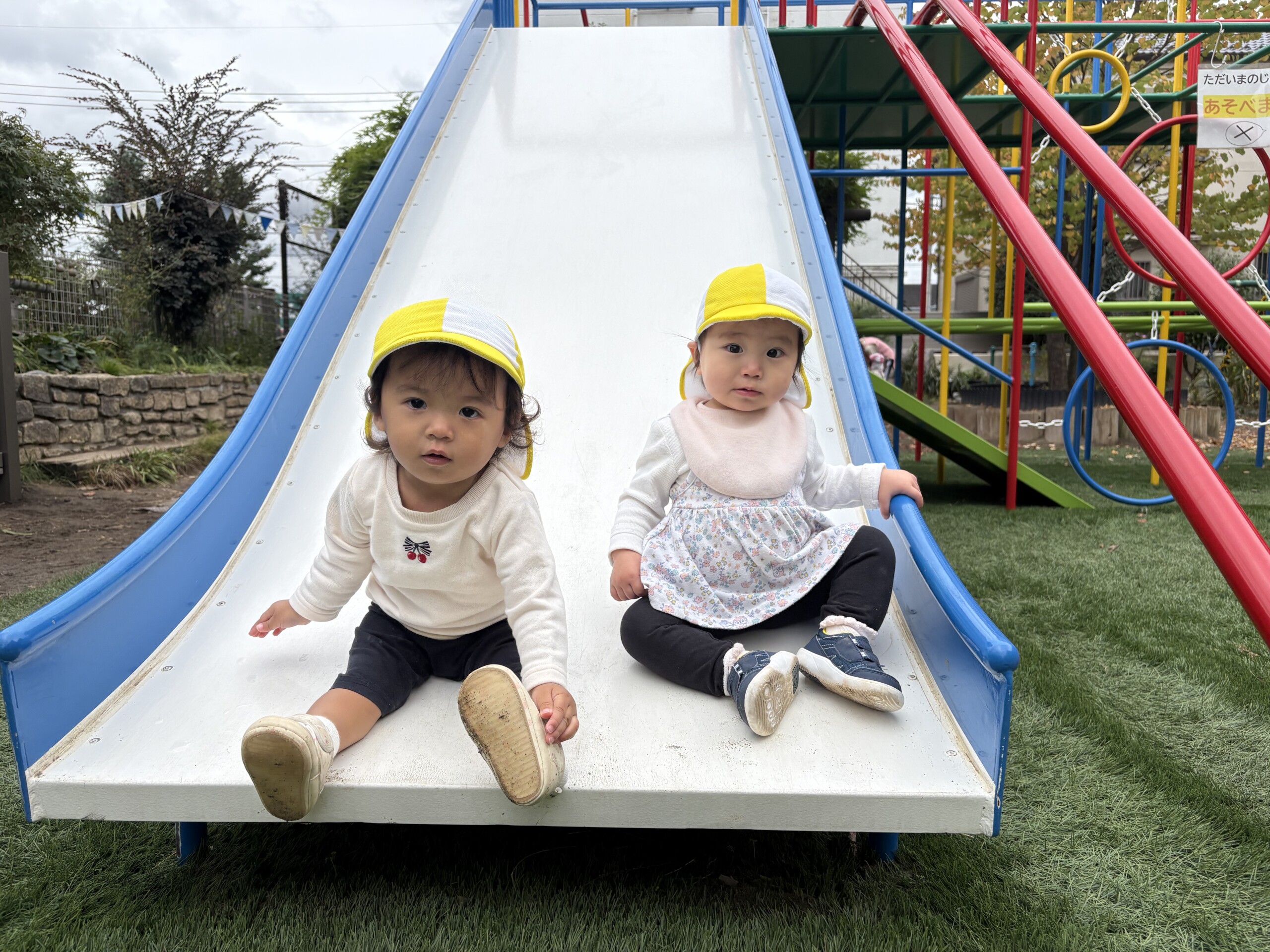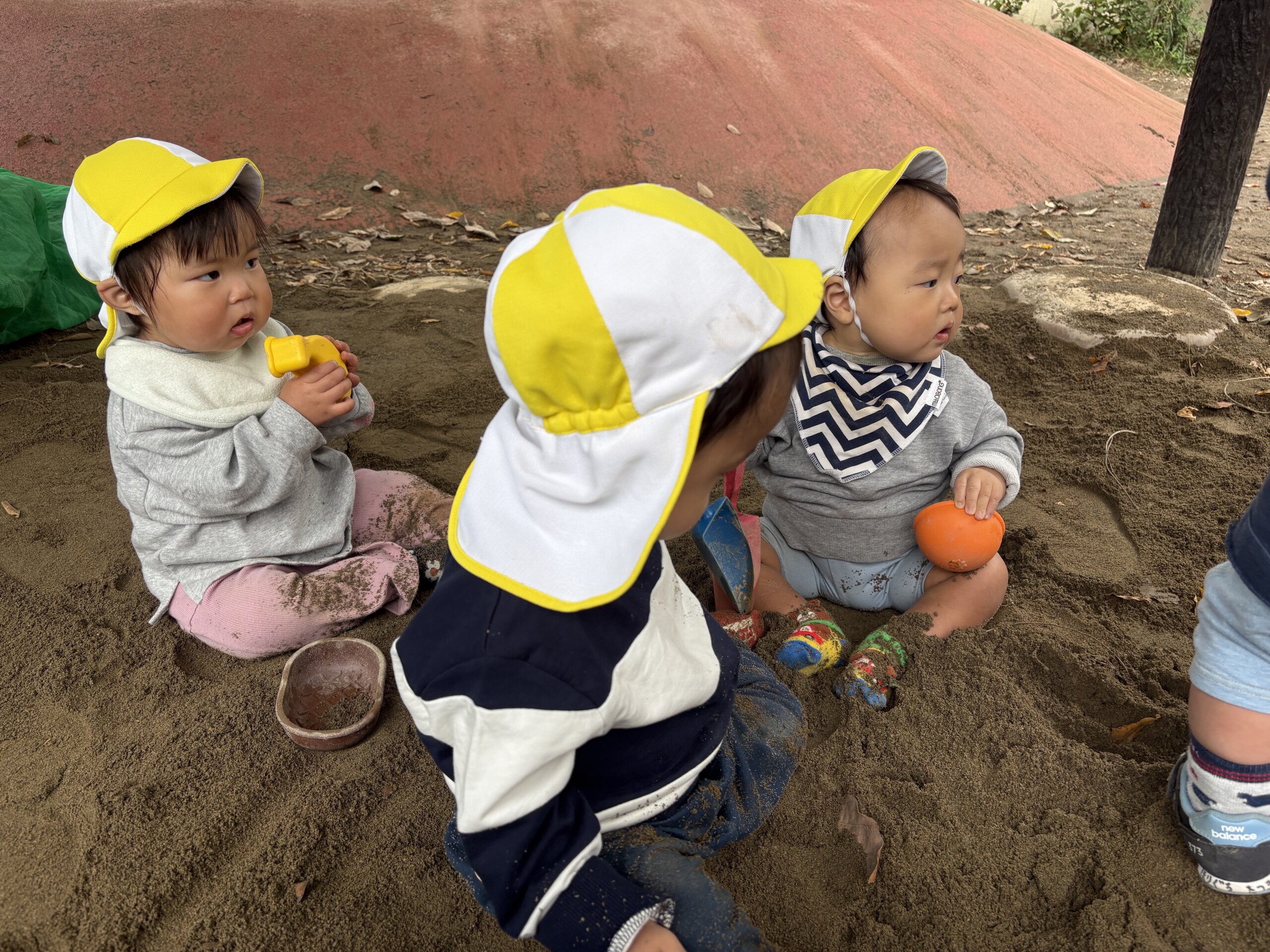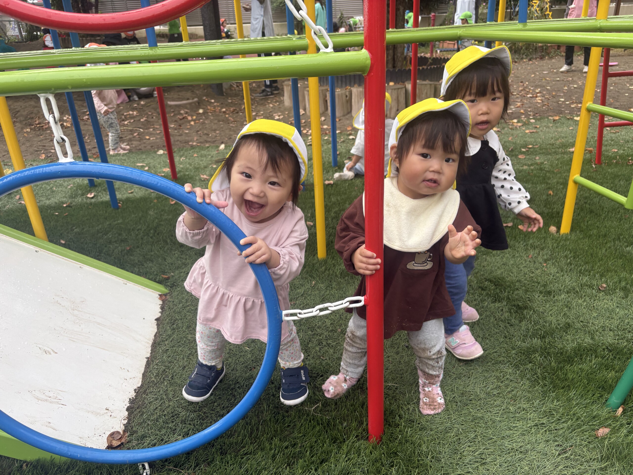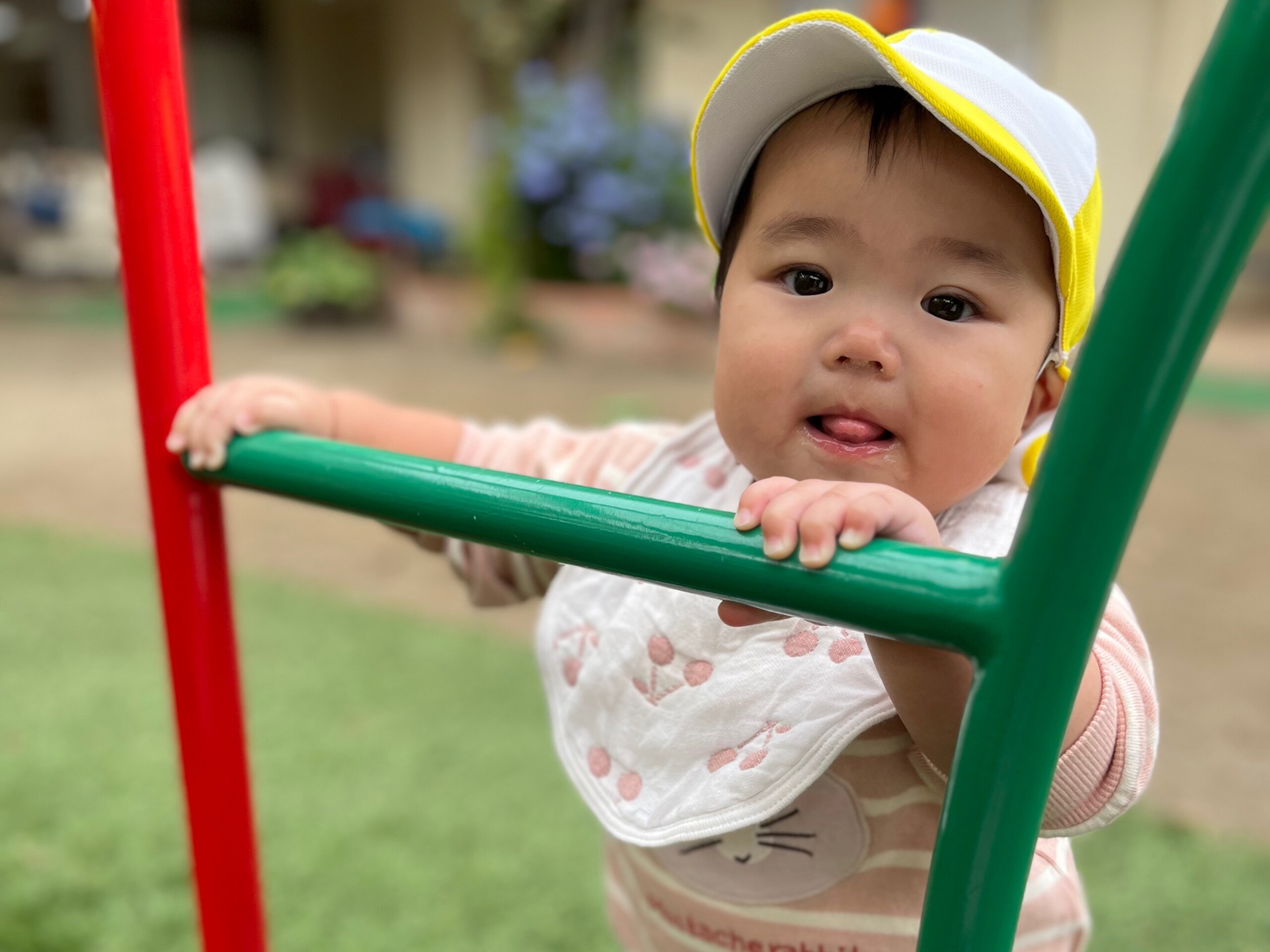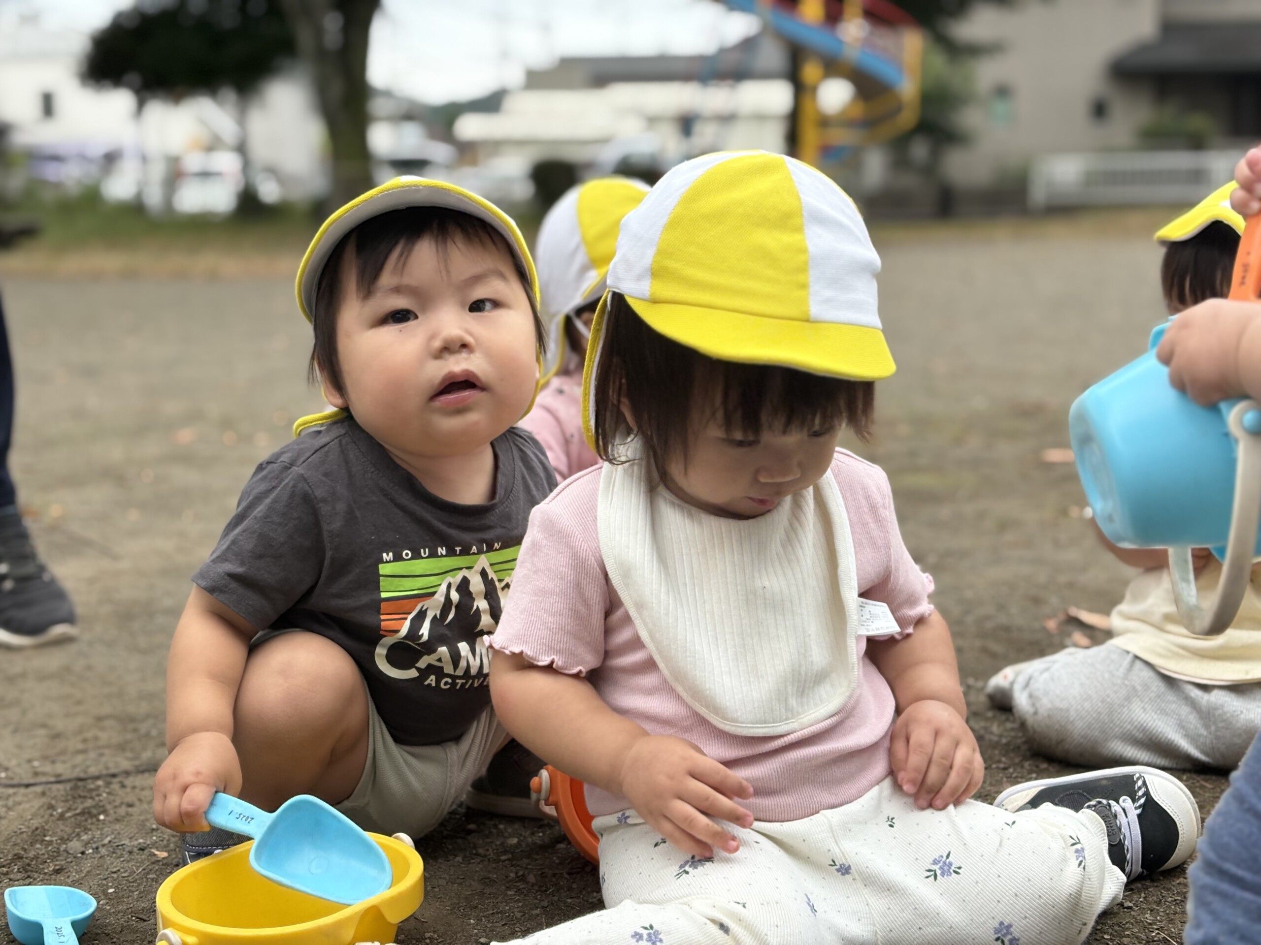日差しの強い夏の時期も終わり、過ごしやすい気温で戸外遊びがさらに楽しい時期になってきましたね。ひよこ組のお友達も、元気いっぱい戸外で遊んでいます!! 行動範囲もぐーんと広がってきて、ハイハイや伝い歩き、一人歩きで興味のある場所へ移動しそれぞれ遊びを楽しんでいます。ベビーカーや散歩車でのお散歩も楽しんでいて電車が見えると“バイバイ“や”おーい”と手を振ったり、車やお散歩をしている犬に会うと指を差したりいろいろなことに興味津々です。 これからもたくさんの経験、体験をして大きくなっていってほしいなと思います☆ それでは可愛いひよこ組の子どもたちが遊んでいる様子をご覧ください♪ 奥田