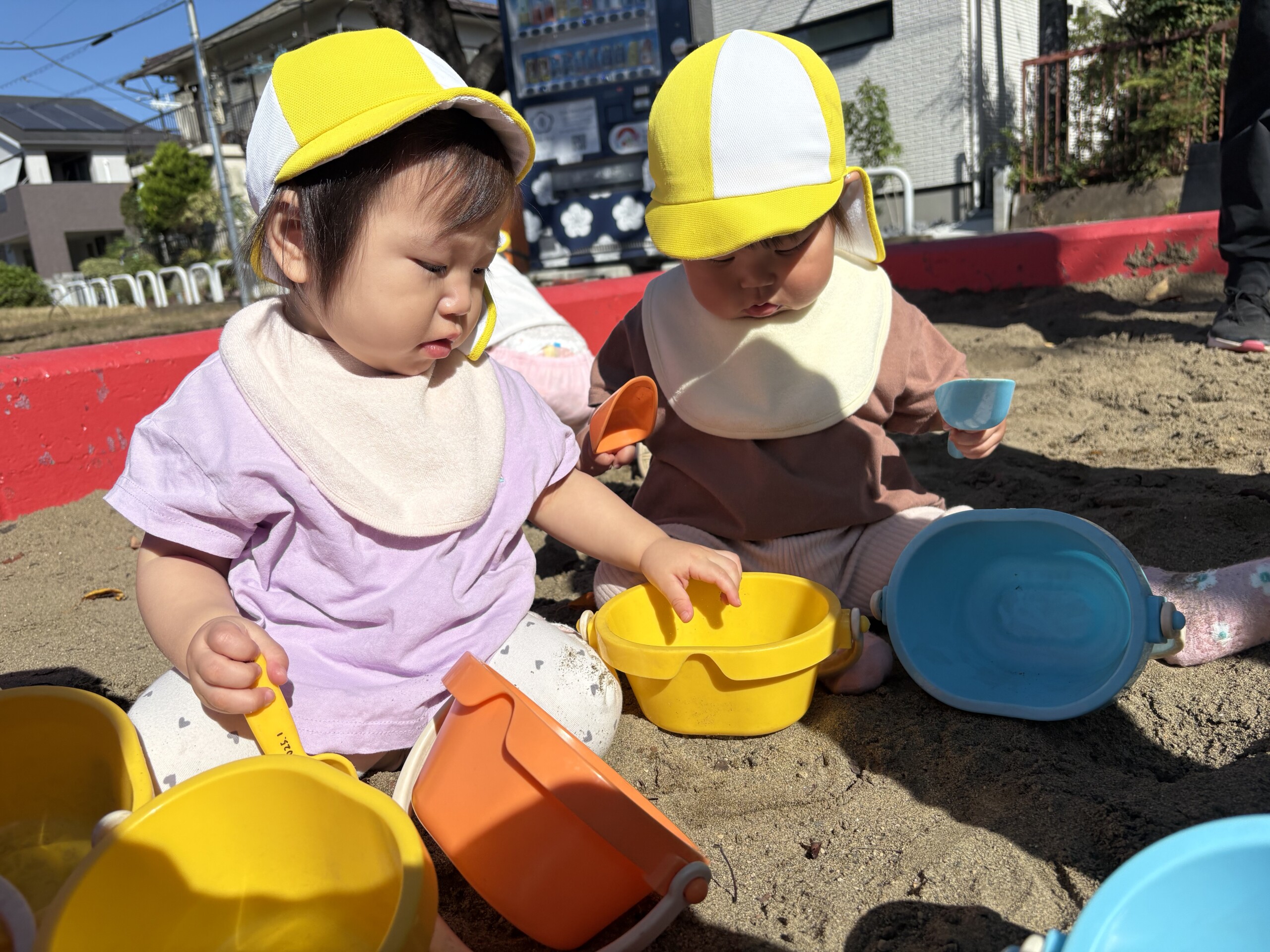 砂場では手で砂を触ったり、シャベルを使って掘った砂をバケツや気に入った型に入れたりしています‼︎
