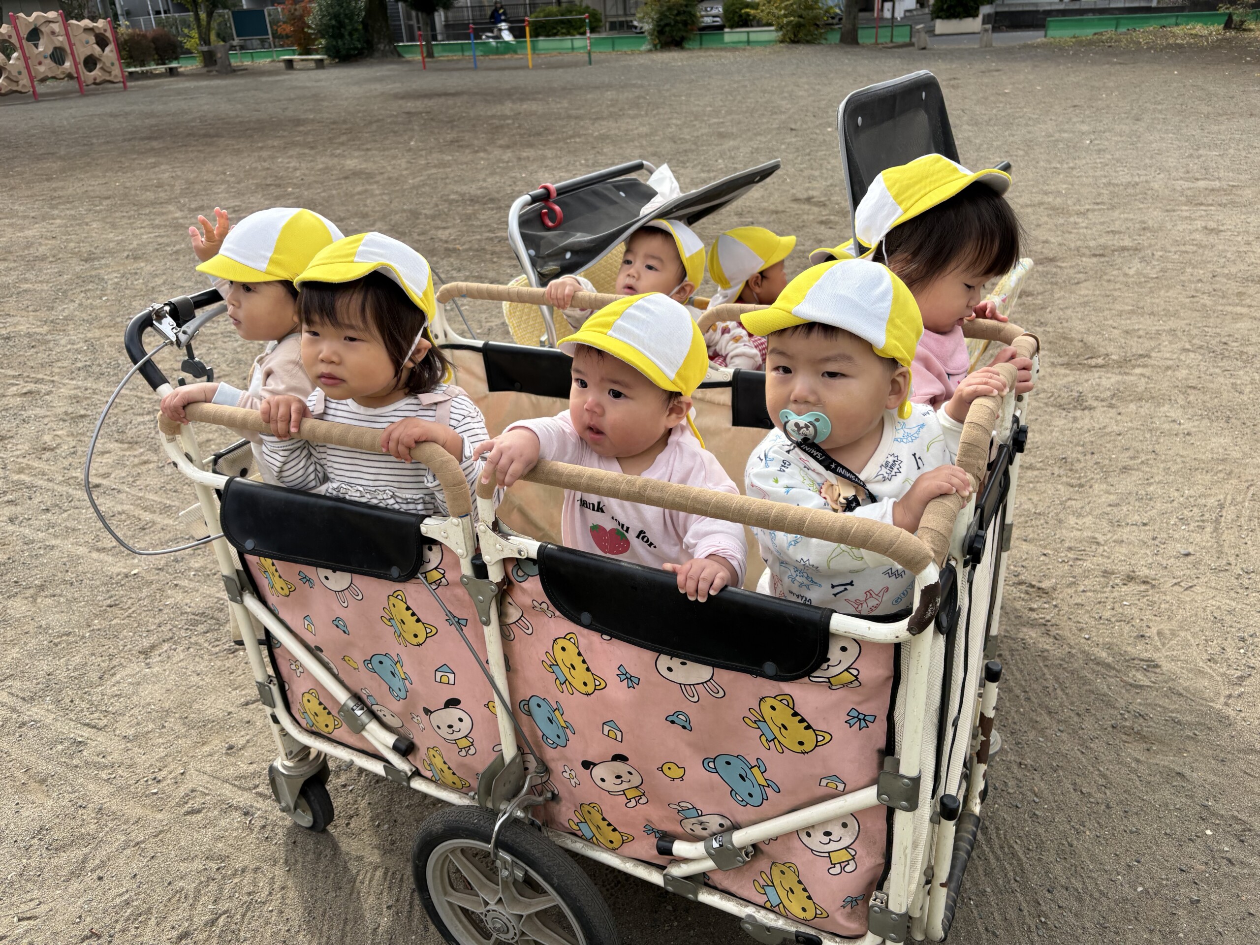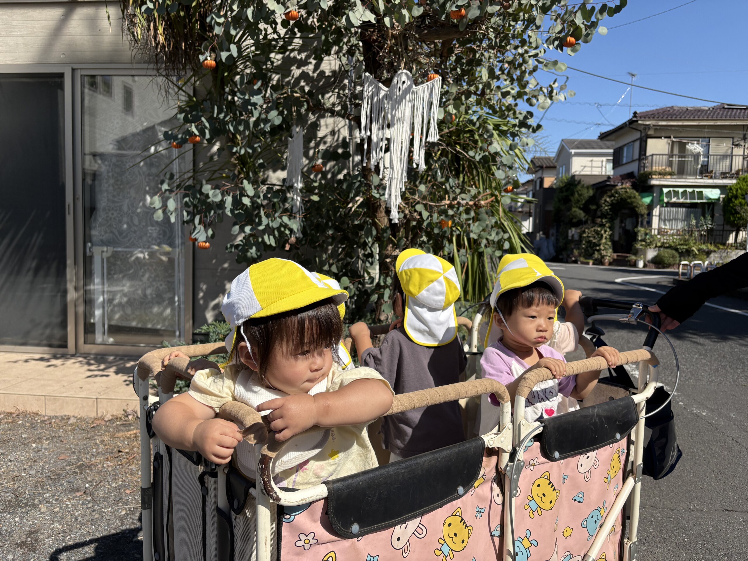 散歩車やベビーカーに乗って、白はけ公園や梨の木公園や速川公園にお散歩に行っています‼︎ みんな、散歩中の景色も大好きです‼︎