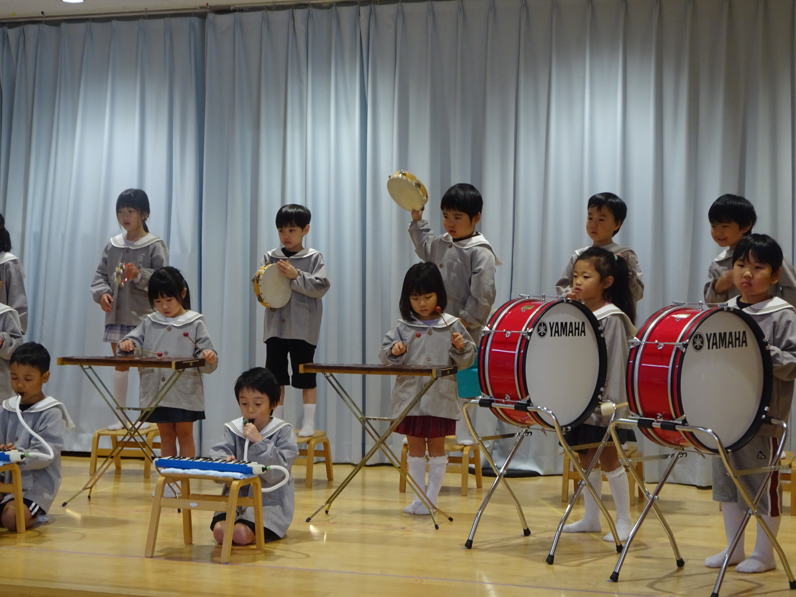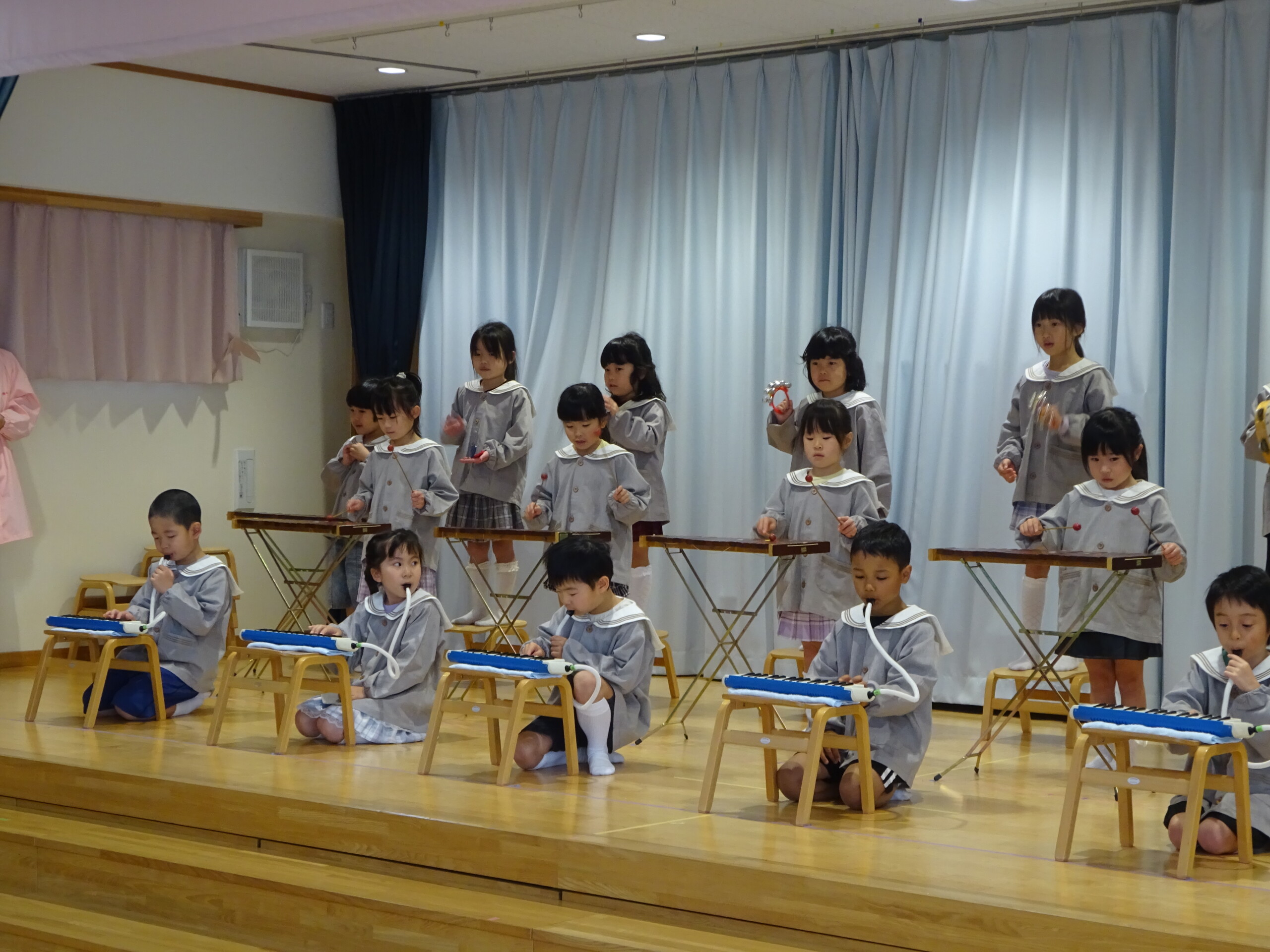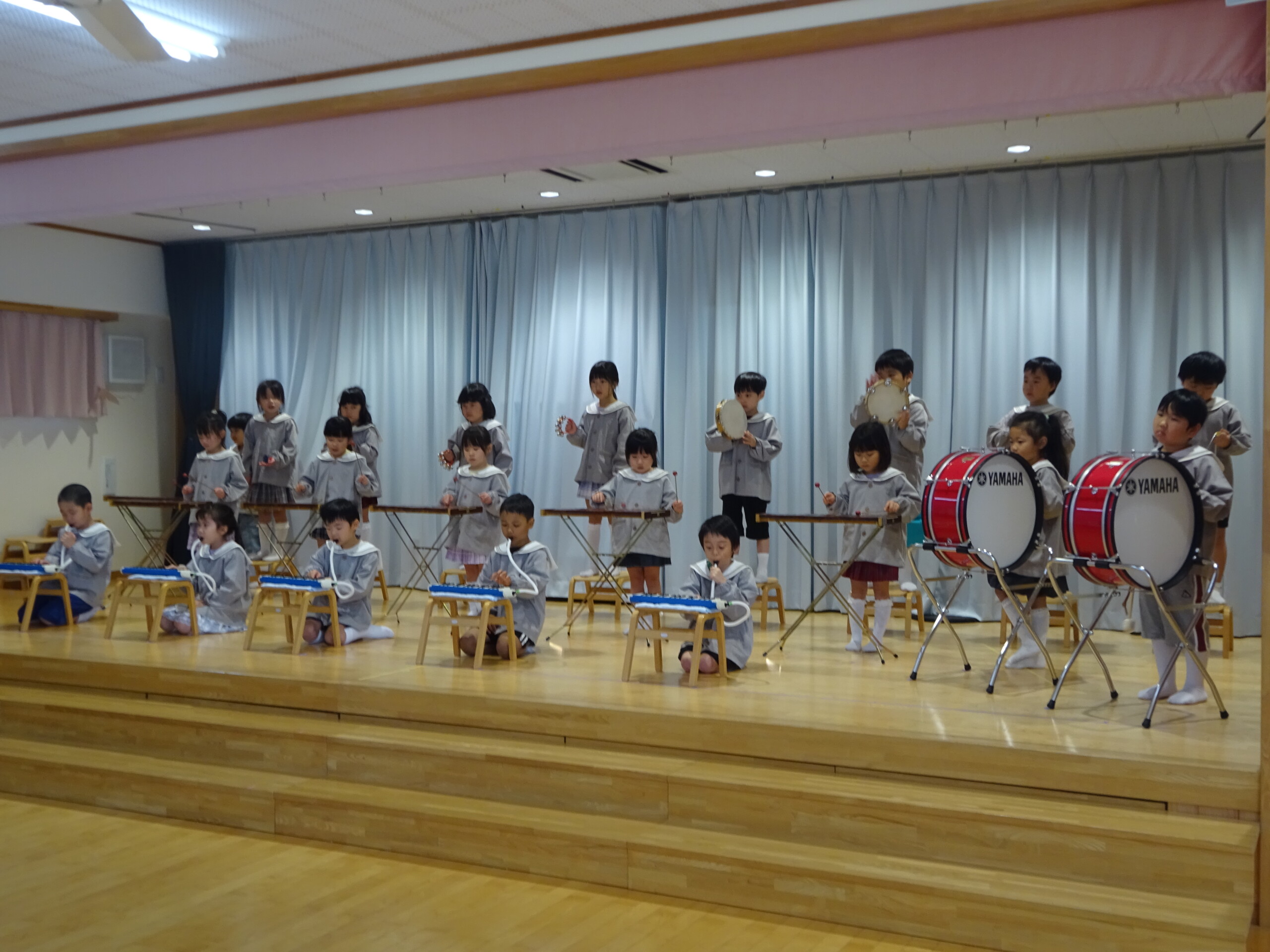 11月26日(水)、27日(木)の2日間で発表会の総練習と、写真撮影がありました。1日目は、4歳児くま組のお遊戯、5歳児きりん組のオペレッタ。2日目は、きりん組の合唱、合奏、3歳児しか組のオペレッタを行いました。初めて衣装を着た子ども達は、とても嬉しそうに舞台に立っていました。当日は、大勢のお客さんの前でドキドキしてしまう子もいるかと思いますが、笑顔で楽しみながら参加できるよう、本番まで練習を進めていきたいと思います。太田