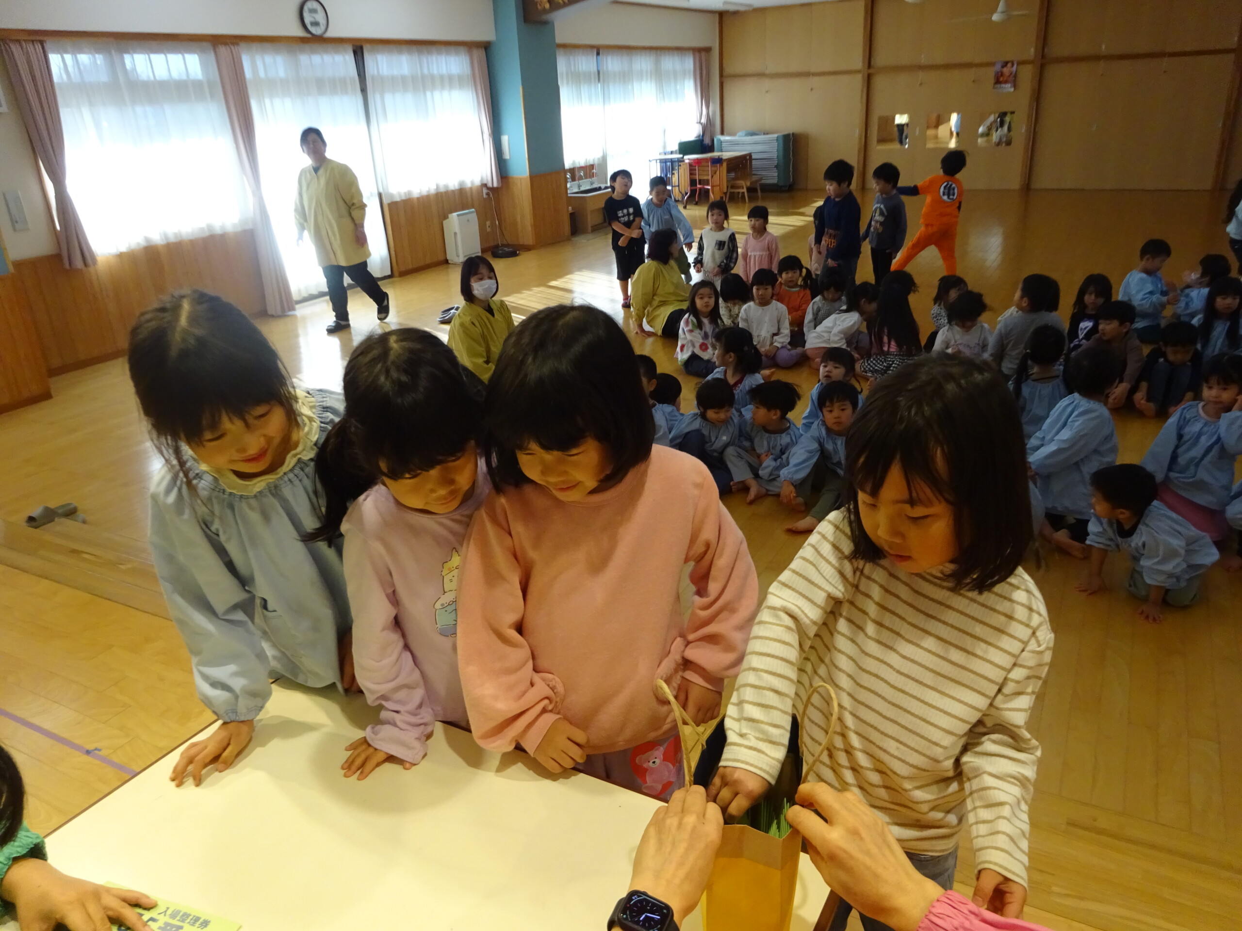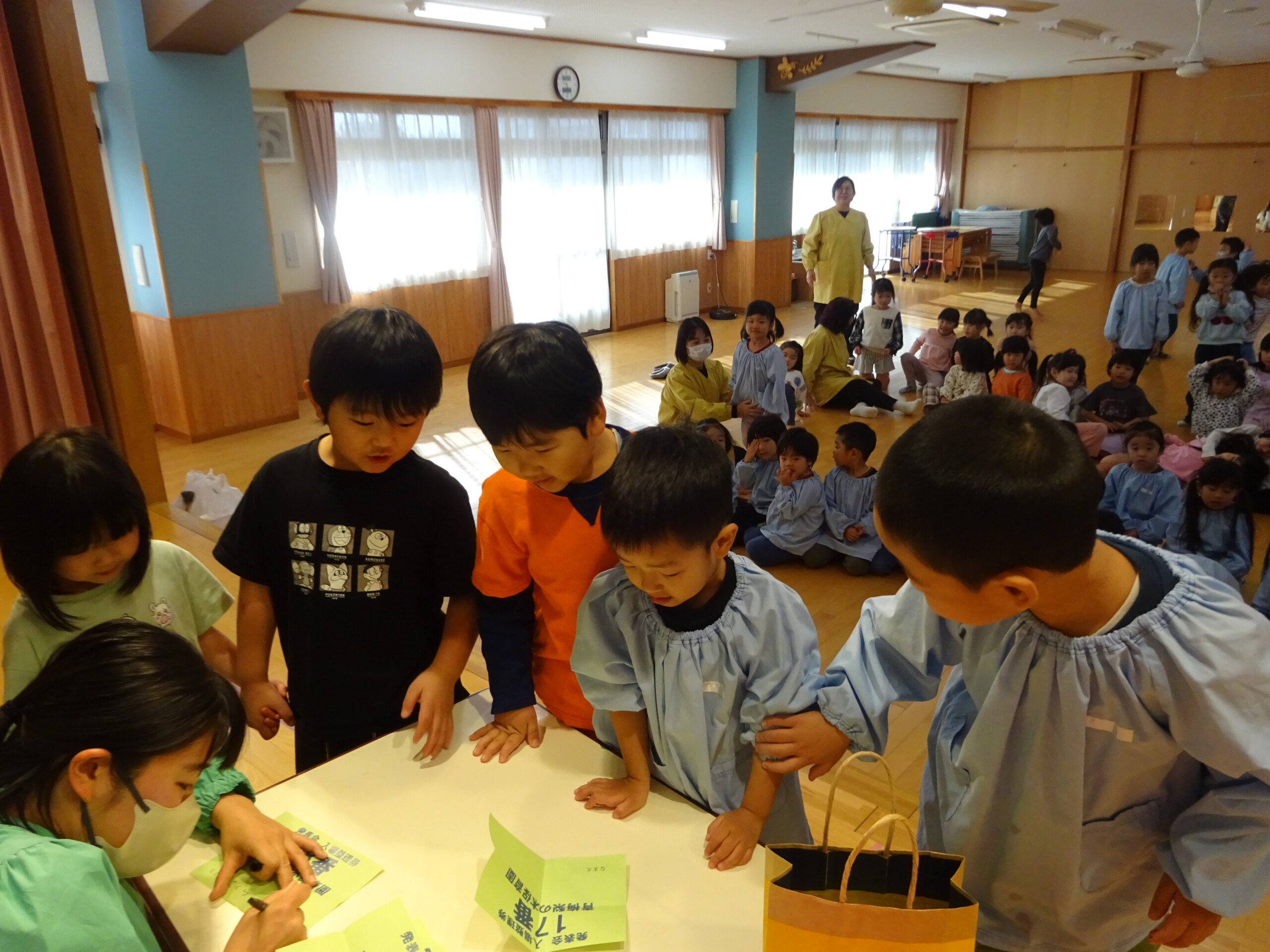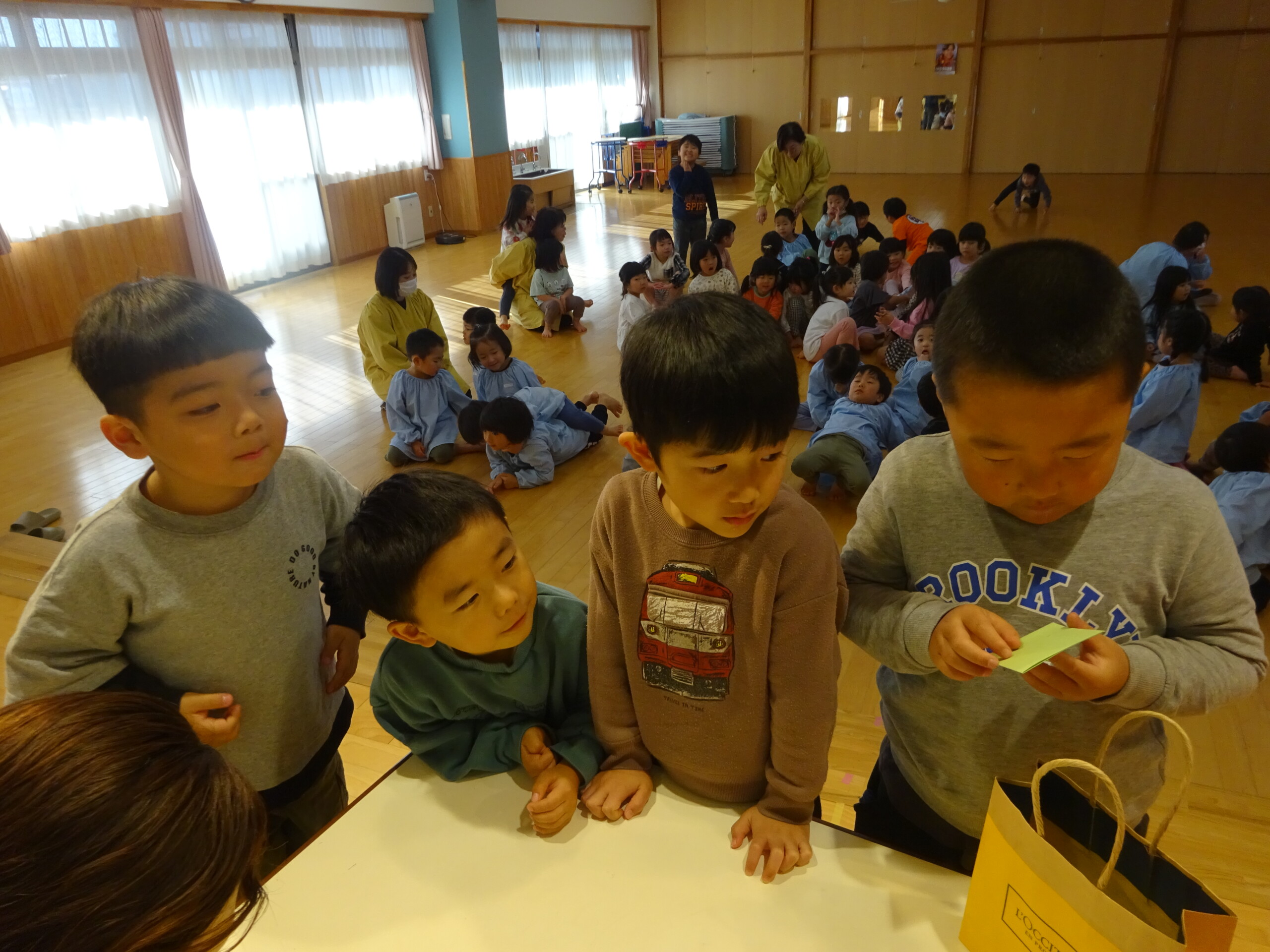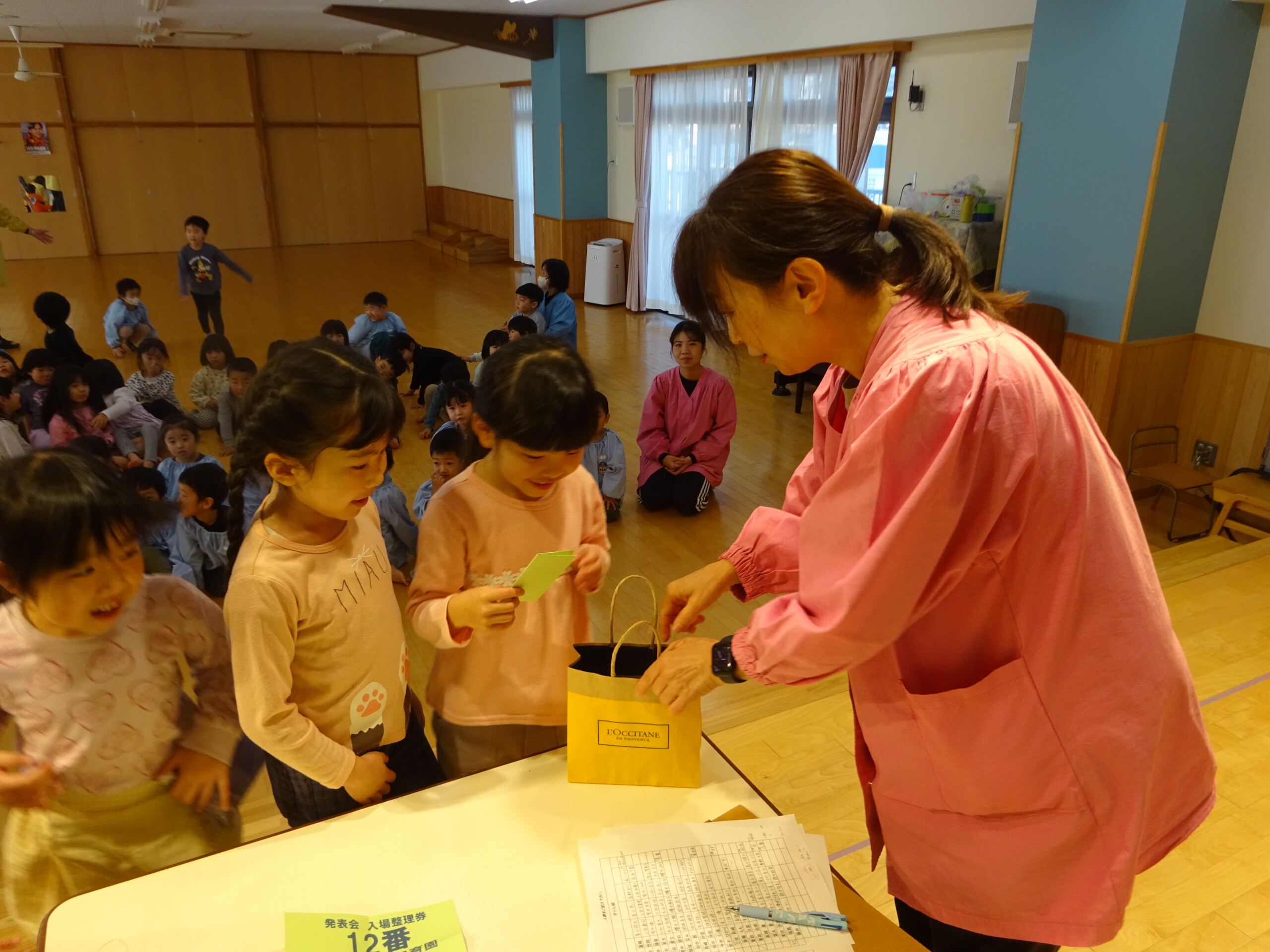 12月4日(木) しか組、くま組、きりん組さんがホールに集まり、発表会当日の保護者の皆さまの入場の順番を決めるくじを、子ども達に引いてもらいました。きょうだい児は、1枚のくじを仲良く一緒に引きました。保育士の説明を真剣に聞いていた子ども達は、並んで待っている間も興味津々でした。※お休みのお子さんの分は、主任が代理で引きました。 いよいよ発表会まであと2日です。当日は、子ども達を温かく見守っていただき、皆さまのご協力をよろしくお願いいたします。太田