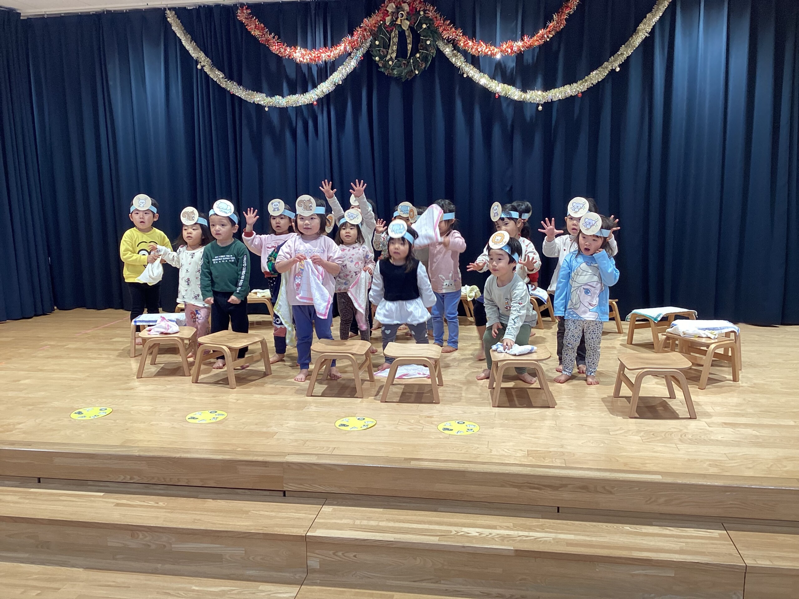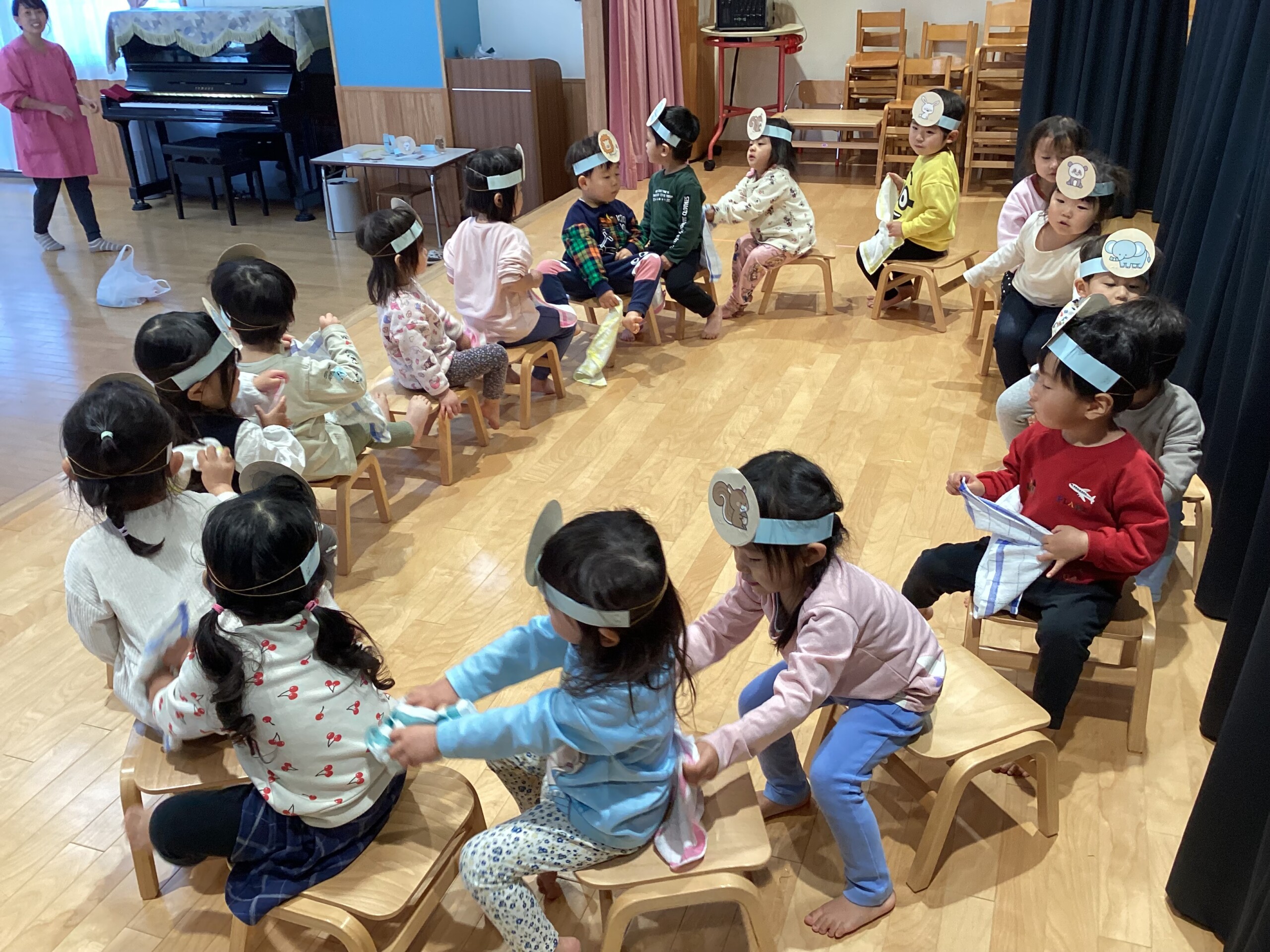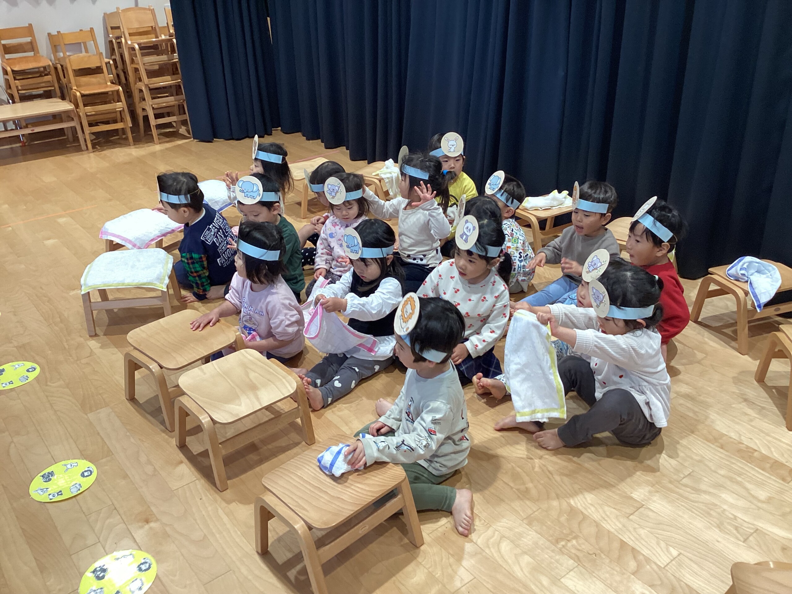 3階のみつばちホールの舞台で、「お風呂屋さんへ行こう」の劇遊びをしました。自分の役の動物のお面をかぶります。自分の動物の順番が来るまでちゃんと待って待機しています。呼ばれると嬉し恥ずかしそうに前に出てきて歌います。椅子に座ってみんなで背中の洗いっこをして最後はお風呂に入ります。1から10まで数えて「あーいーきもち!」と言いました。みんなでお風呂屋さんの世界に入ってお話を楽しみました。そしてクラスのお友達のひとりが今日で最後となります。みんなにタッチをしてまわり「頑張ってね。」「ありがとう。」と言い合いました。寂しい、、と涙ぐむ子の姿もありました。みんなと遊んでくれてありがとう。ずっと応援しています。 石井