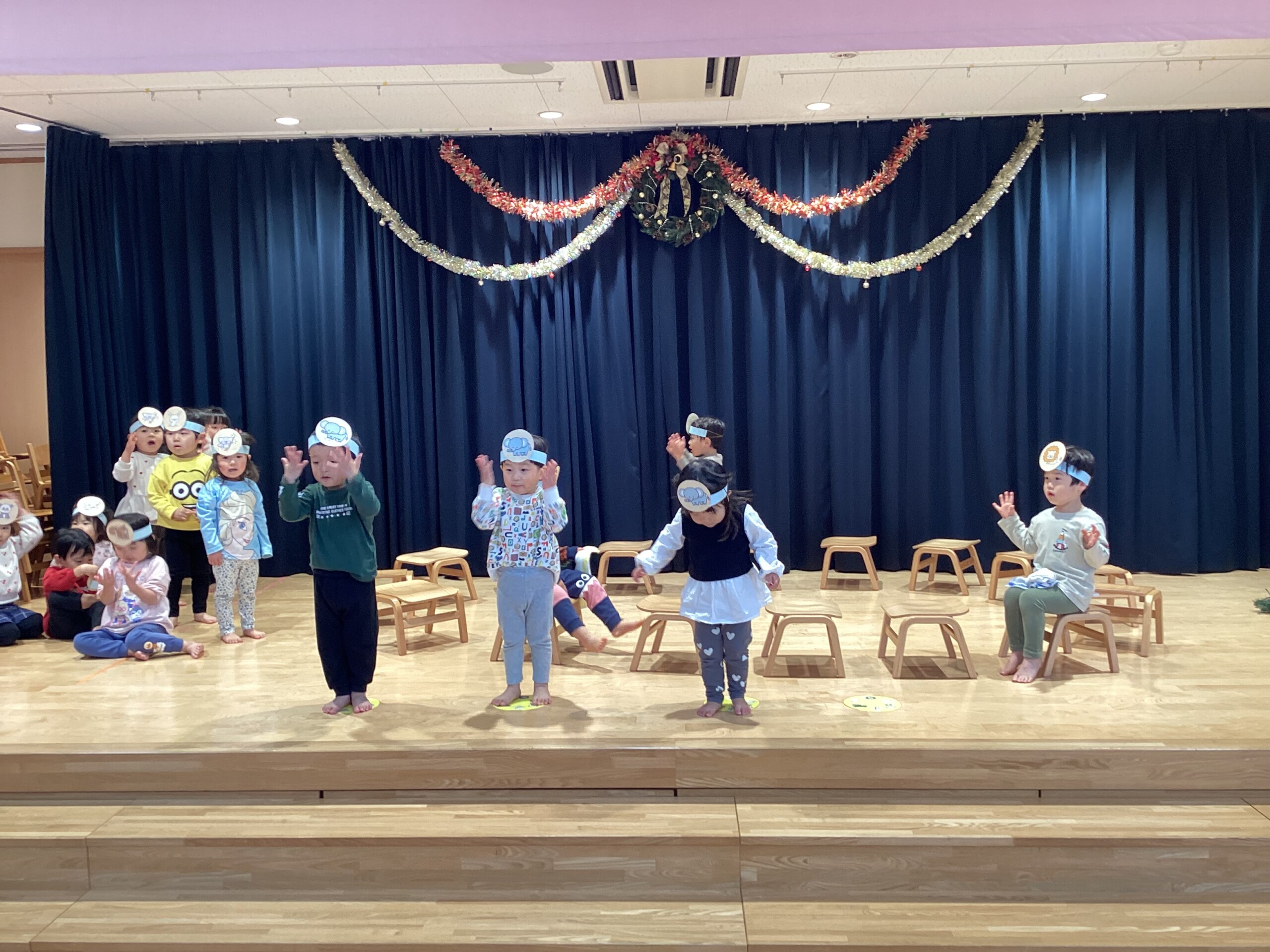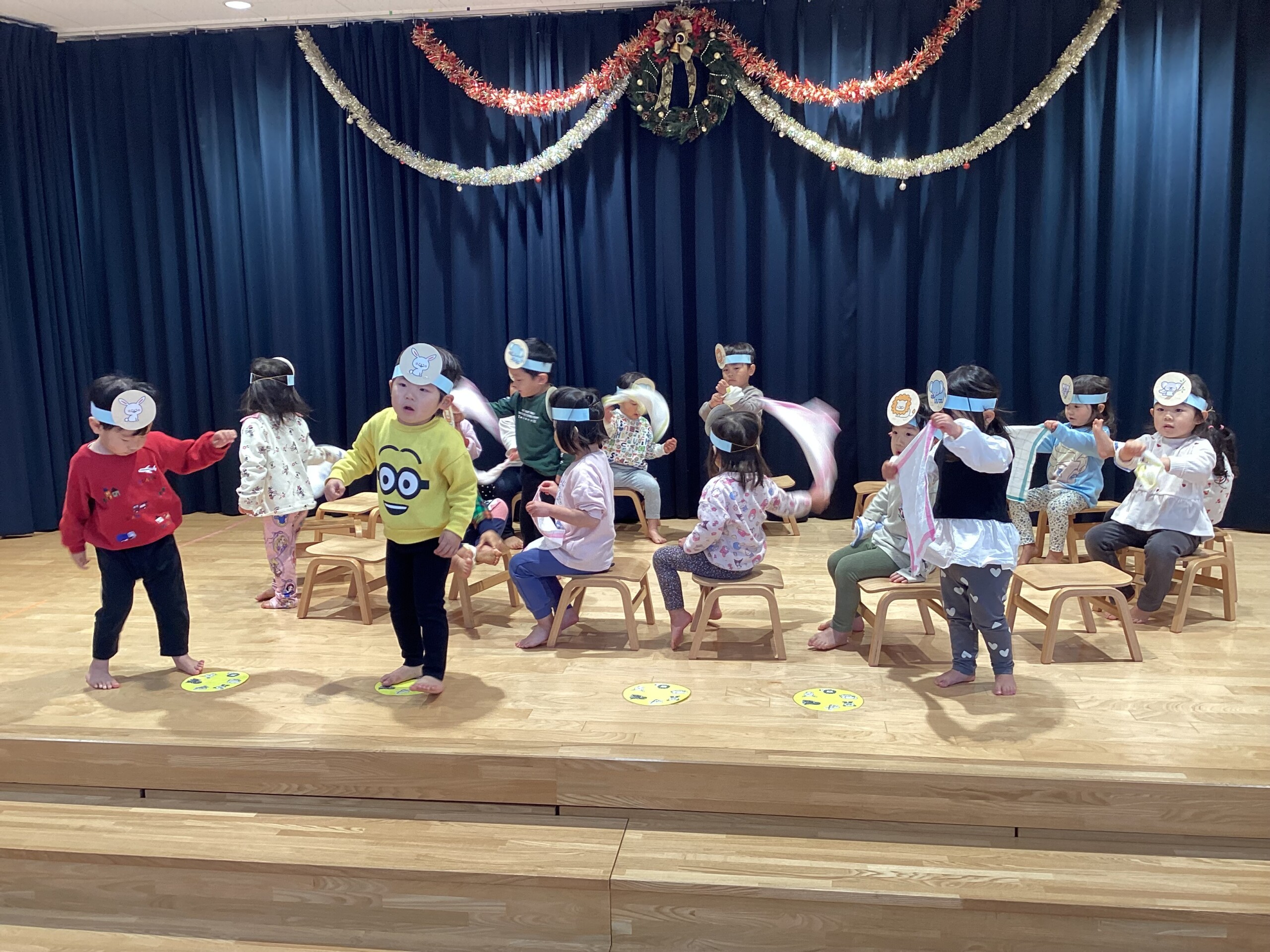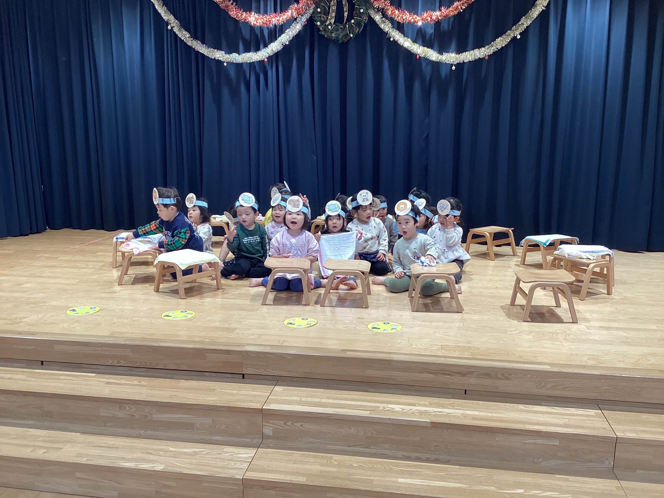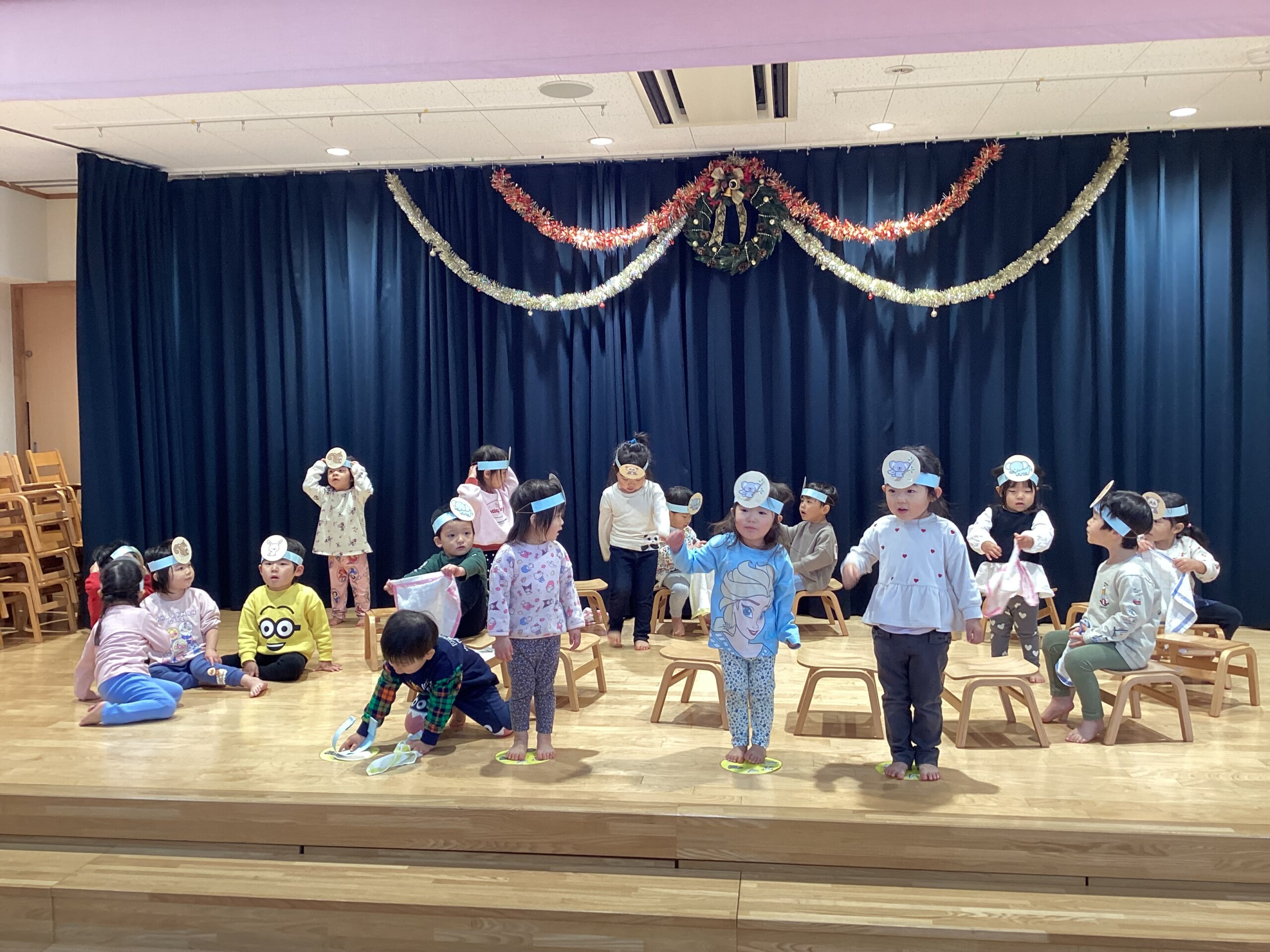 3階のみつばちホールの舞台で、「お風呂屋さんへ行こう」の劇遊びをしました。自分の役の動物のお面をかぶります。自分の動物の順番が来るまでちゃんと待って待機しています。呼ばれると嬉し恥ずかしそうに前に出てきて歌います。椅子に座ってみんなで背中の洗いっこをして最後はお風呂に入ります。1から10まで数えて「あーいーきもち!」と言いました。みんなでお風呂屋さんの世界に入ってお話を楽しみました。そしてクラスのお友達のひとりが今日で最後となります。みんなにタッチをしてまわり「頑張ってね。」「ありがとう。」と言い合いました。寂しい、、と涙ぐむ子の姿もありました。みんなと遊んでくれてありがとう。ずっと応援しています。 石井