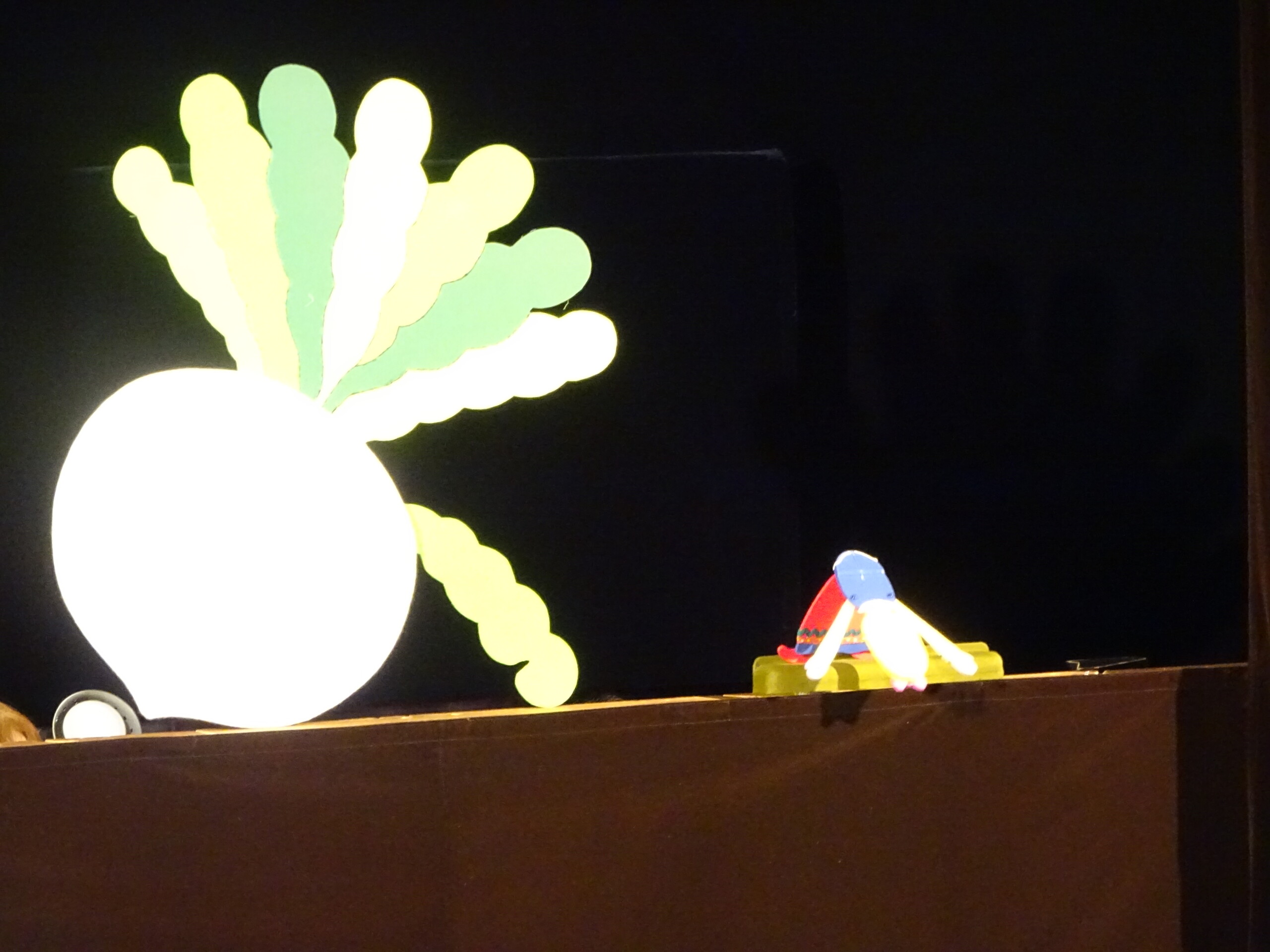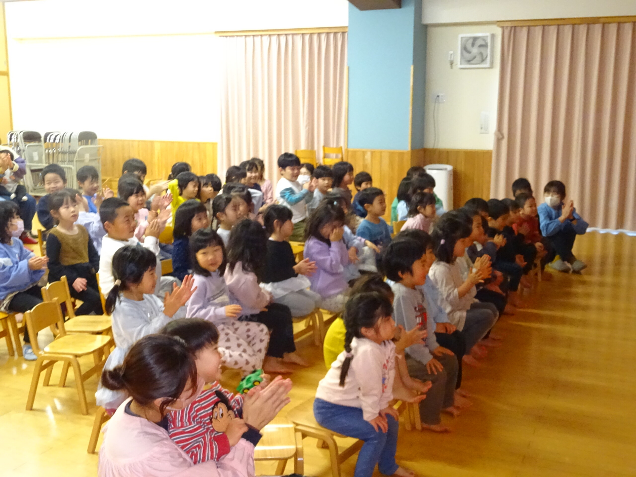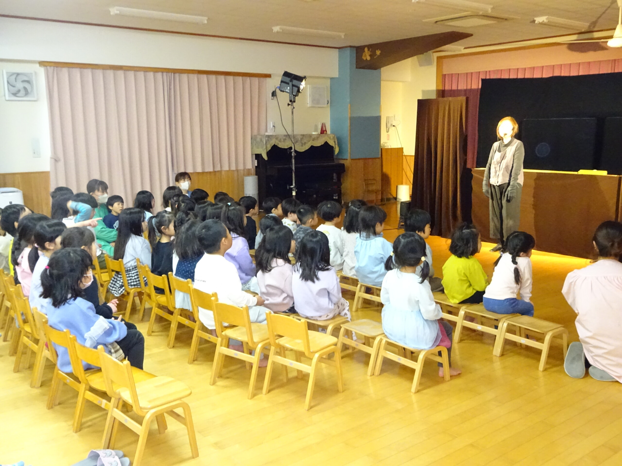 1月30日(金) みつばちホールで、人形劇団『パンタルカ』の公演がありました。未就園児さんも参加していただき、1歳児~5歳児クラスのお友達が集まりました。公演は3部構成となっていて、『おおきなかぶ』『歌の上手なにわとりさん』『こびとのくつや』を楽しみました。人形劇が始まると、人形の動きや繰り返しの動きに笑いが起きたり、音楽に合わせて体を左右に揺らしたり、かぶが抜けると拍手をして喜んだり…。『こびとのくつや』のお話では、こびとが作った靴が次から次へと出てきて、ひとつひとつの小道具にも興味津々の子ども達でした。パンタルカさん、楽しい時間をありがとうございました。太田