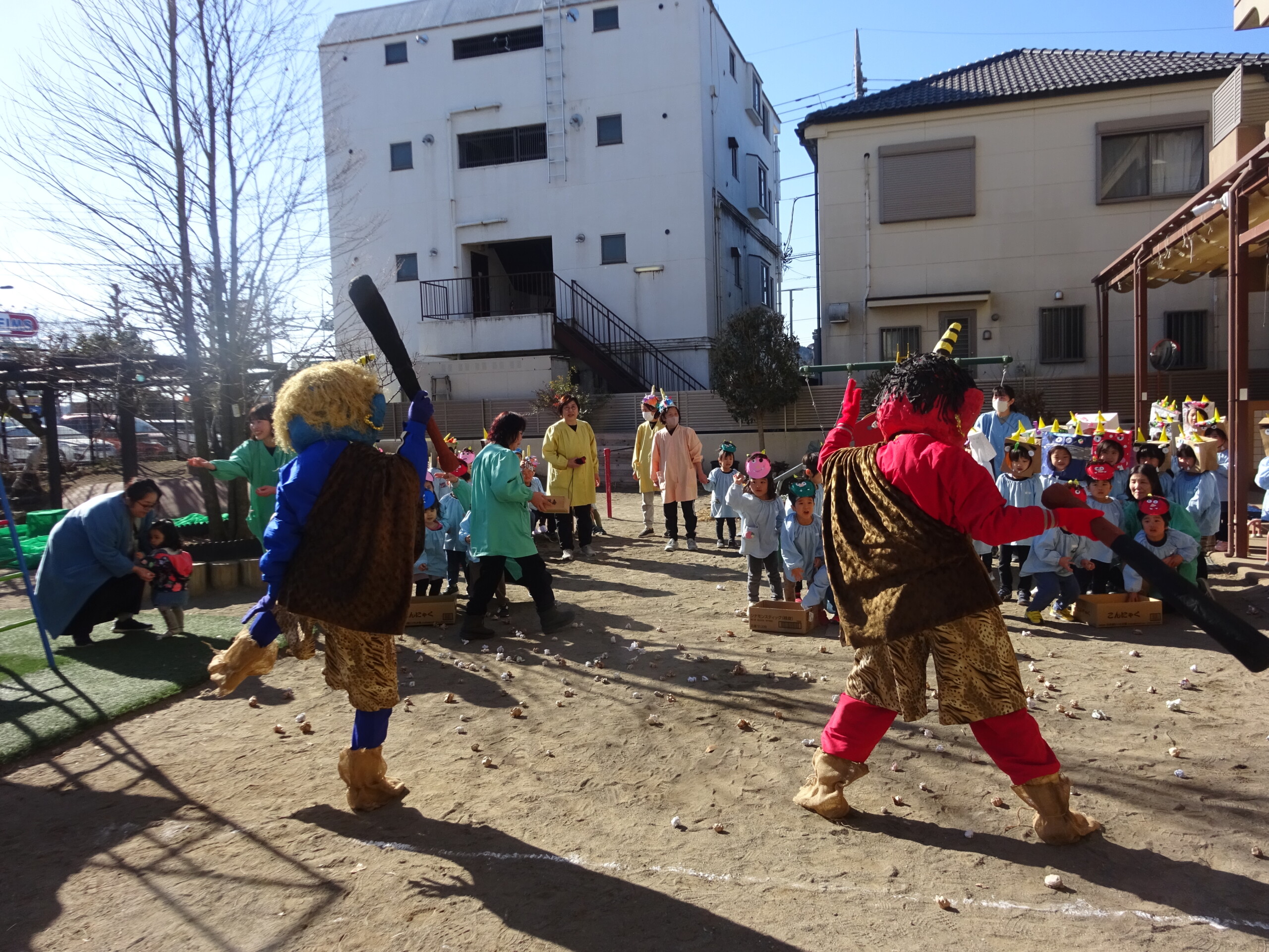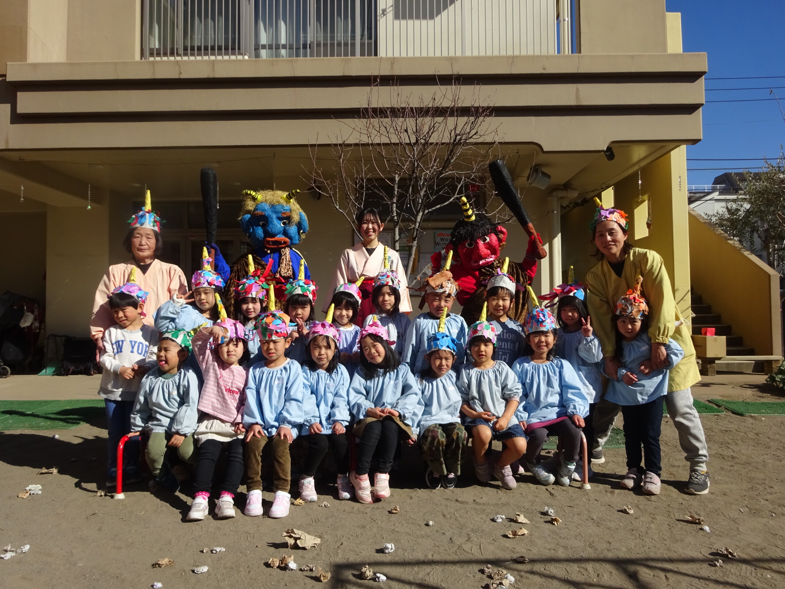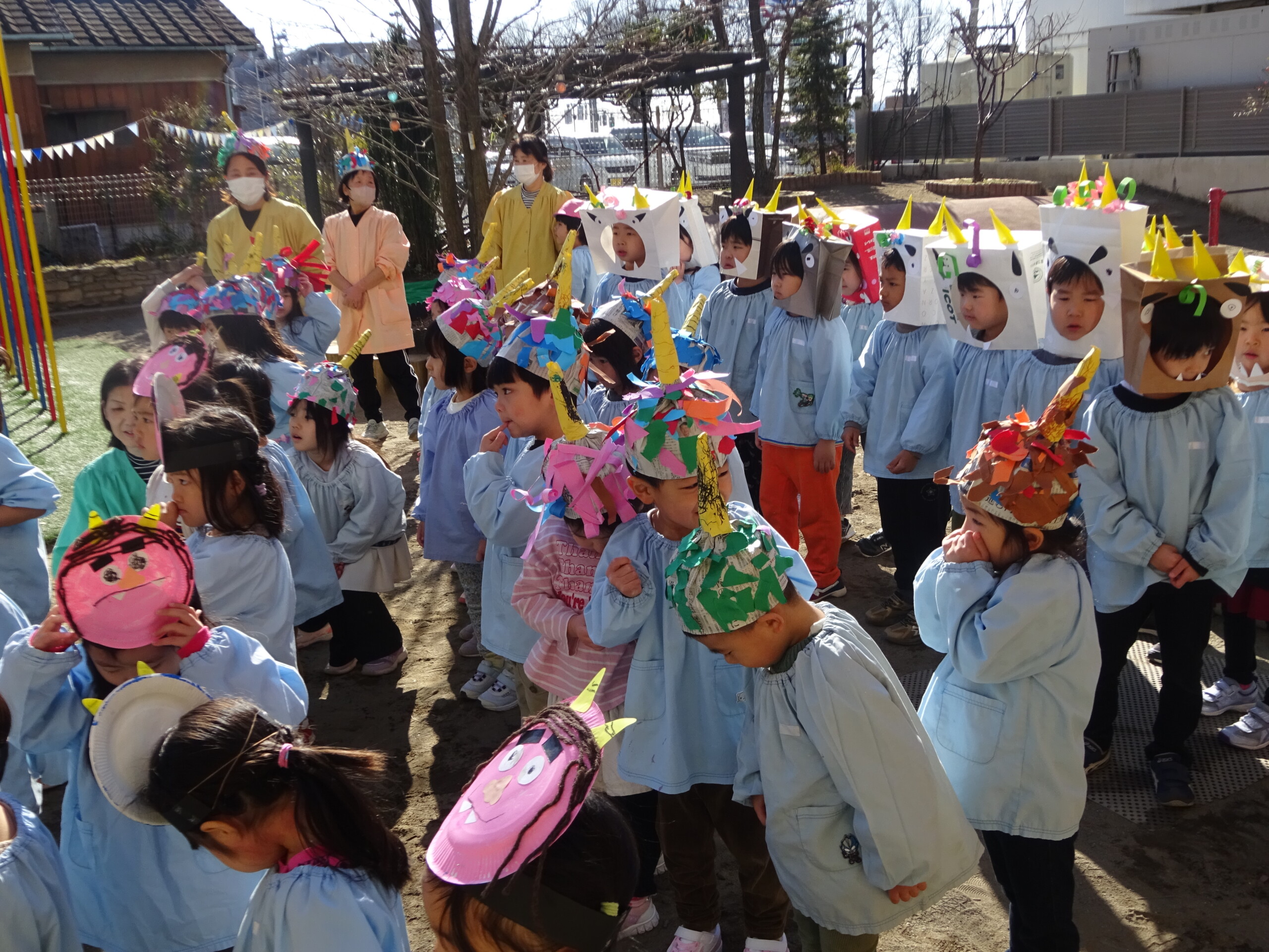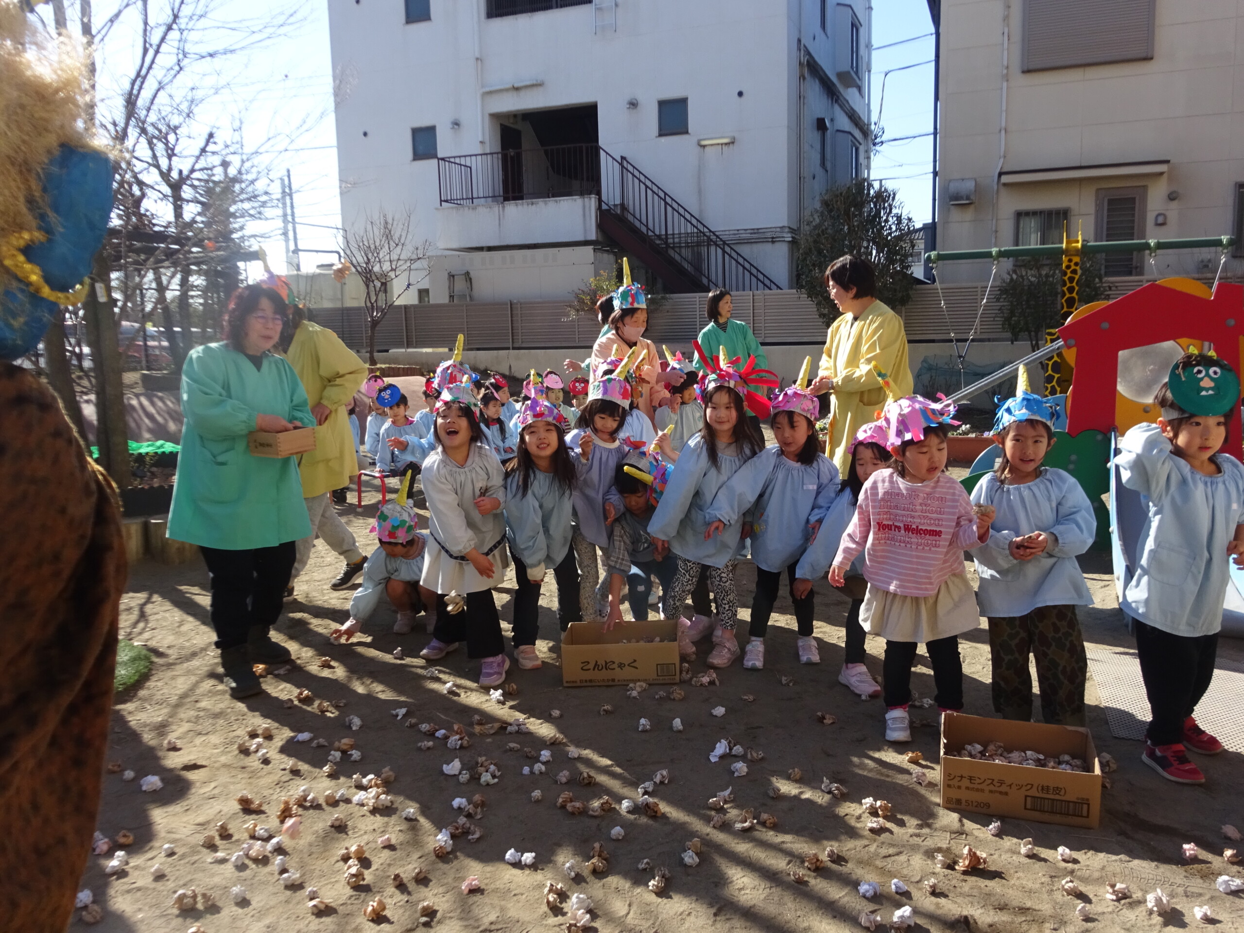 2月2日(月) 園庭で、節分の集いがありました。未就園児さんも参加してくださいました。しか組、くま組、きりん組さんは、手作りの鬼のお面をして集まりました。豆まきに使う“豆”も子ども達の手作りで、今年は紙を小さく丸めて作りました。「鬼は外!福は内!鬼の目ぶっつぶせー‼」(昔からの青梅のかけ声だそうです。)と、園長先生から豆のまき方を教えてもらい、豆まきの歌もうたうと、いよいよ鬼の登場です。ドーン!ドーン!という太鼓の音で鬼が登場すると、後退りする子や、今にも泣いてしまいそうな子もいましたが、勇気を出して鬼に向かって豆まきをしました。最後には、福の神が幸せを運んでくれました。太田