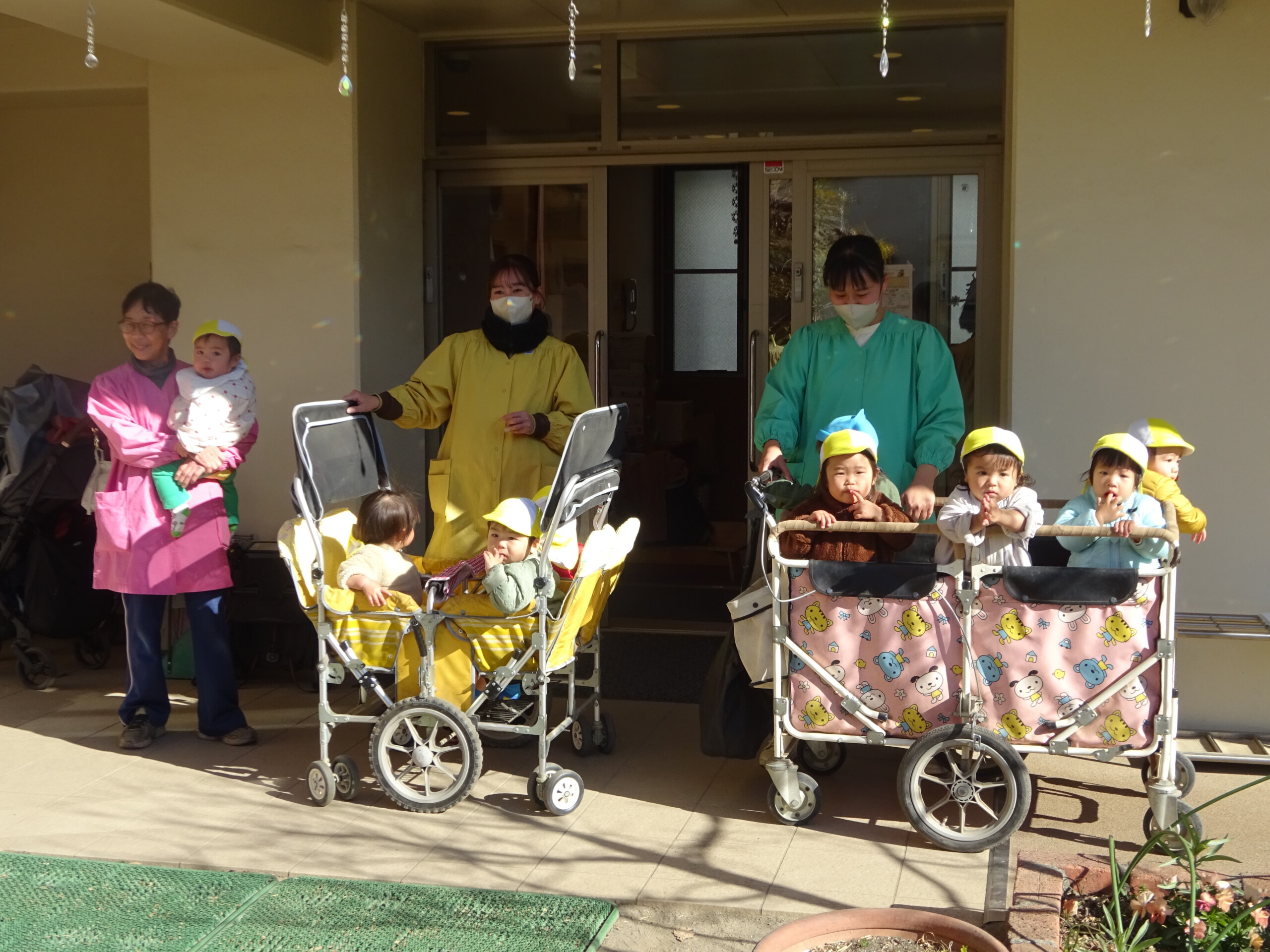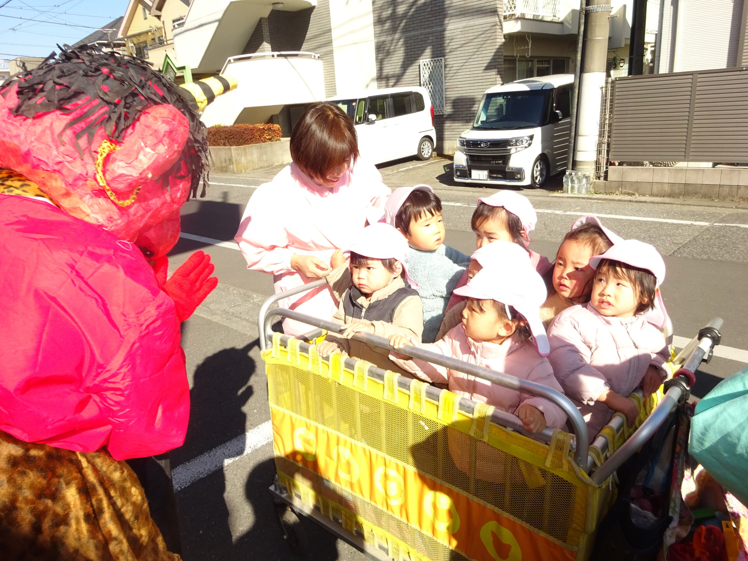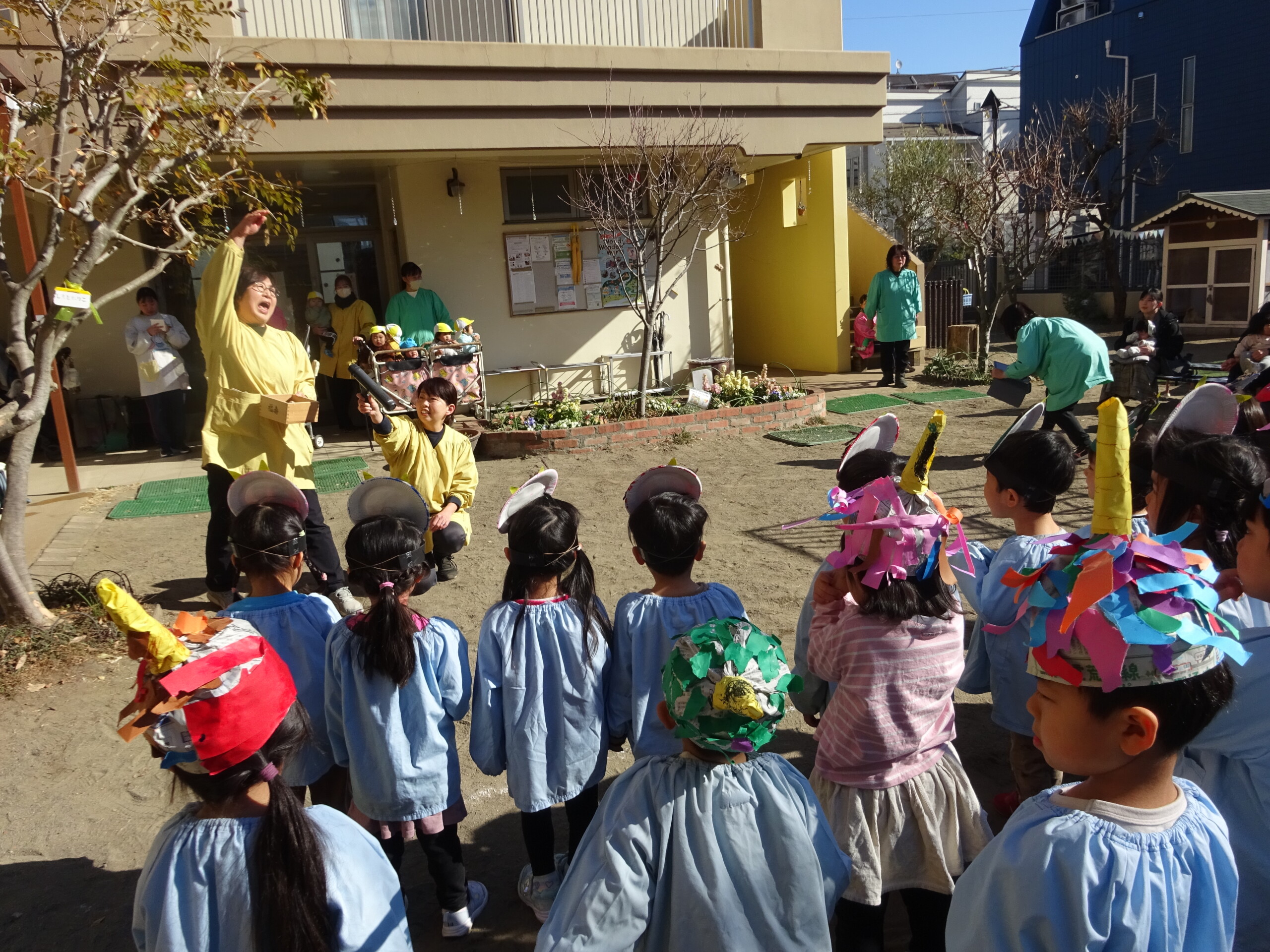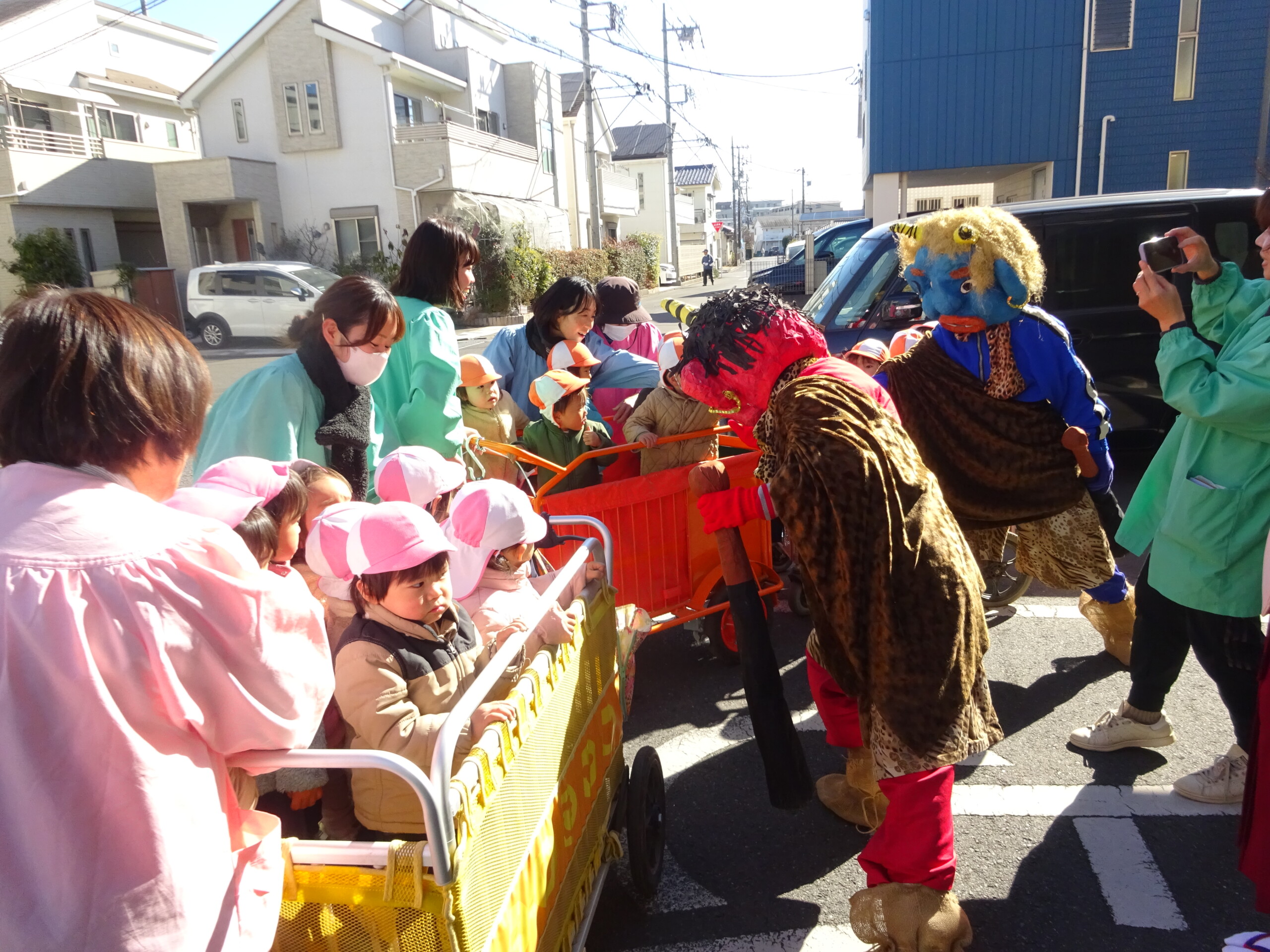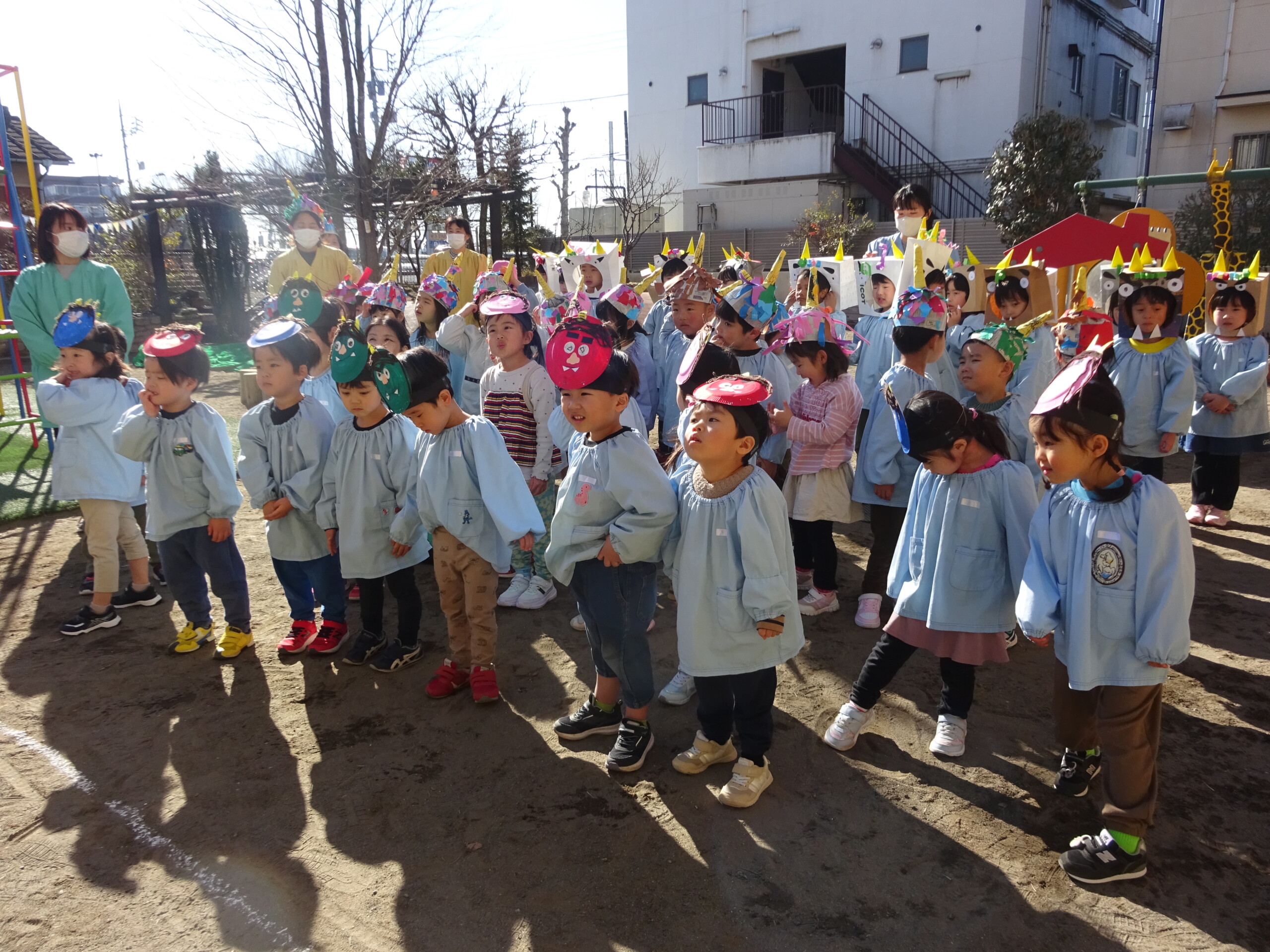 2月2日(月) 園庭で、節分の集いがありました。未就園児さんも参加してくださいました。しか組、くま組、きりん組さんは、手作りの鬼のお面をして集まりました。豆まきに使う“豆”も子ども達の手作りで、今年は紙を小さく丸めて作りました。「鬼は外!福は内!鬼の目ぶっつぶせー‼」(昔からの青梅のかけ声だそうです。)と、園長先生から豆のまき方を教えてもらい、豆まきの歌もうたうと、いよいよ鬼の登場です。ドーン!ドーン!という太鼓の音で鬼が登場すると、後退りする子や、今にも泣いてしまいそうな子もいましたが、勇気を出して鬼に向かって豆まきをしました。最後には、福の神が幸せを運んでくれました。太田