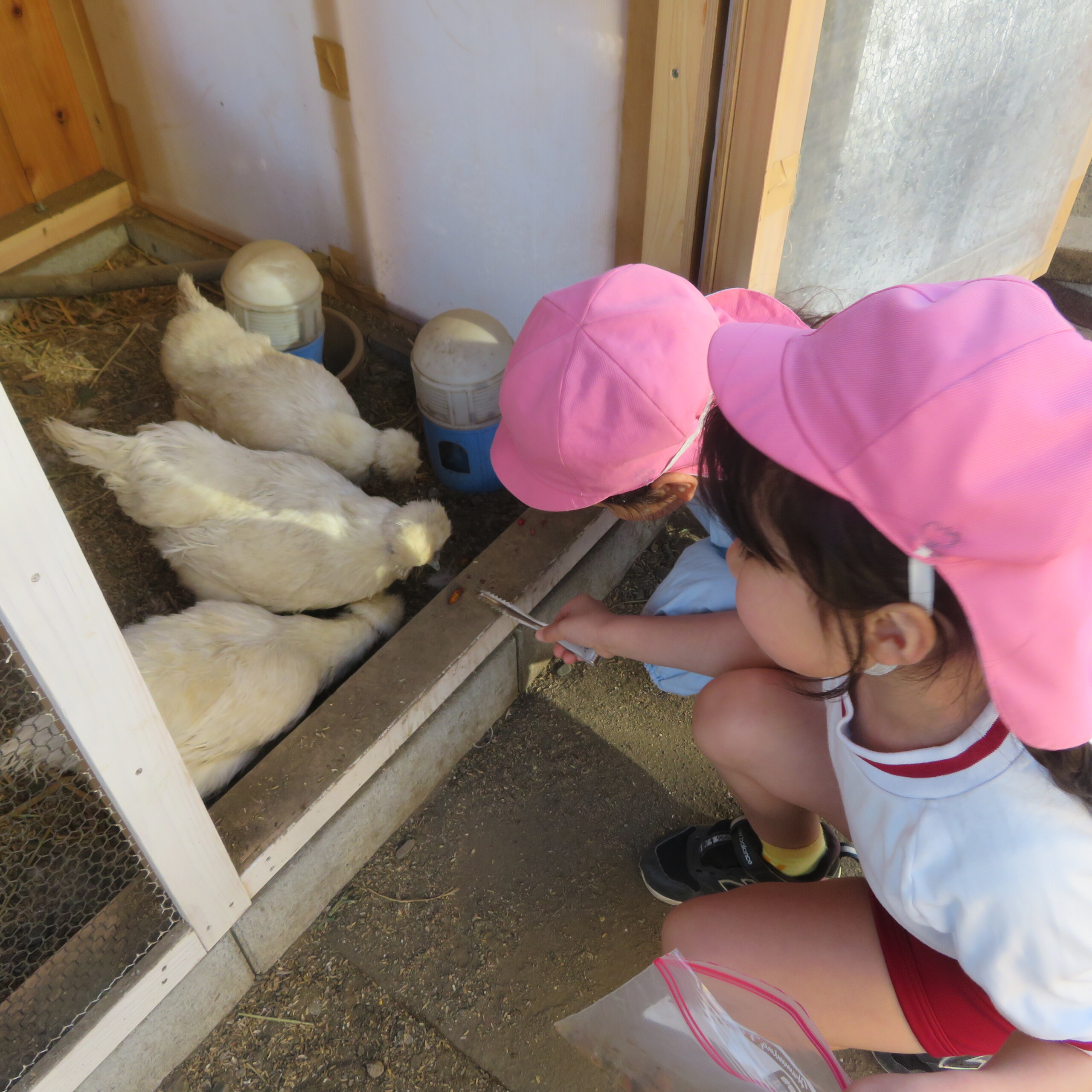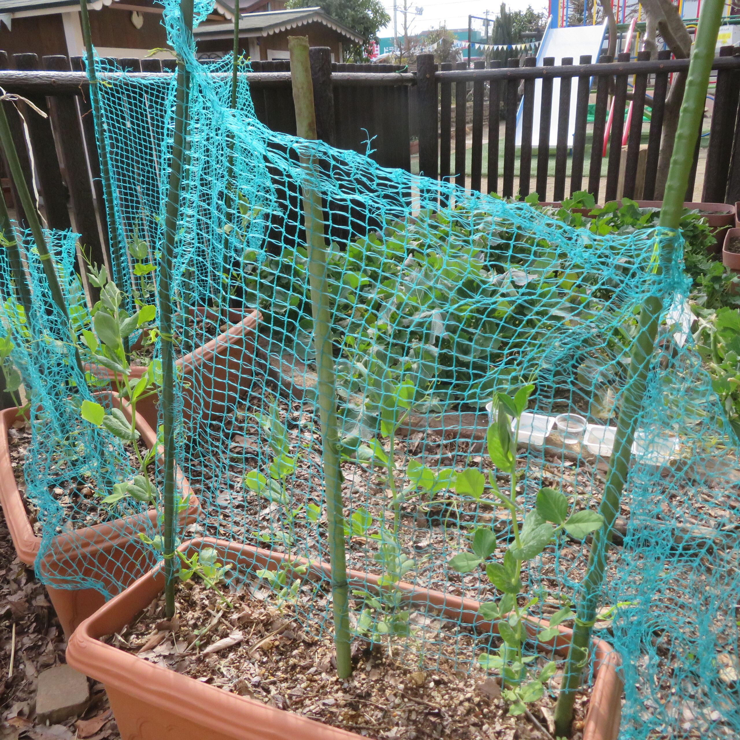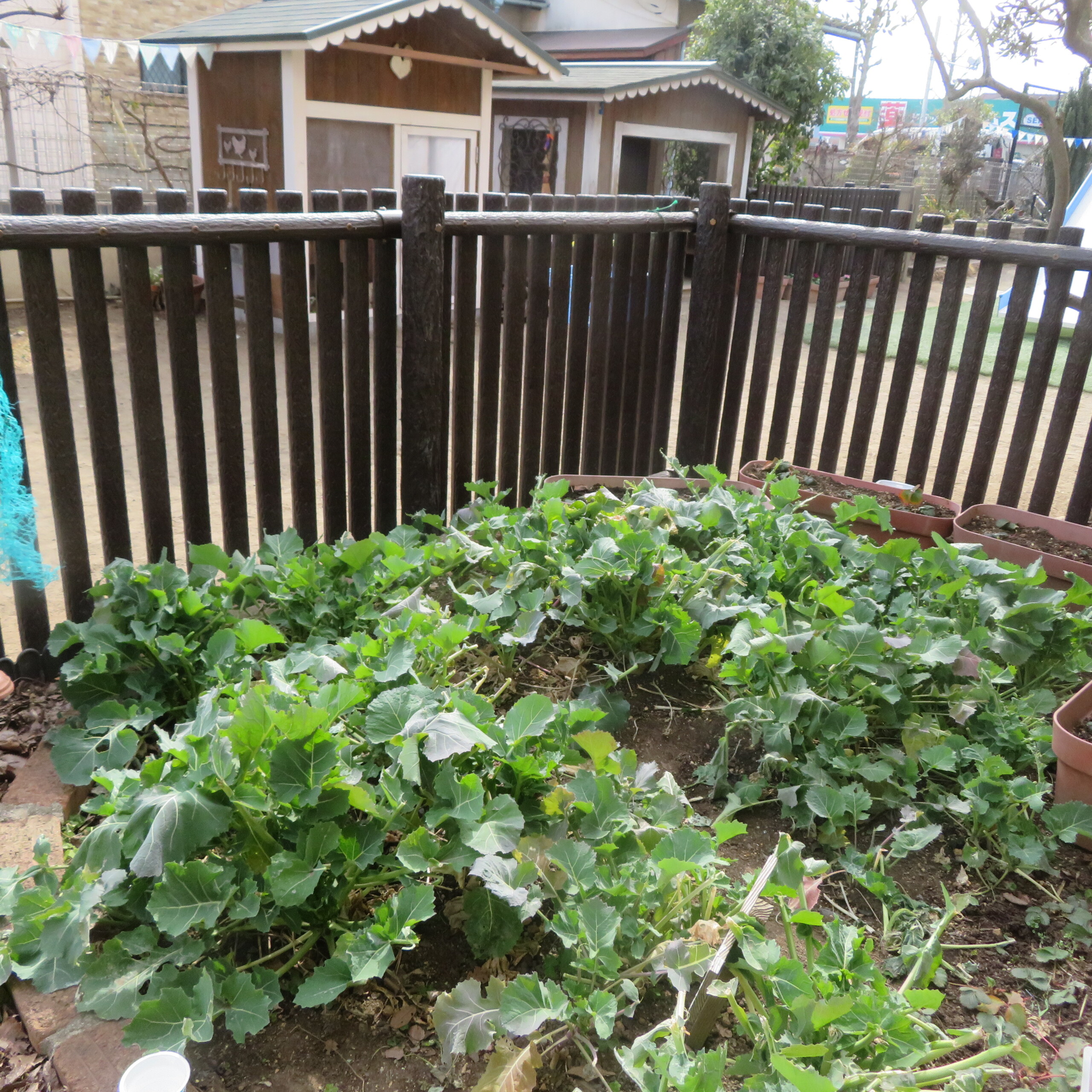 すくわくで建てた柵の中の畑では、のらぼう菜とイチゴとスナップエンドウを育てています。のらぼうは烏骨鶏の餌として、子どもたちが毎日ちぎって烏骨鶏に食べさせてくれます。スナップエンドウは、春になり今の4歳児が5歳児になって、実を付けたら収獲します。新鮮なスナップエンドウはとっても美味しいです。烏骨鶏のお世話は、5歳児が順番で行い、卵も順番に持ちかえっています。烏骨鶏の小屋の下に撒いてあるモミガラも土に戻すと、良い土になります。園長
