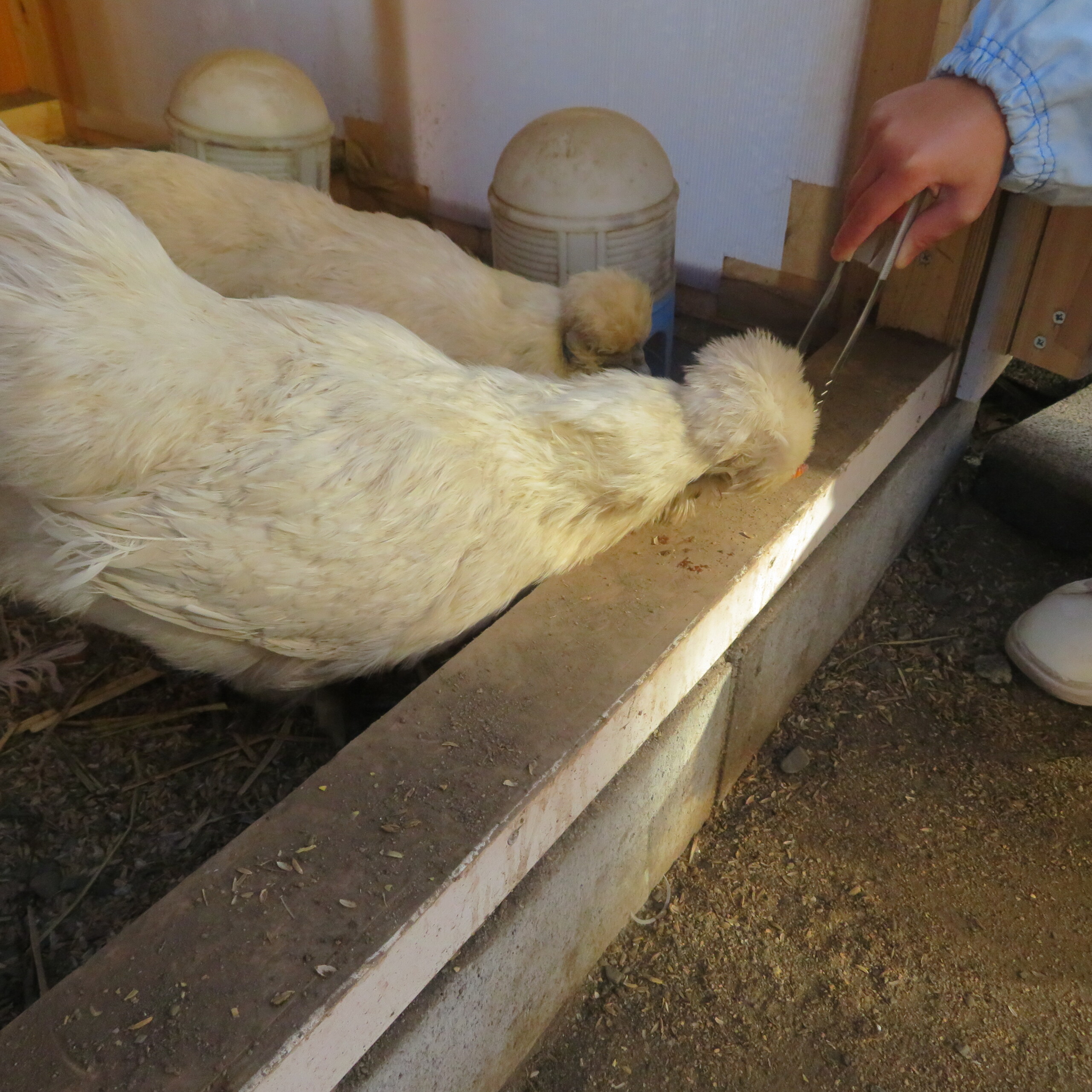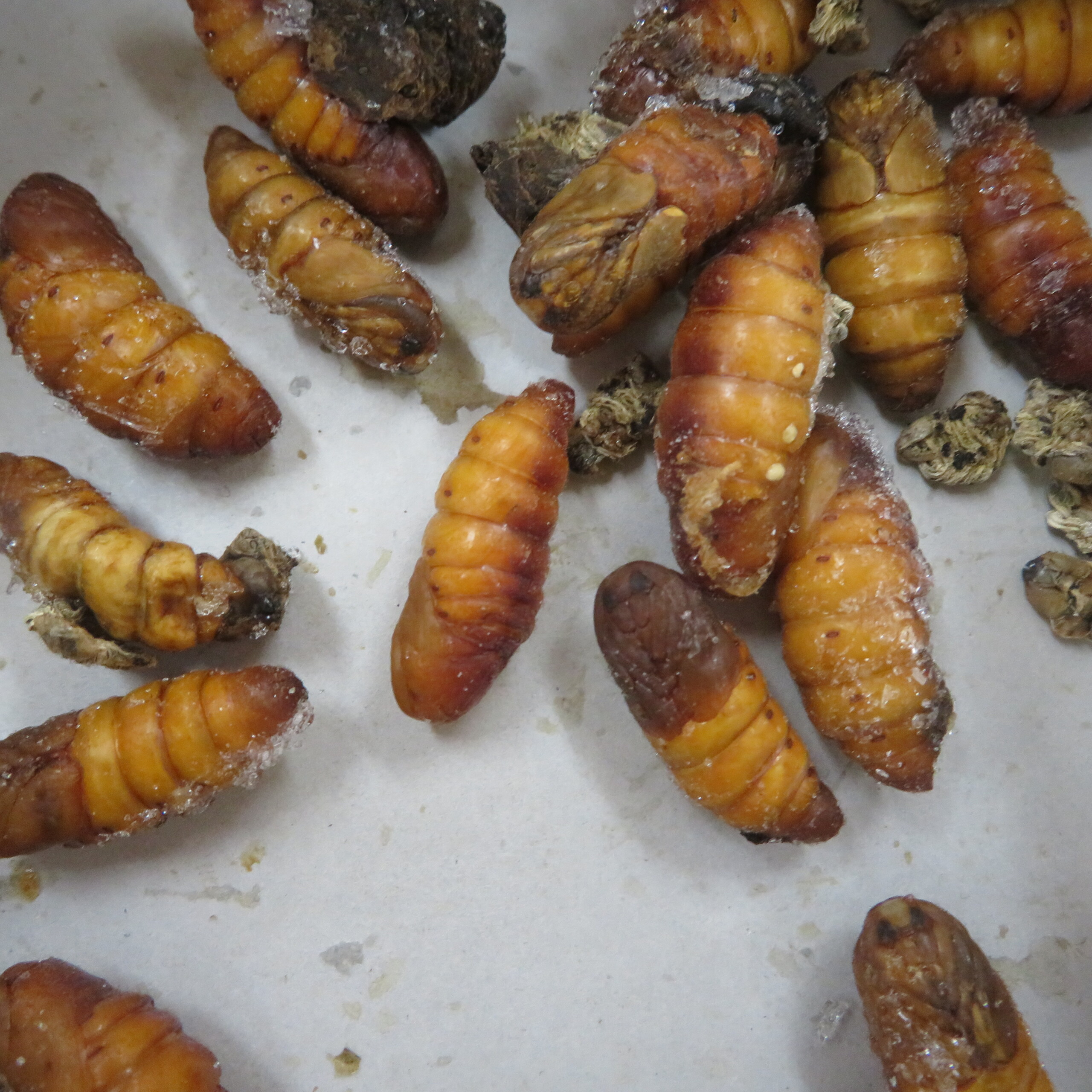 上の写真は蚕の蛹です。烏骨鶏の餌にしています。毎年蚕を300匹以上育てていますが、蚕が成長しきると口から絹糸をはき繭を作り、その中で蛹になります。繭をそのままにしておくと、蛹からカイコガに完全変態し、繭を破って出てきてしまい、カイコガだらけになり、繭も利用できなくなってしまいます。そのためいい繭20個くらい残しあとは冷凍しています。いい繭から出てきたカイコガは次の世代に残していきます。冷凍した繭は、中から蛹を取り出し、烏骨鶏の餌にしています。人間が食べても大丈夫です。魚類も食べます。昔父親と一緒に鯉釣り用の餌を作りました。蒸かしたさつま芋に、魚粉やすりおろしにんにくを練り込んで固めてサイコロ状に切って使いました。蚕の蛹を混ぜ込めばもっと釣れると考えています。そんな訳で蚕の飼育は子どもたちの良い経験になり、糞は畑の肥料になり、捨てるところは何もありません。烏骨鶏も栄養たっぷりで健康な卵を産んでくれます。園長
