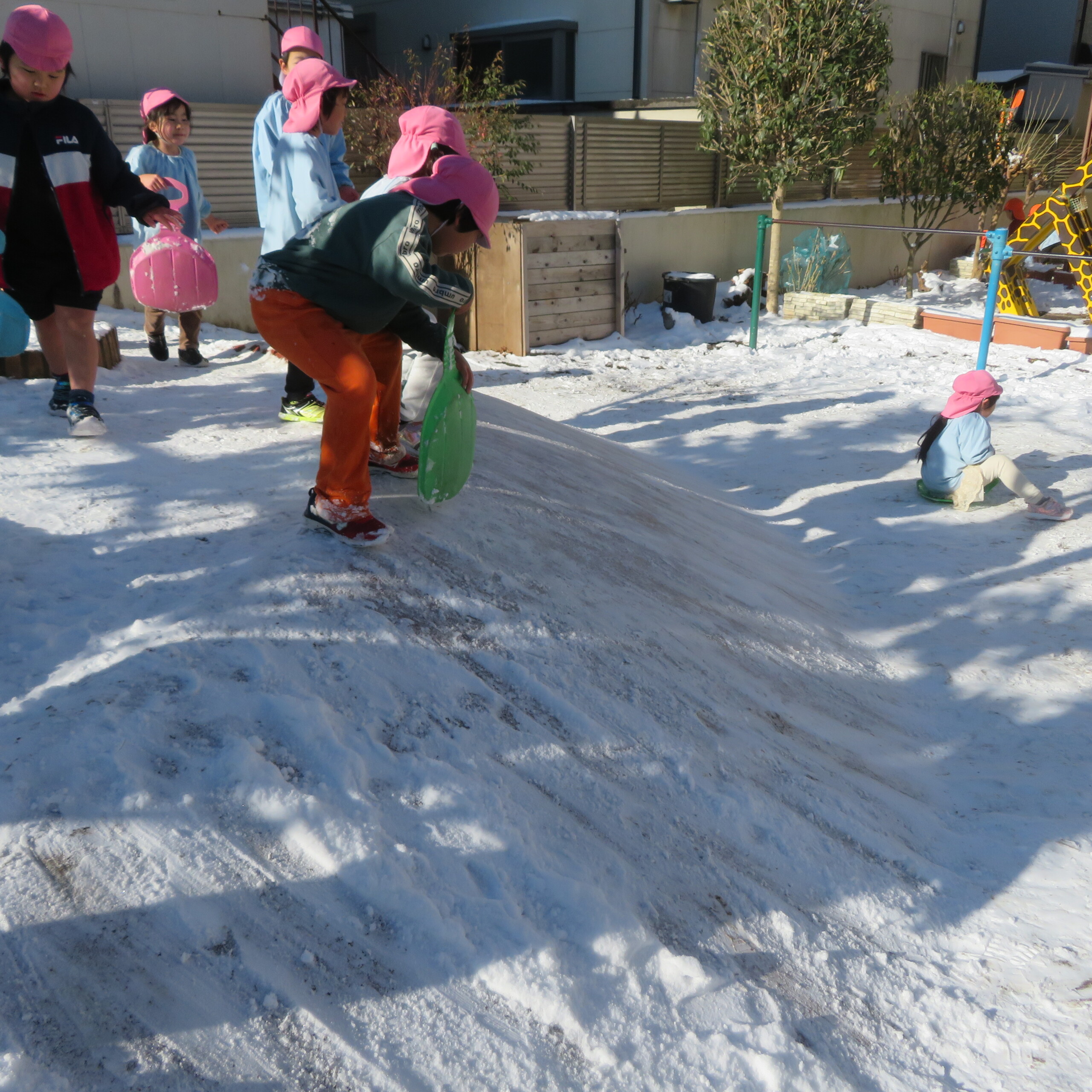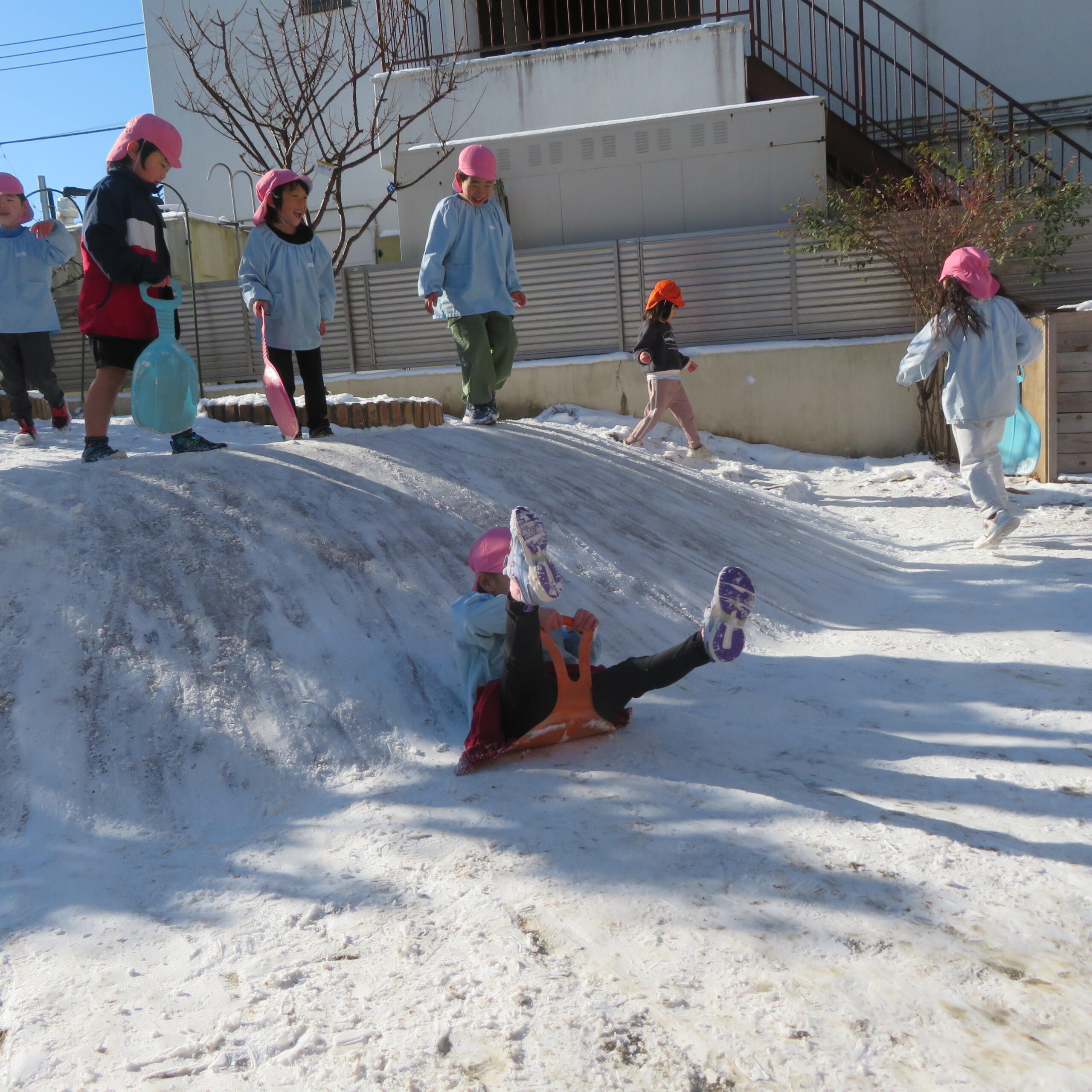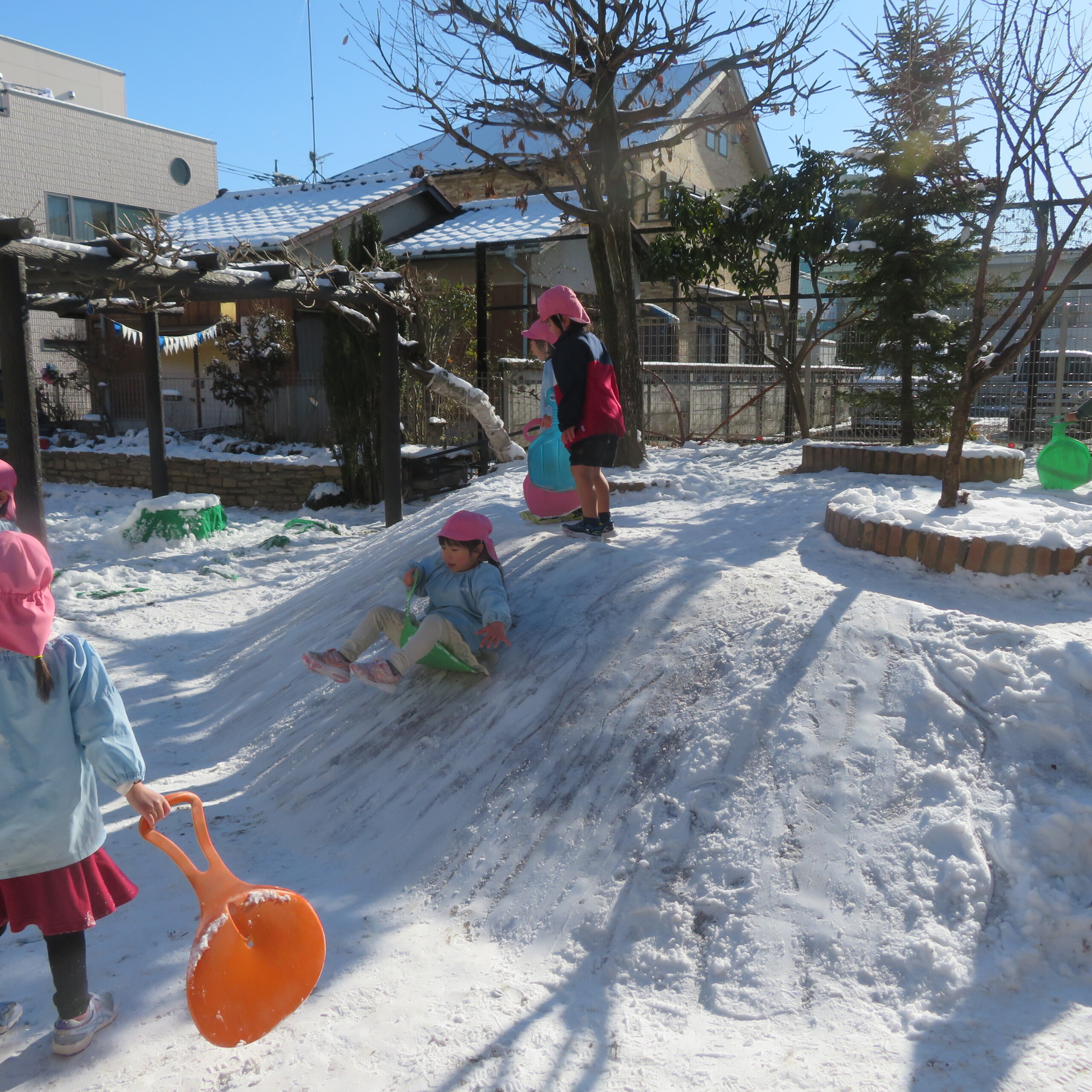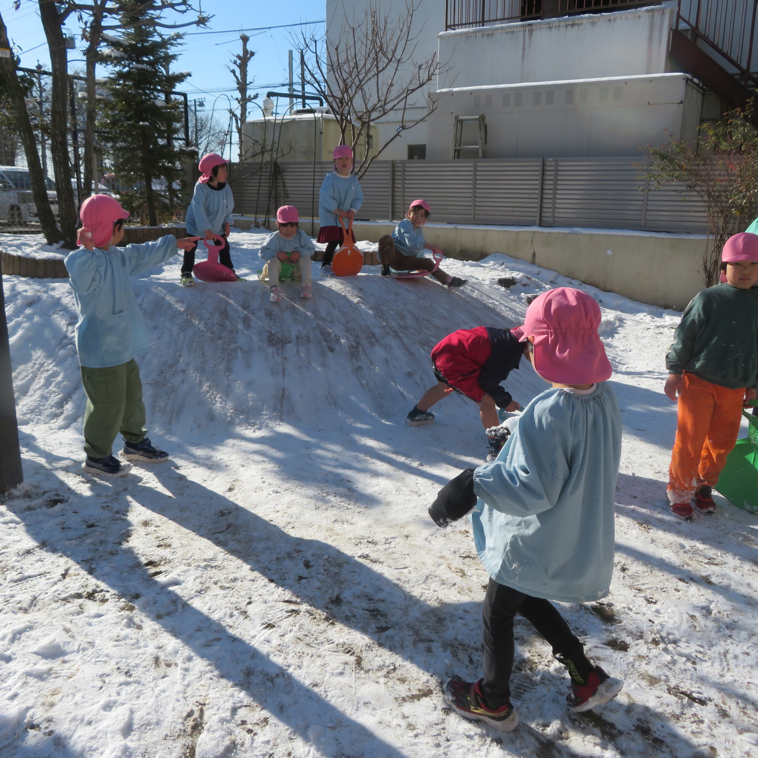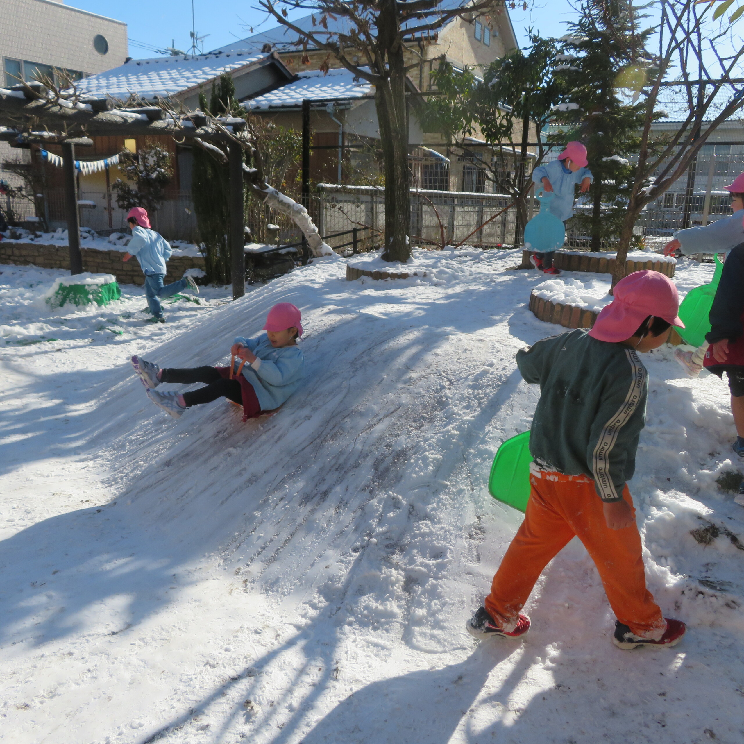 久々の雪と低温で朝のうちは雪遊びができました。小山からのそり滑りが一番人気で、歓声が上がっていました。園長