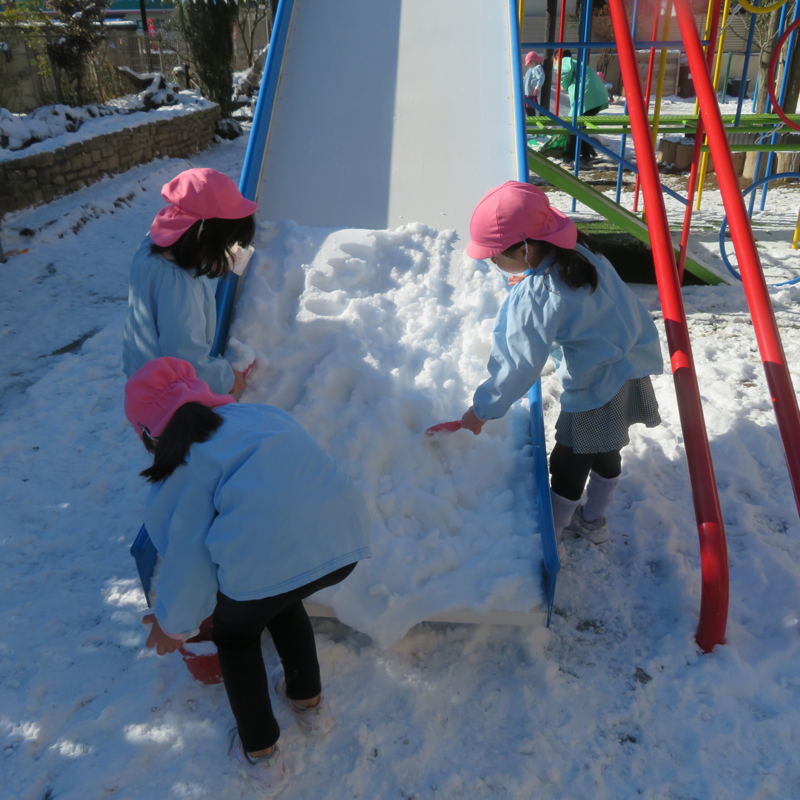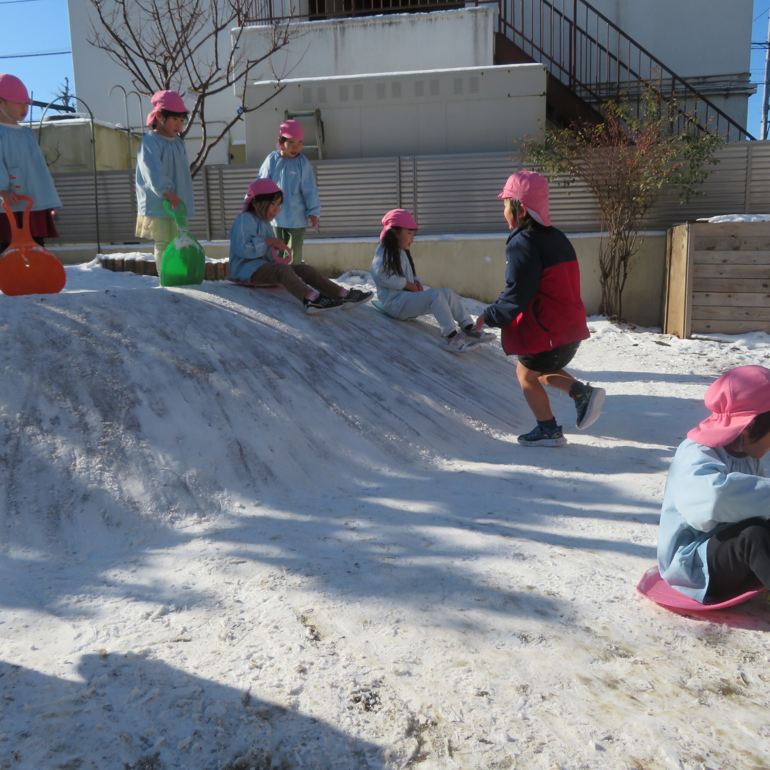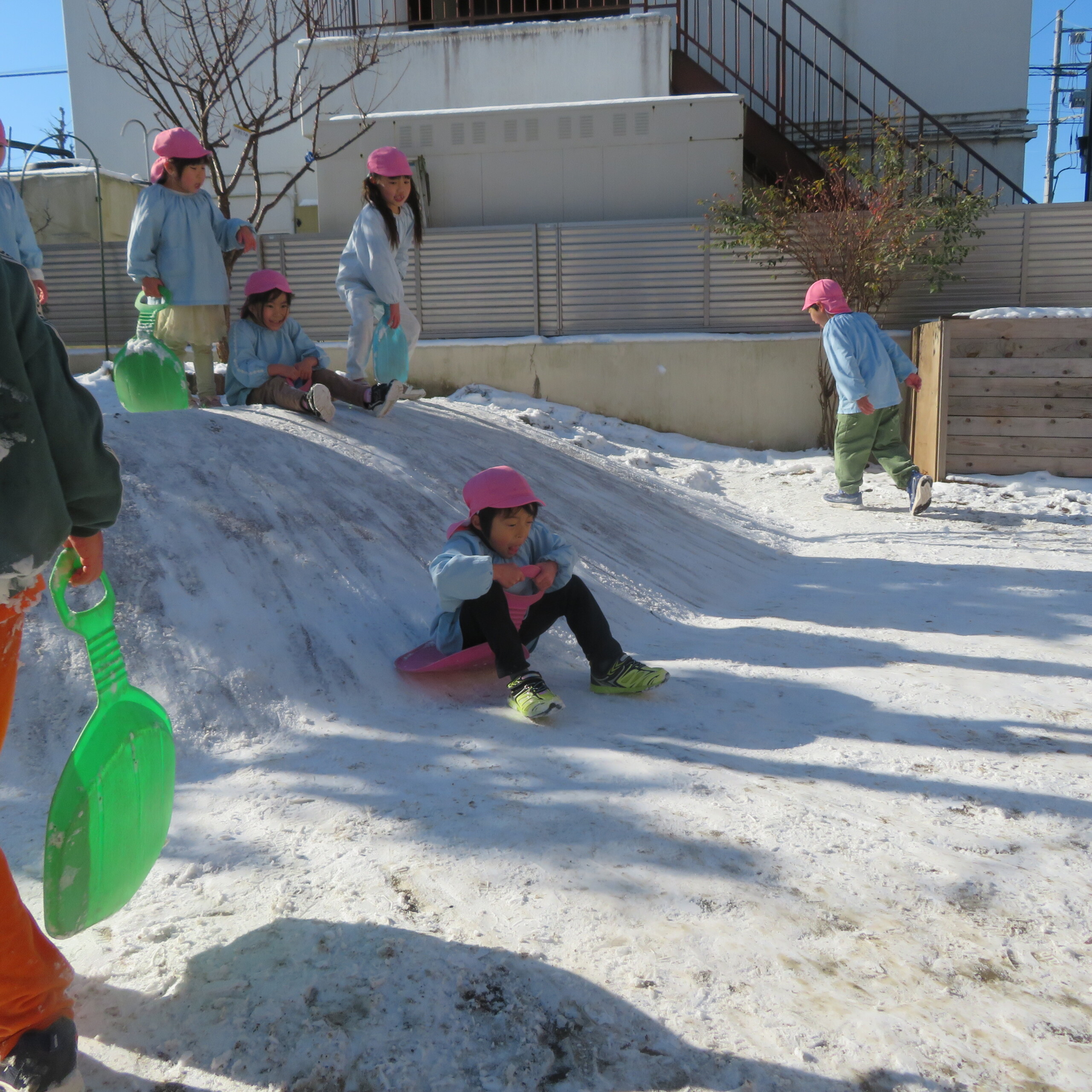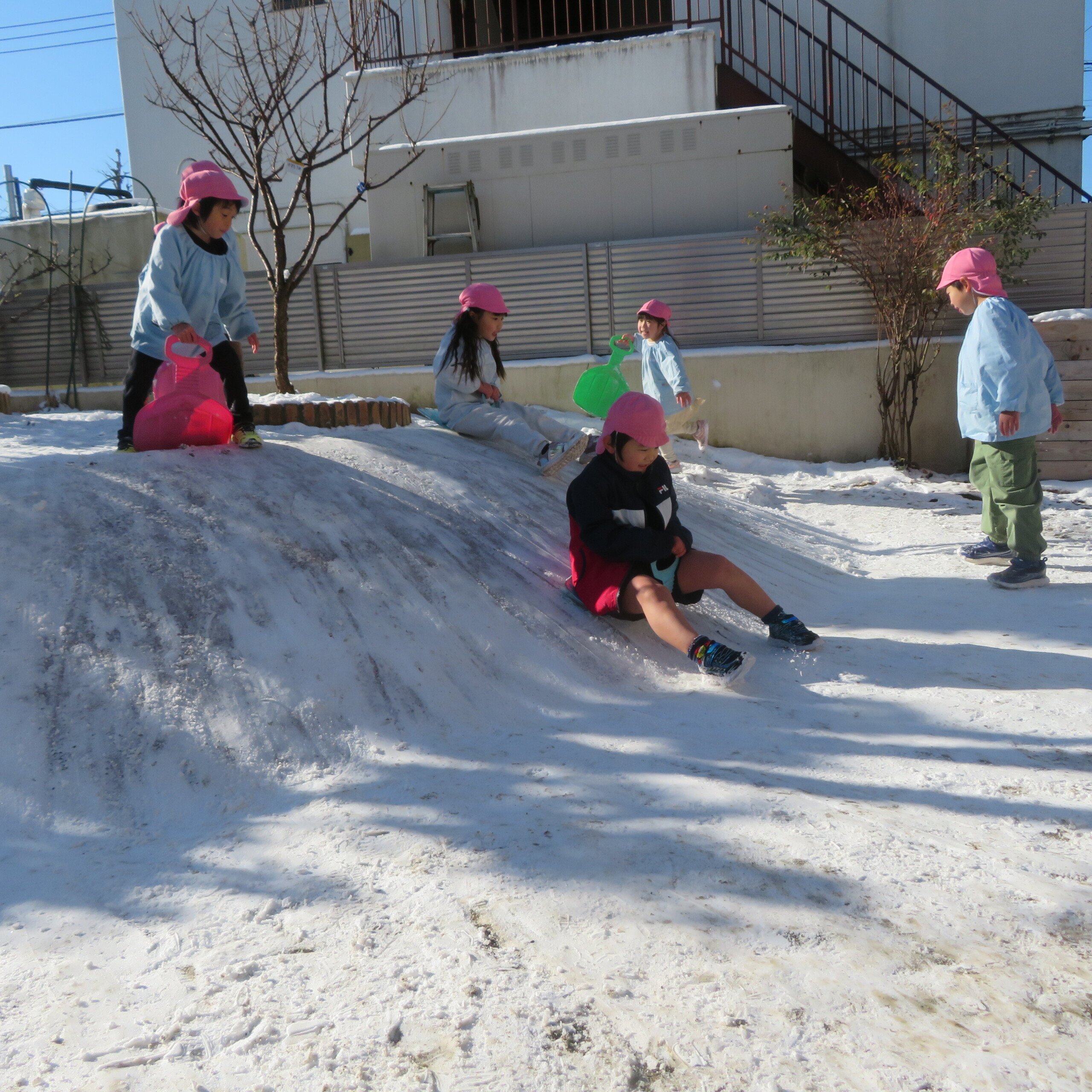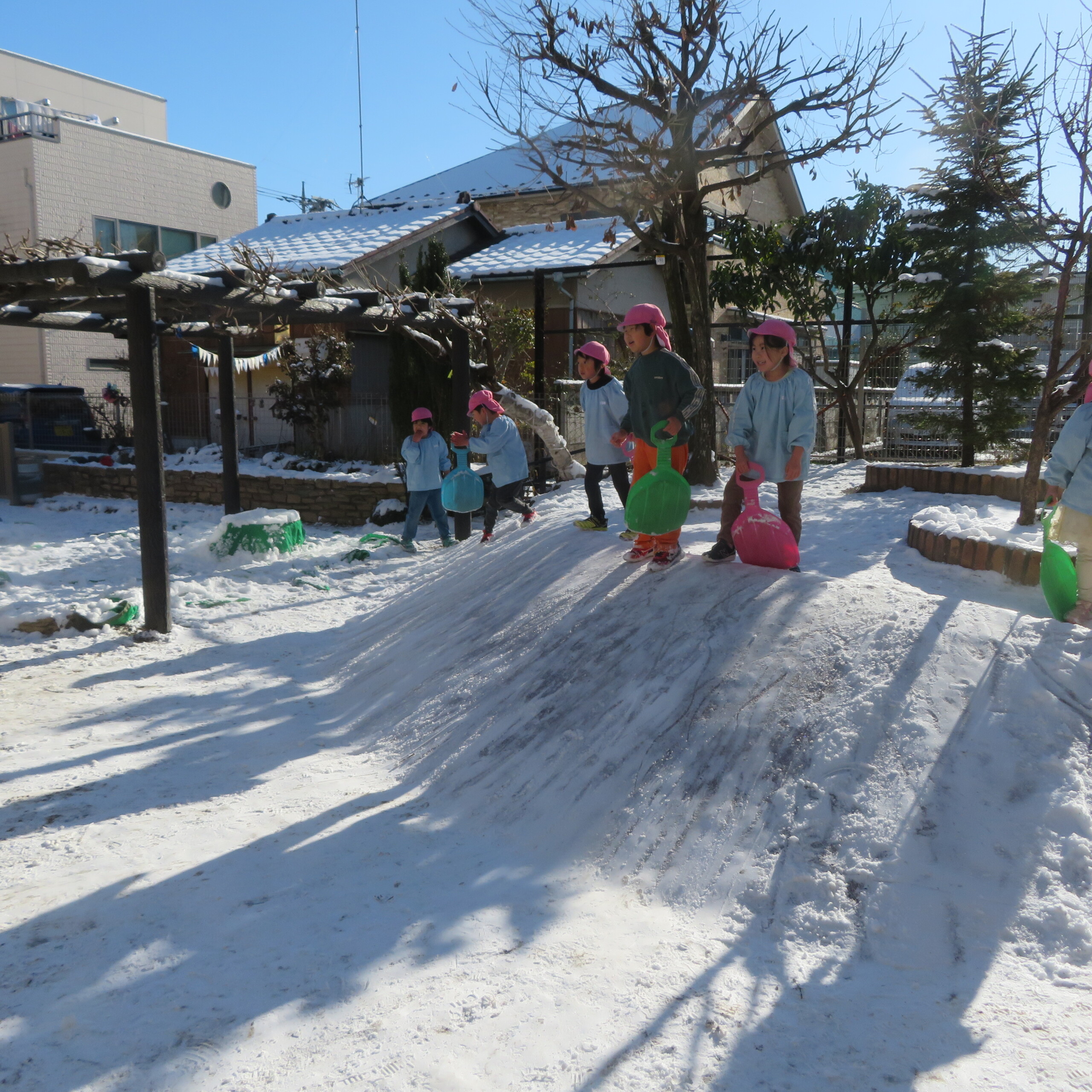 久々の雪と低温で朝のうちは雪遊びができました。小山からのそり滑りが一番人気で、歓声が上がっていました。園長