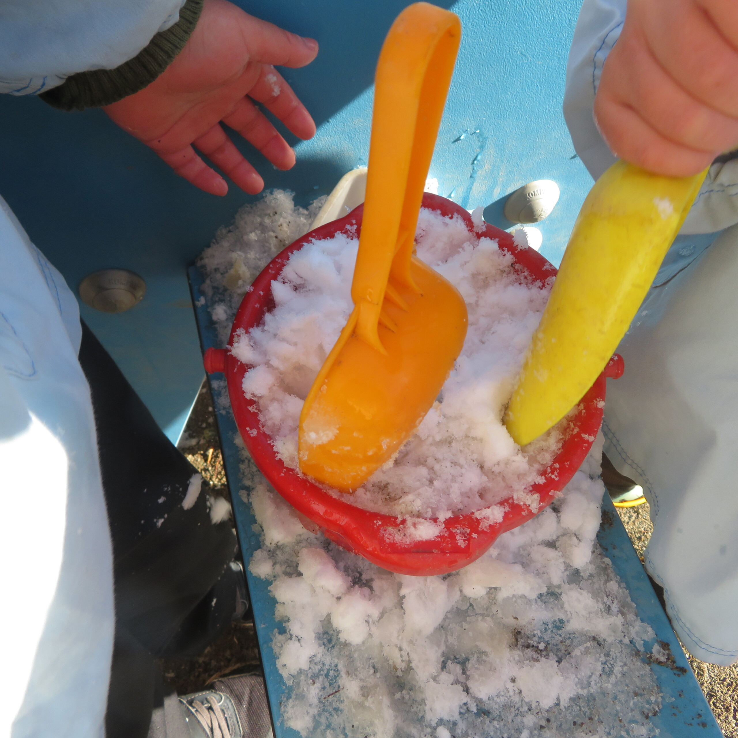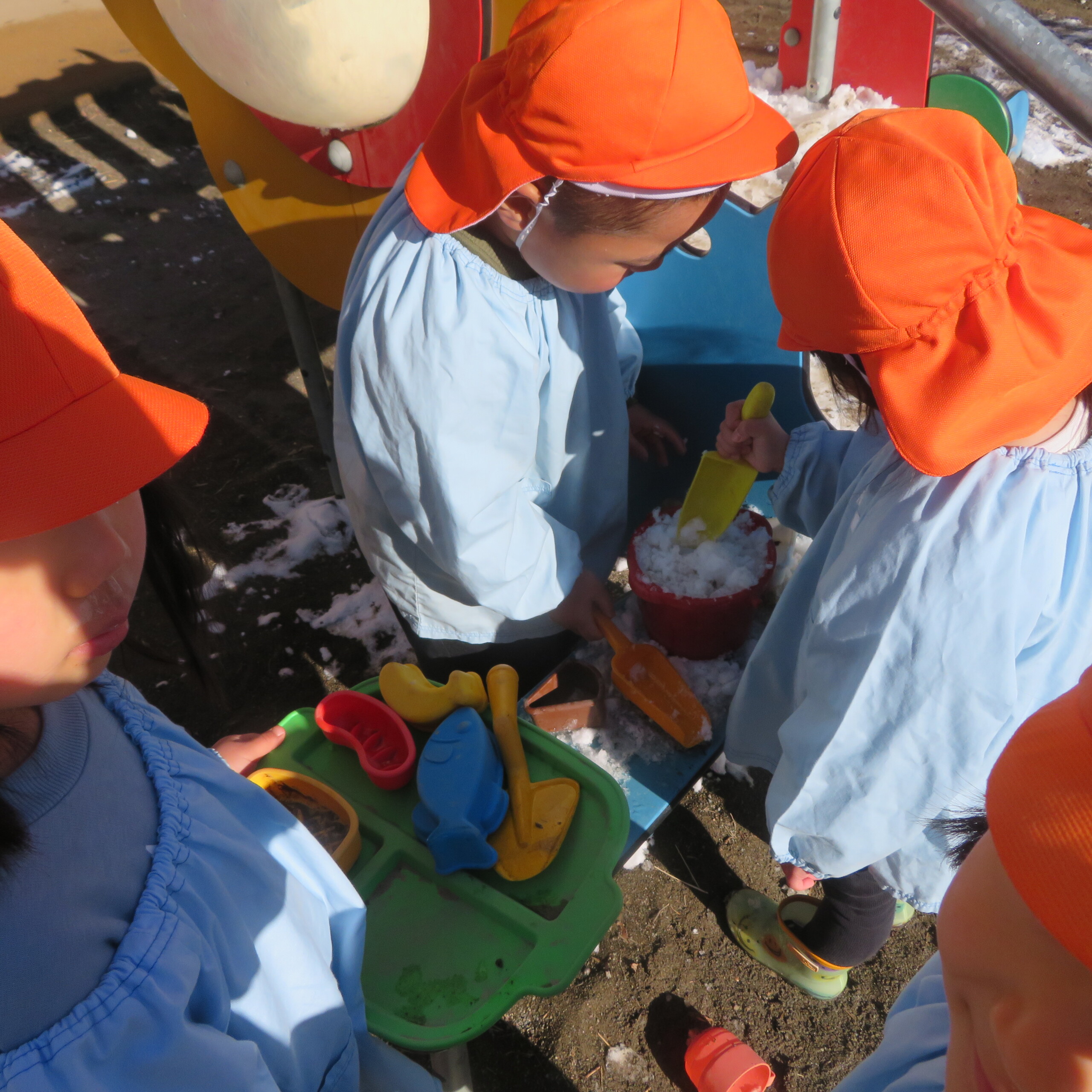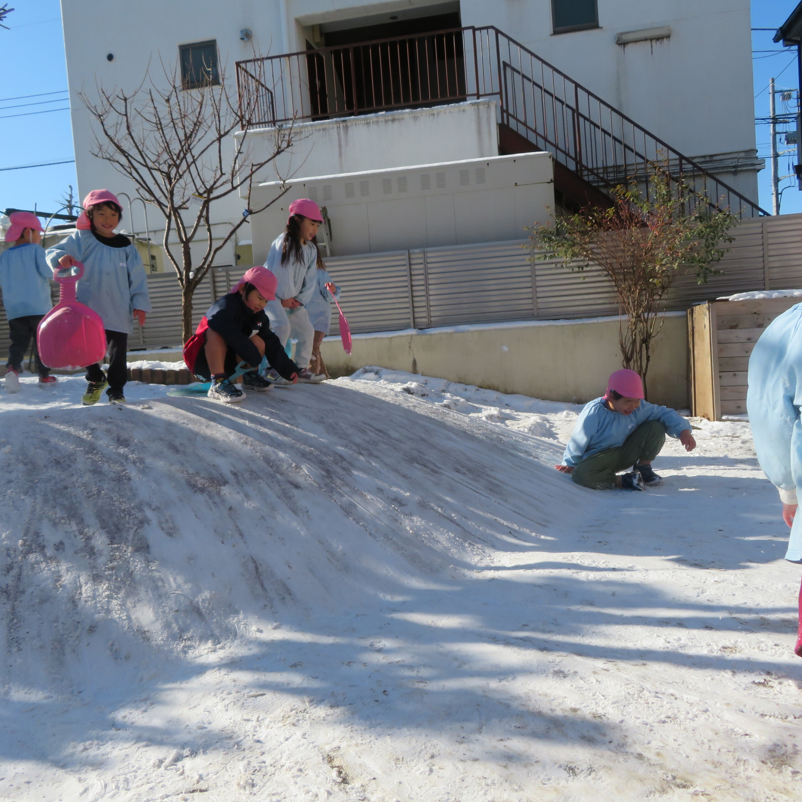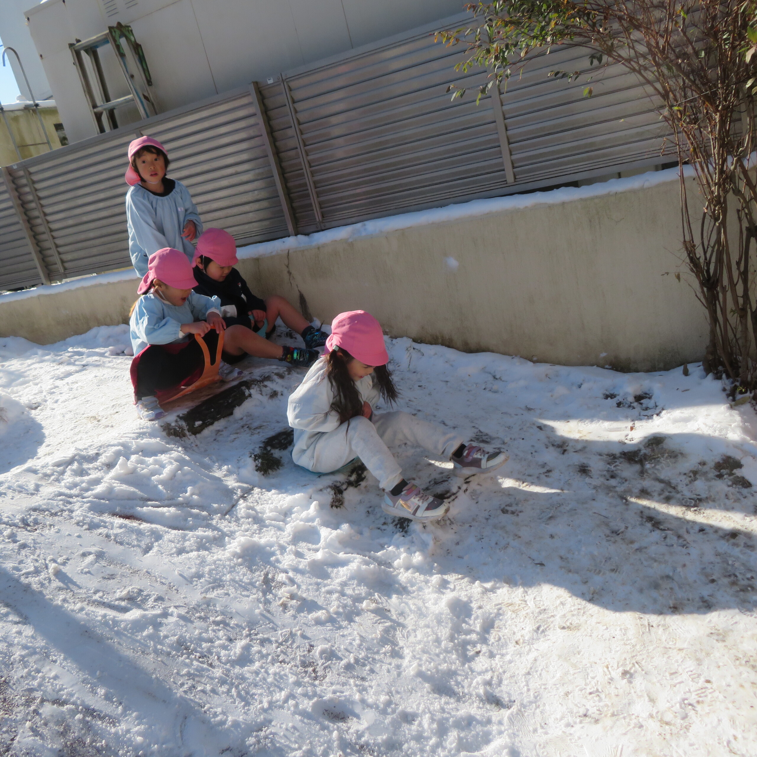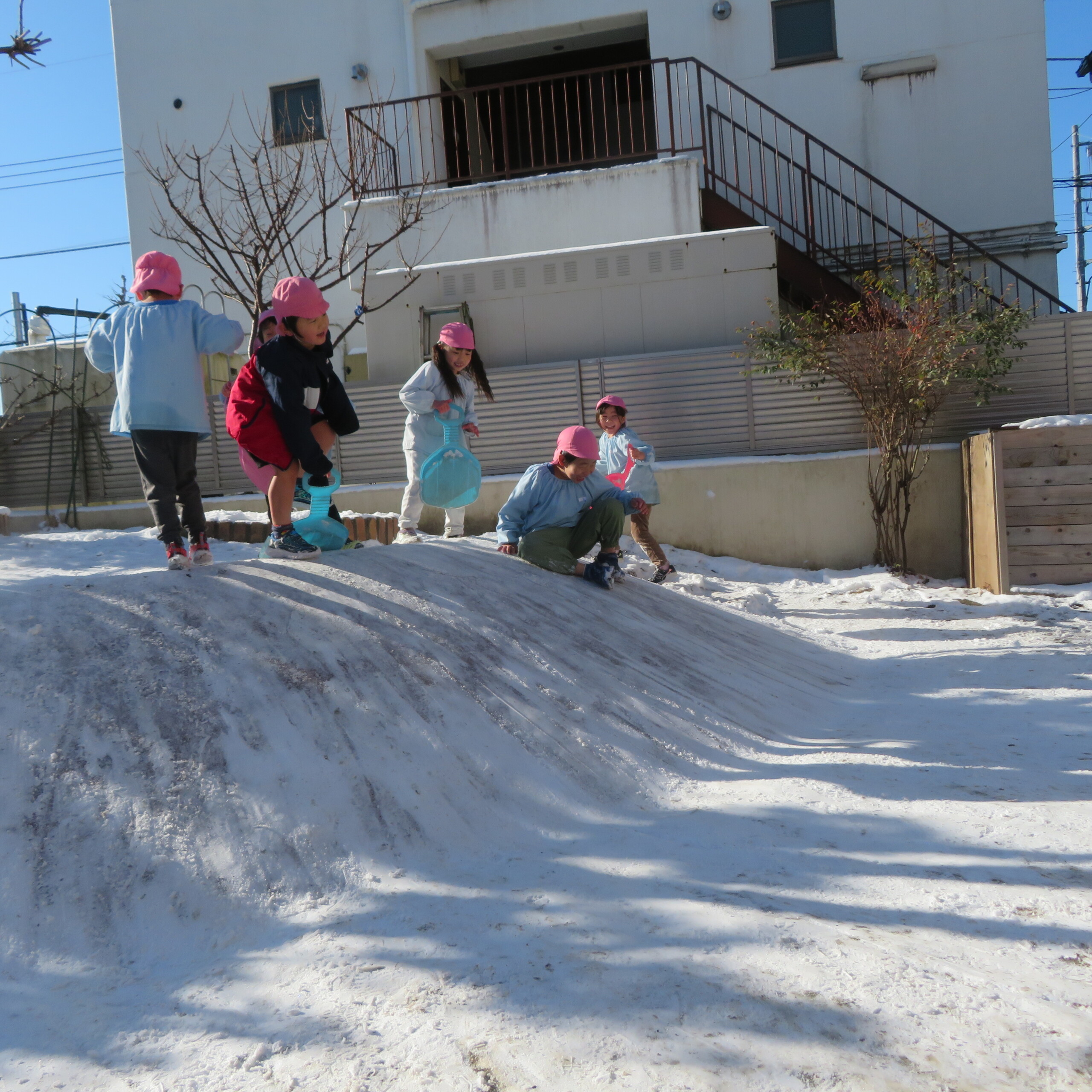 久々の雪と低温で朝のうちは雪遊びができました。小山からのそり滑りが一番人気で、歓声が上がっていました。園長