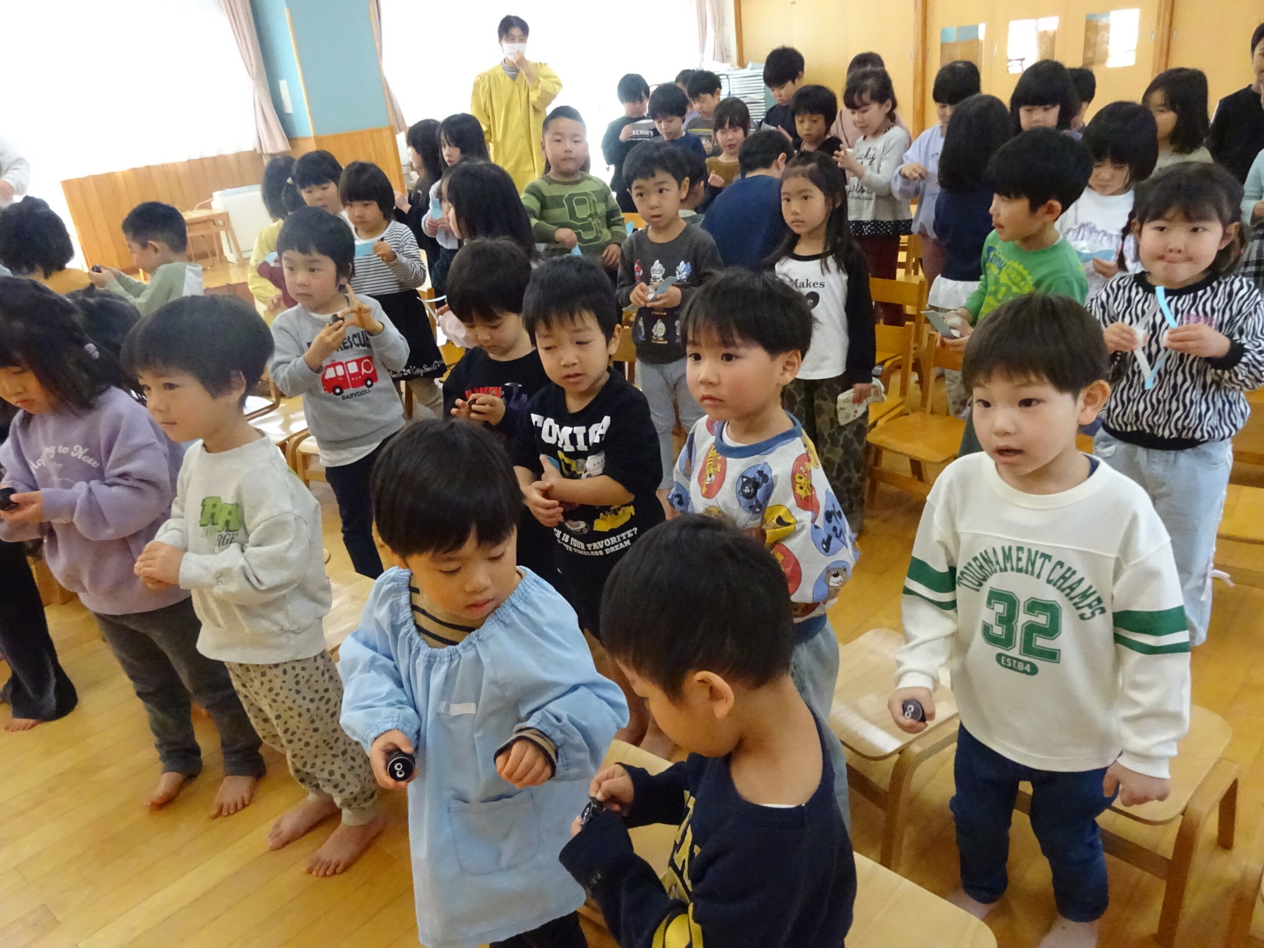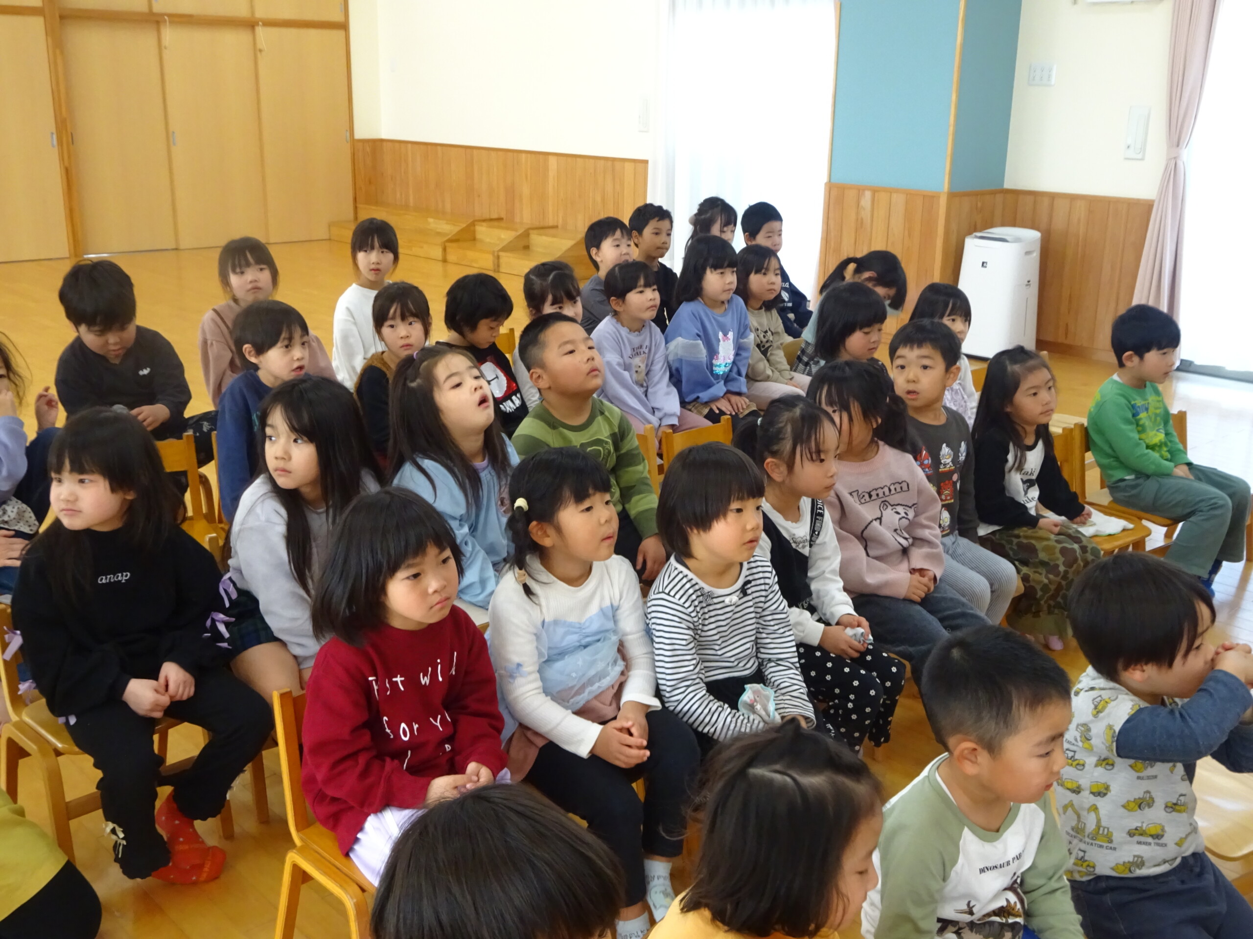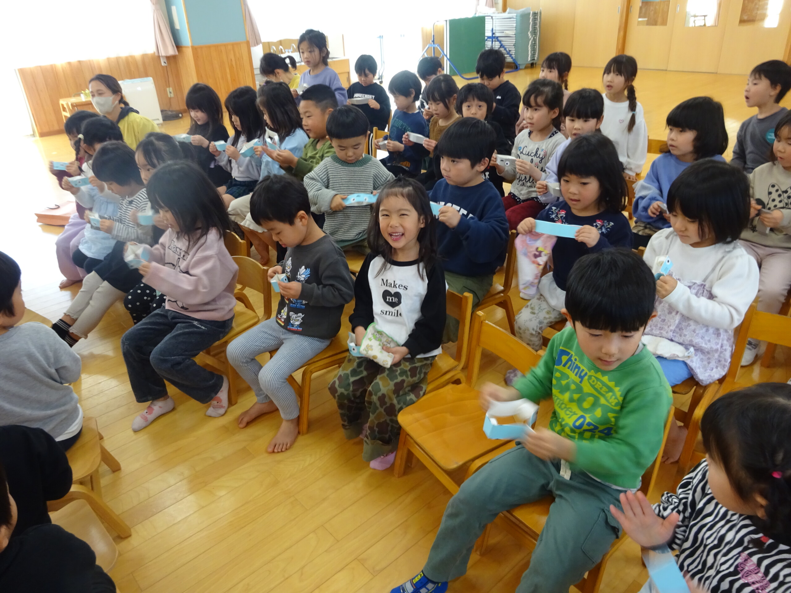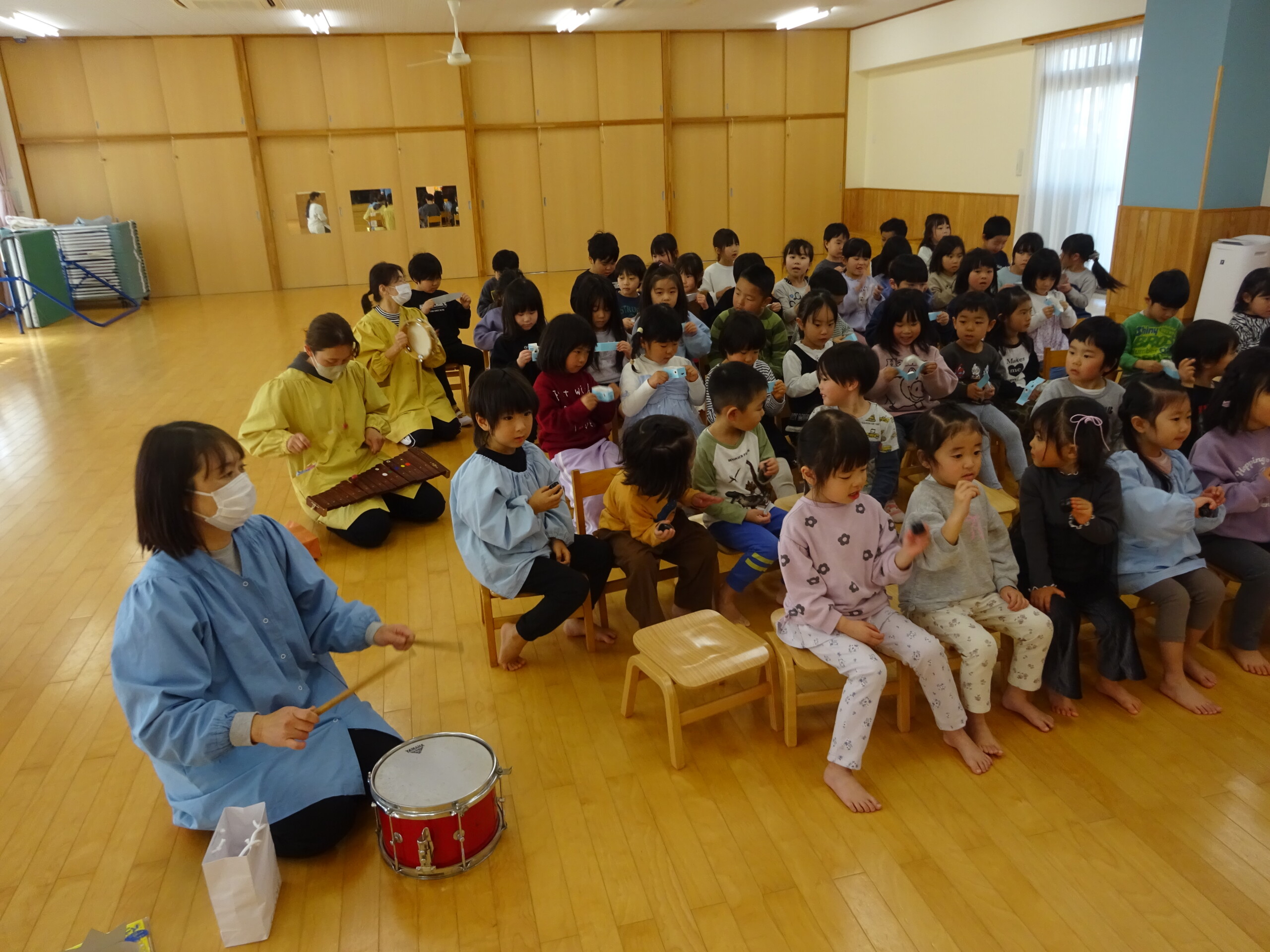 2月6日(木) みつばちホールで、2月生まれのお友達の誕生会がありました。誕生児のお友達の紹介をしてお祝いした後は、今月の歌『雪のペンキやさん』を元気にうたいました。お楽しみのコーナーは『トトロの音楽会』でした。楽器の音当てクイズやベル演奏、最後は「さんぽ」の曲に合わせて、子ども達は職員の手作り楽器(しか組は、“まっくろくろすけマラカス”。くま組、きりん組は、“トトロのカスタネット”)を、「シャカシャカ!」「カチカチ!」と鳴らして大合奏となりました。太田