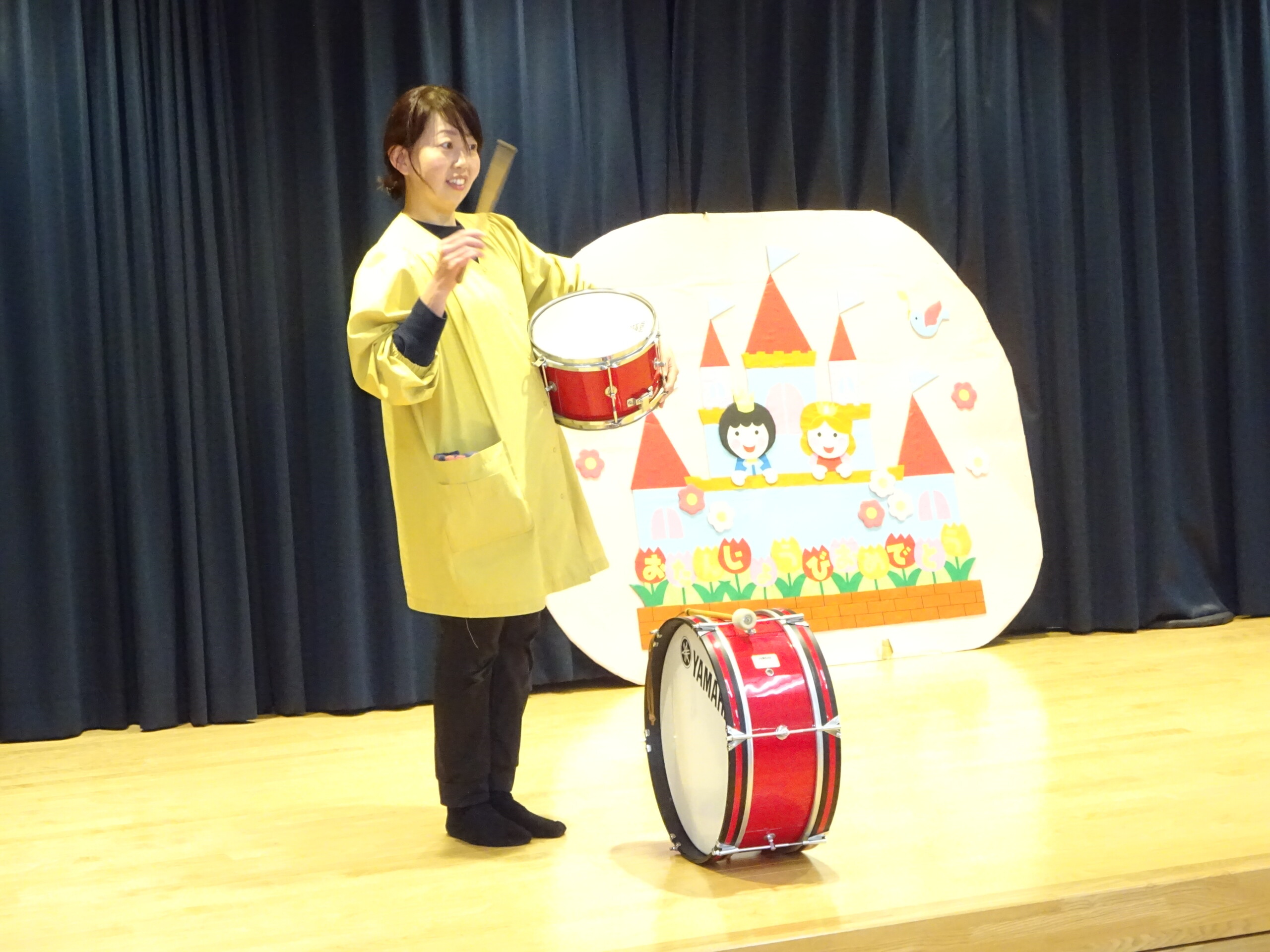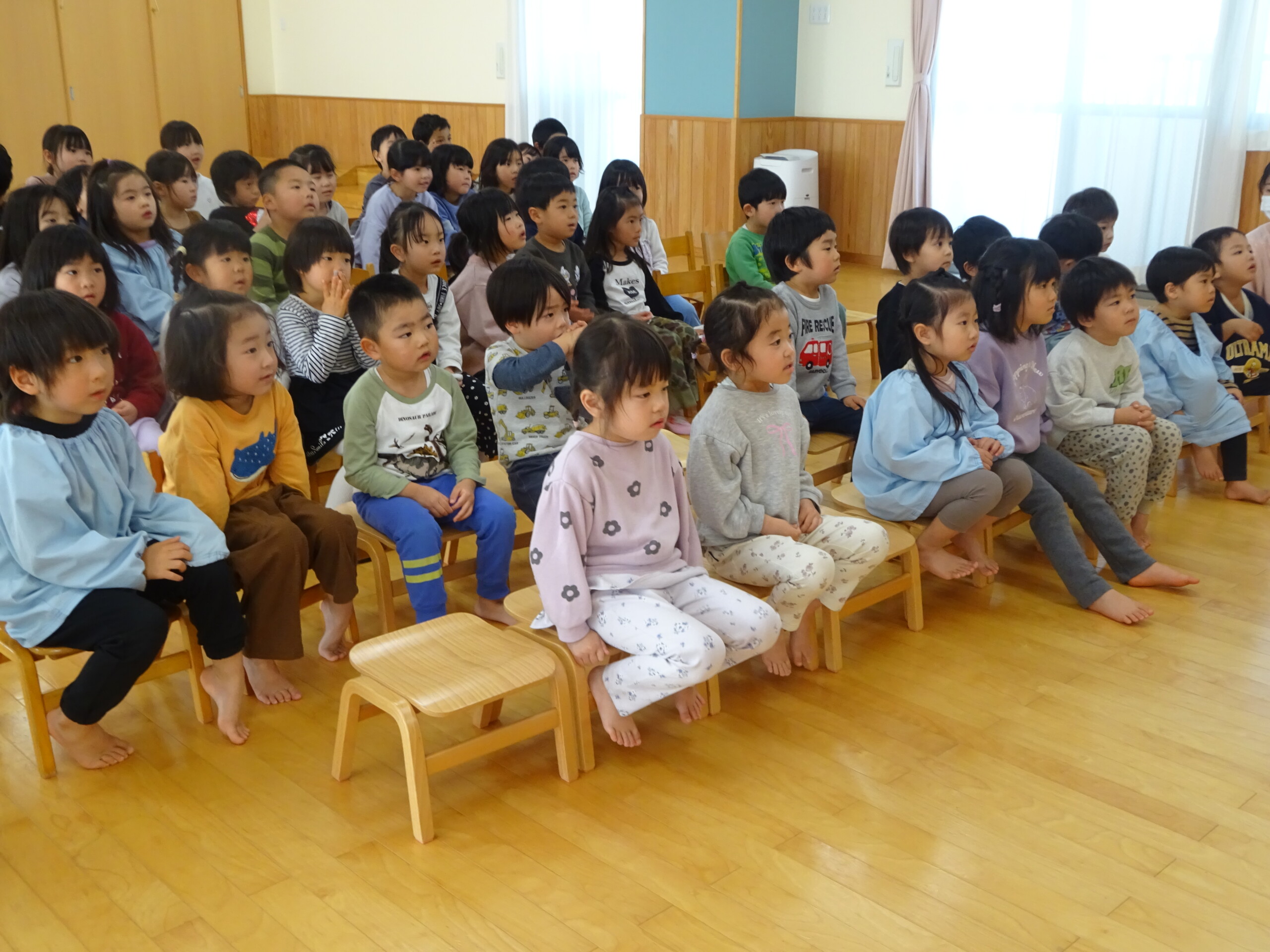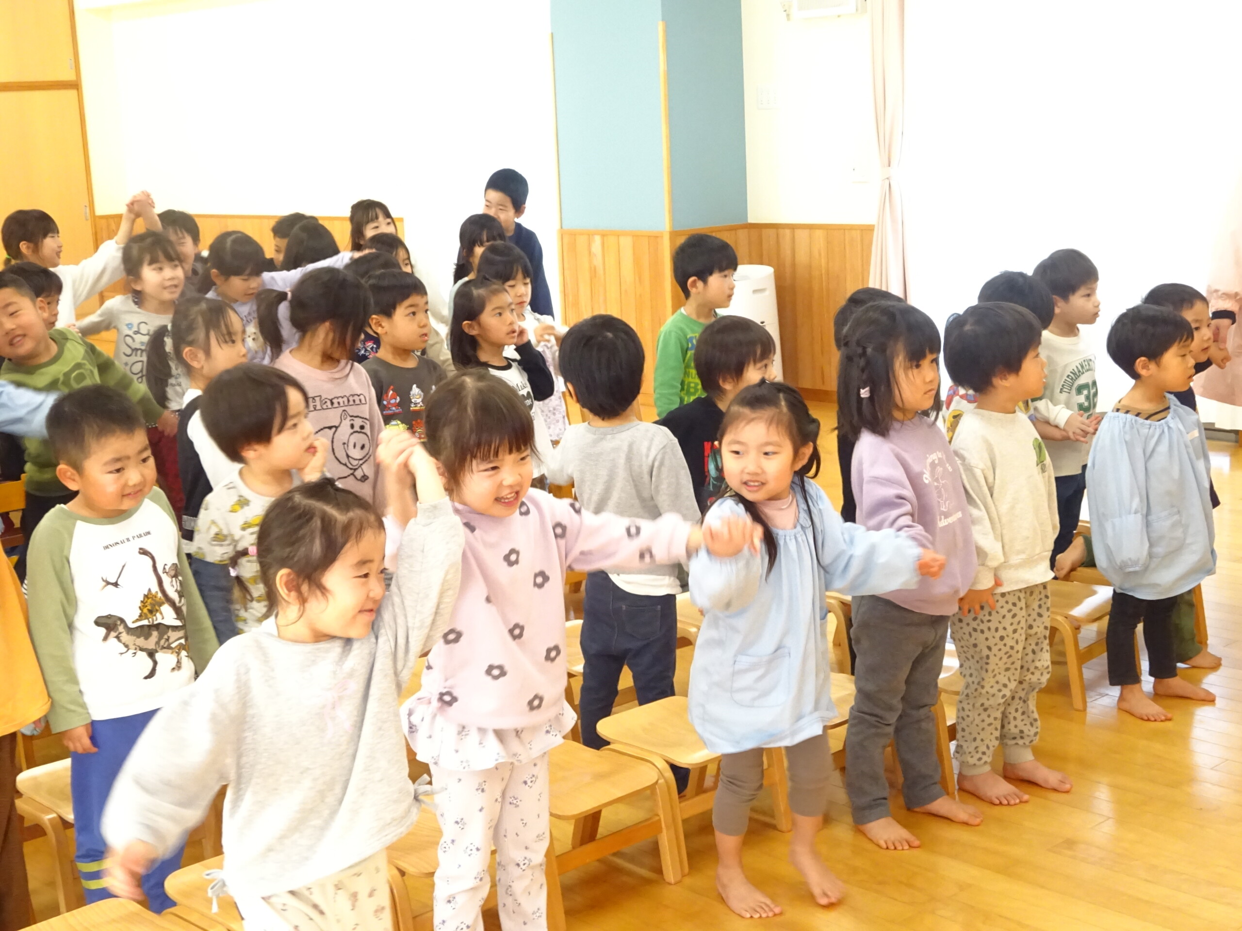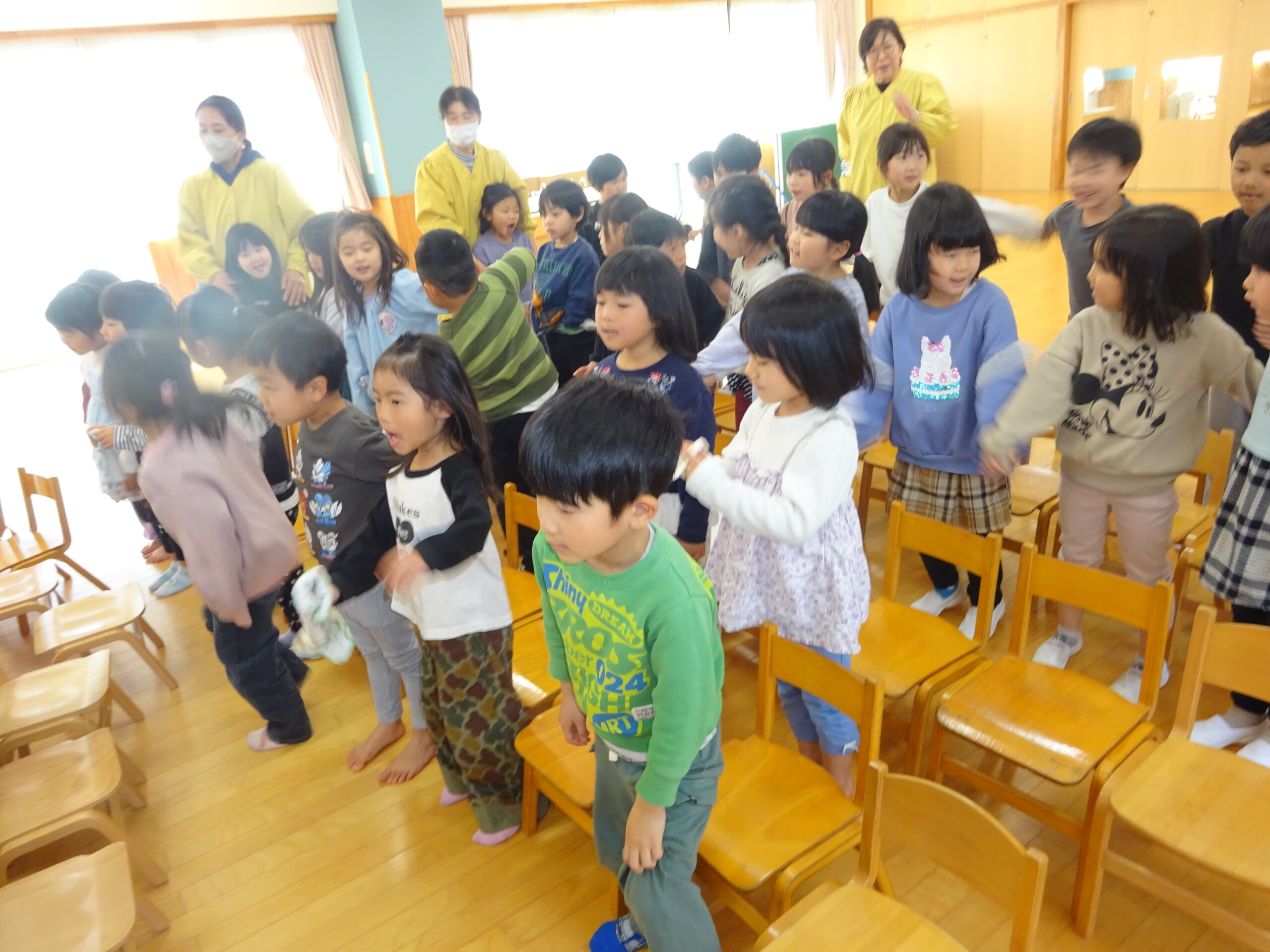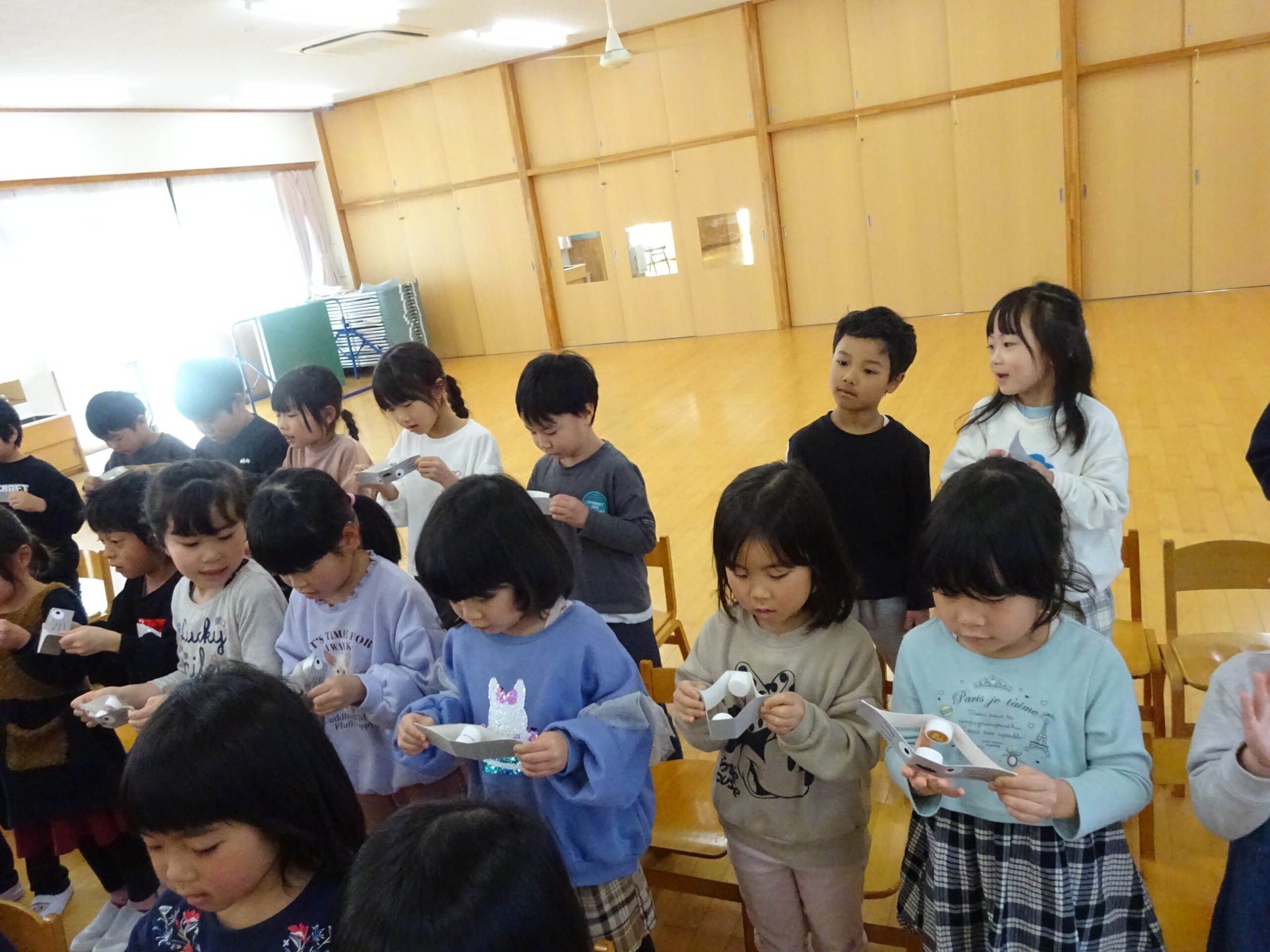 2月6日(木) みつばちホールで、2月生まれのお友達の誕生会がありました。誕生児のお友達の紹介をしてお祝いした後は、今月の歌『雪のペンキやさん』を元気にうたいました。お楽しみのコーナーは『トトロの音楽会』でした。楽器の音当てクイズやベル演奏、最後は「さんぽ」の曲に合わせて、子ども達は職員の手作り楽器(しか組は、“まっくろくろすけマラカス”。くま組、きりん組は、“トトロのカスタネット”)を、「シャカシャカ!」「カチカチ!」と鳴らして大合奏となりました。太田