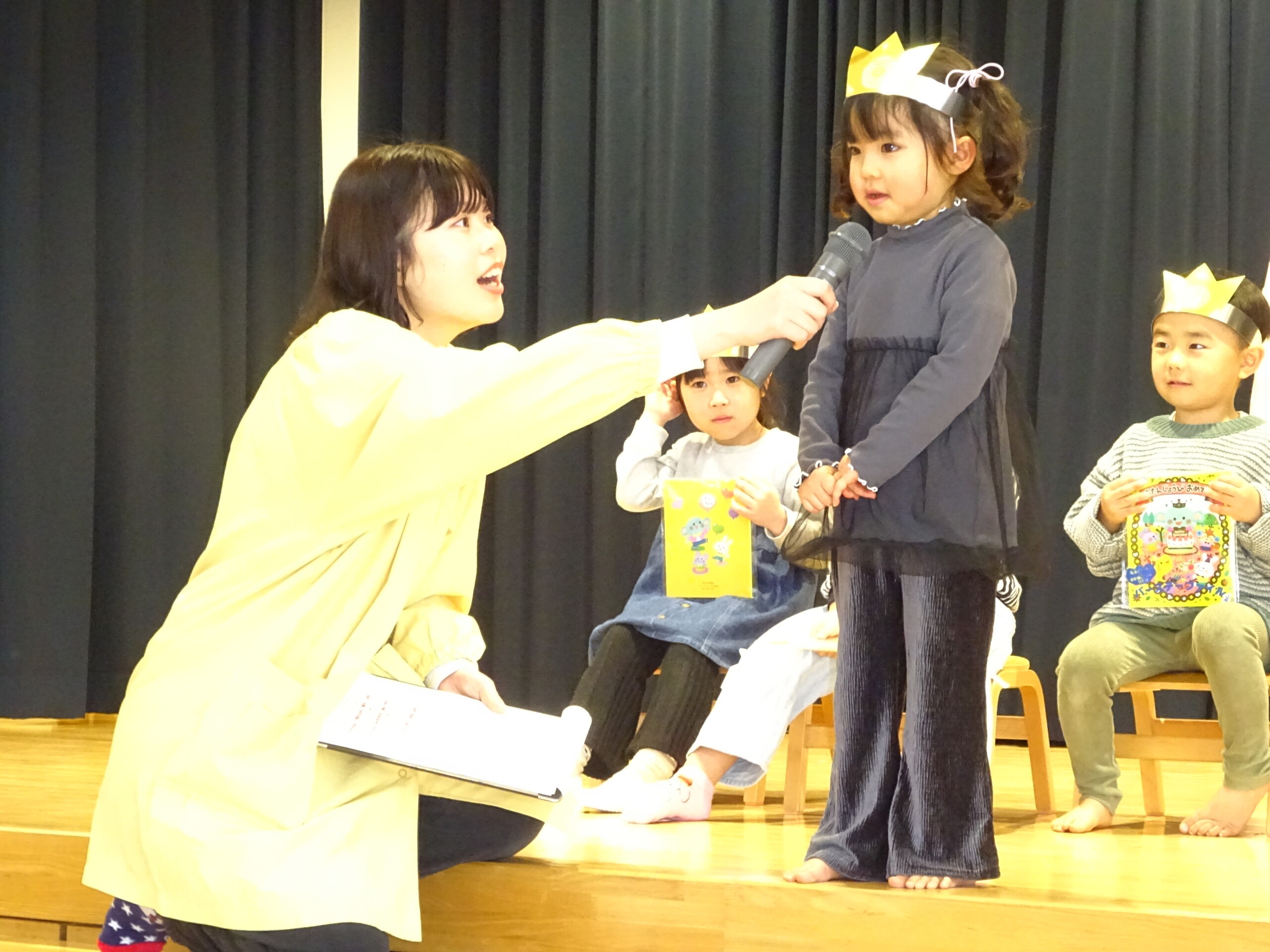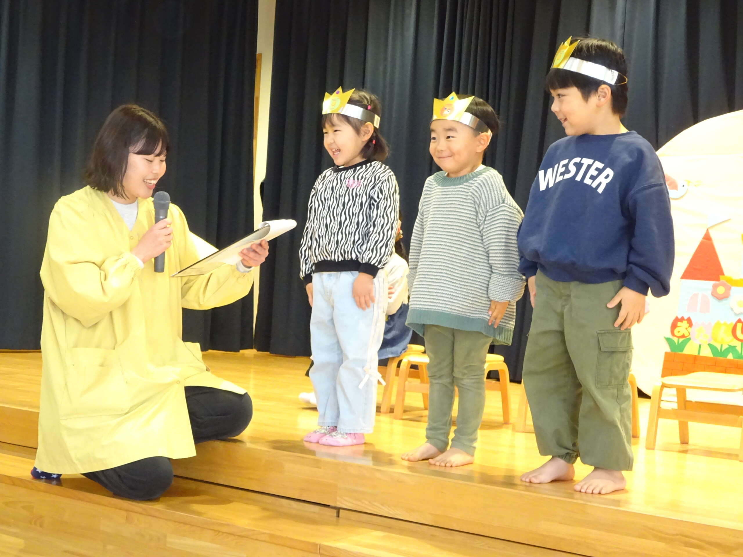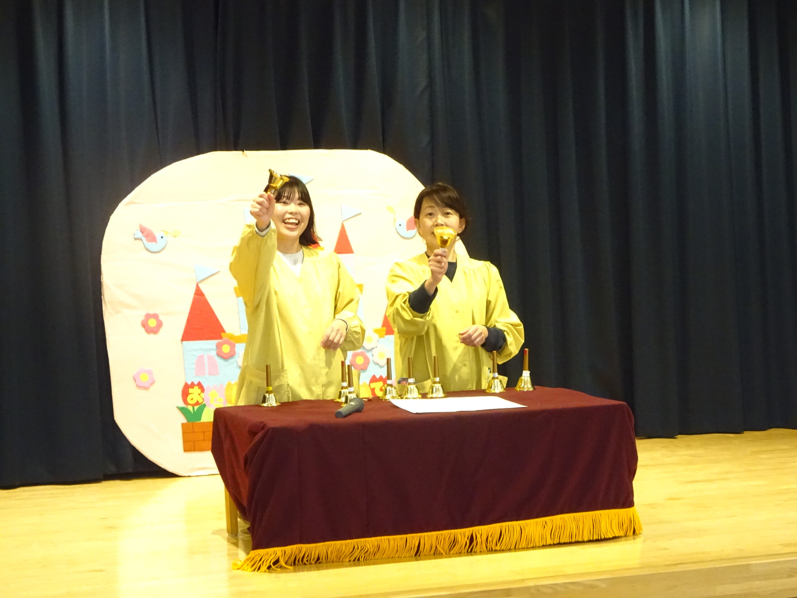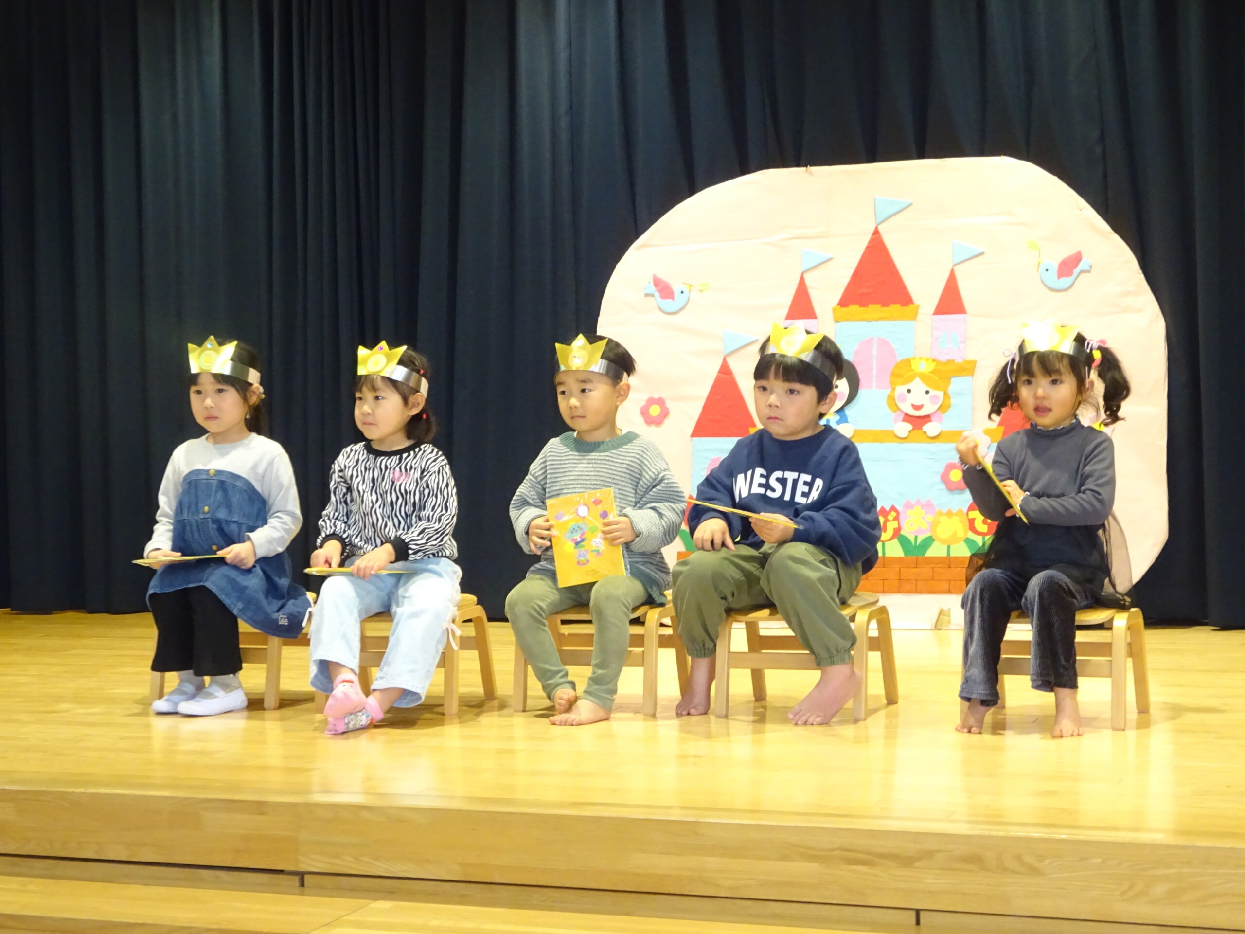 2月6日(木) みつばちホールで、2月生まれのお友達の誕生会がありました。誕生児のお友達の紹介をしてお祝いした後は、今月の歌『雪のペンキやさん』を元気にうたいました。お楽しみのコーナーは『トトロの音楽会』でした。楽器の音当てクイズやベル演奏、最後は「さんぽ」の曲に合わせて、子ども達は職員の手作り楽器(しか組は、“まっくろくろすけマラカス”。くま組、きりん組は、“トトロのカスタネット”)を、「シャカシャカ!」「カチカチ!」と鳴らして大合奏となりました。太田
