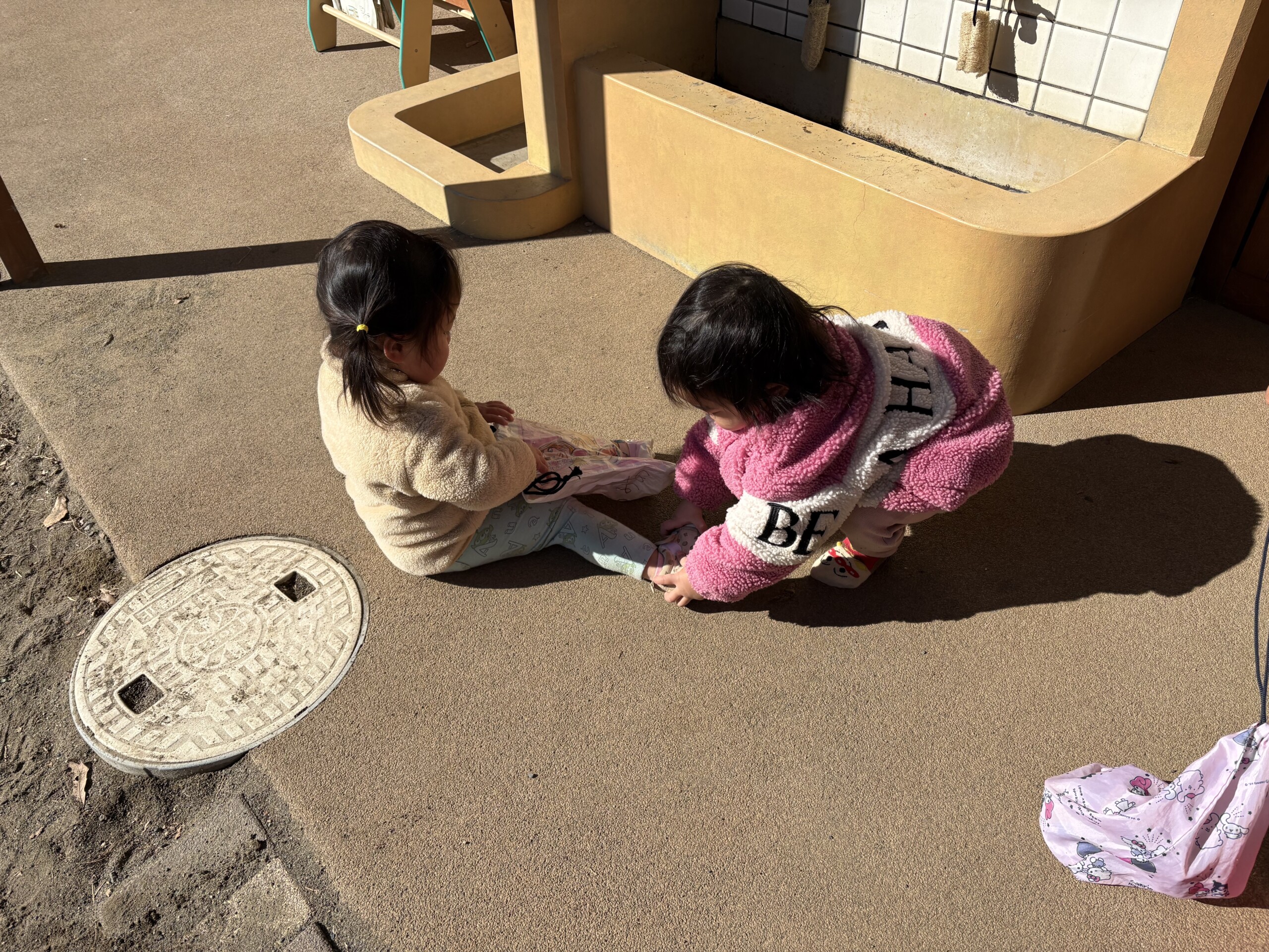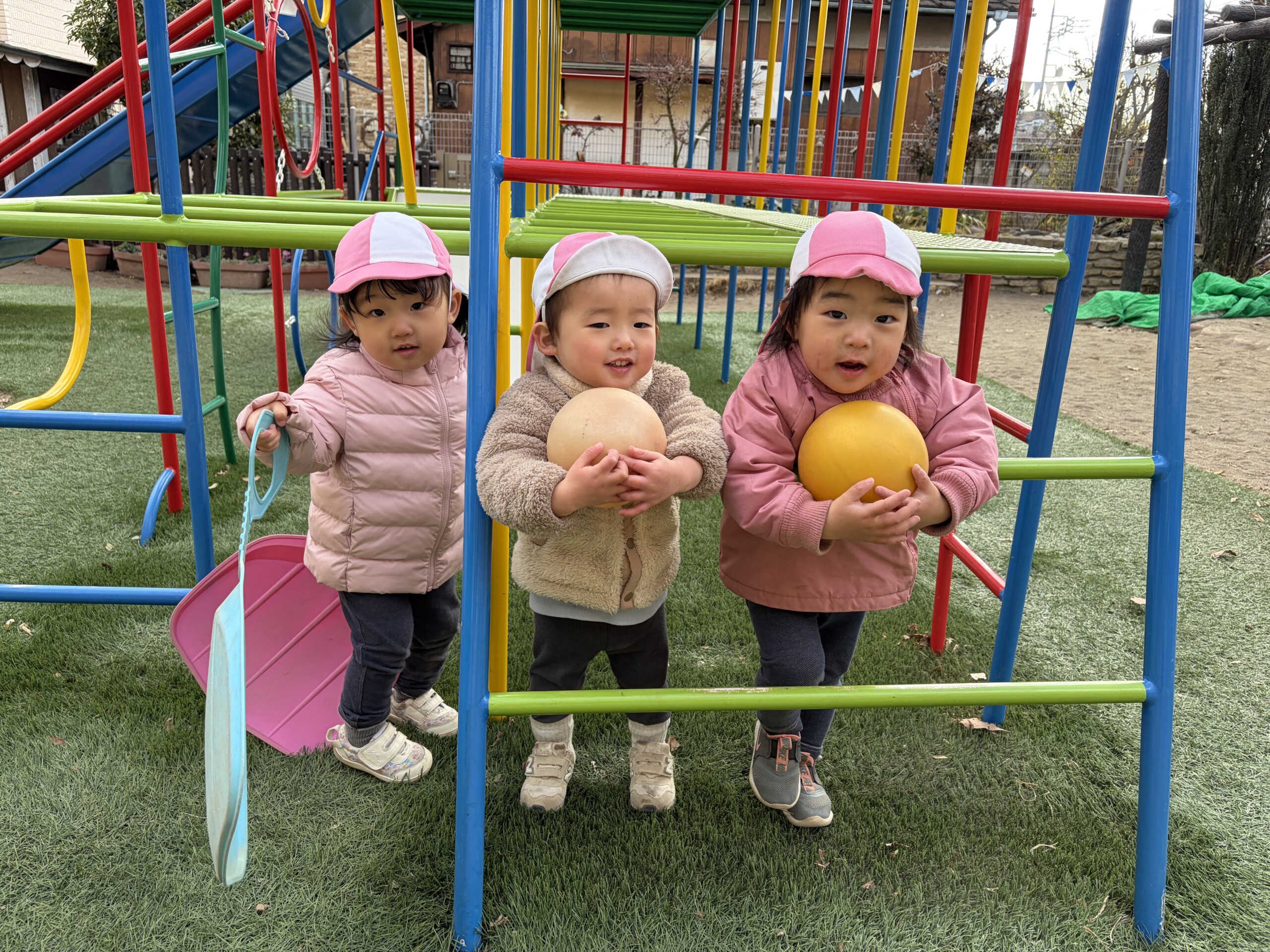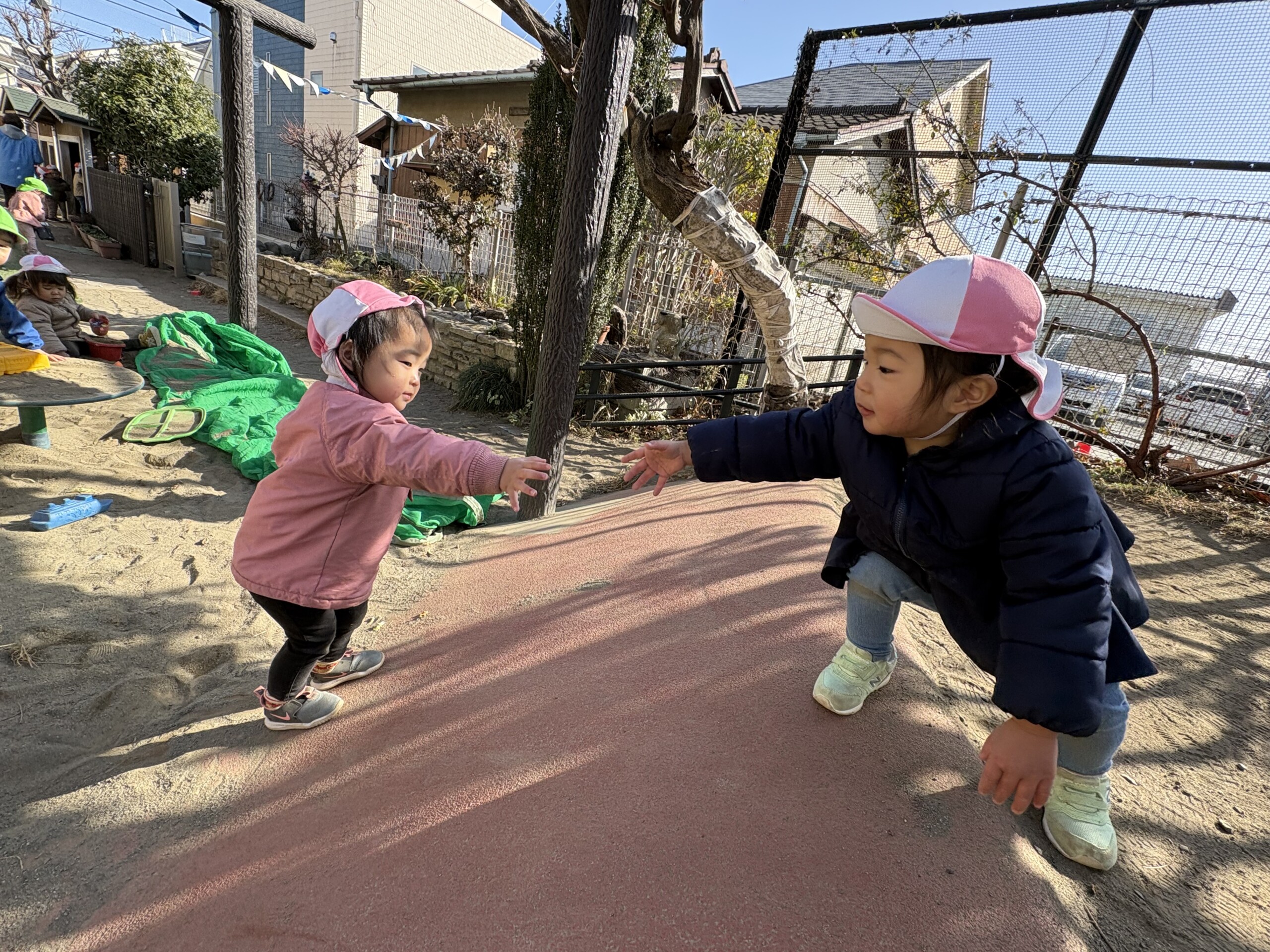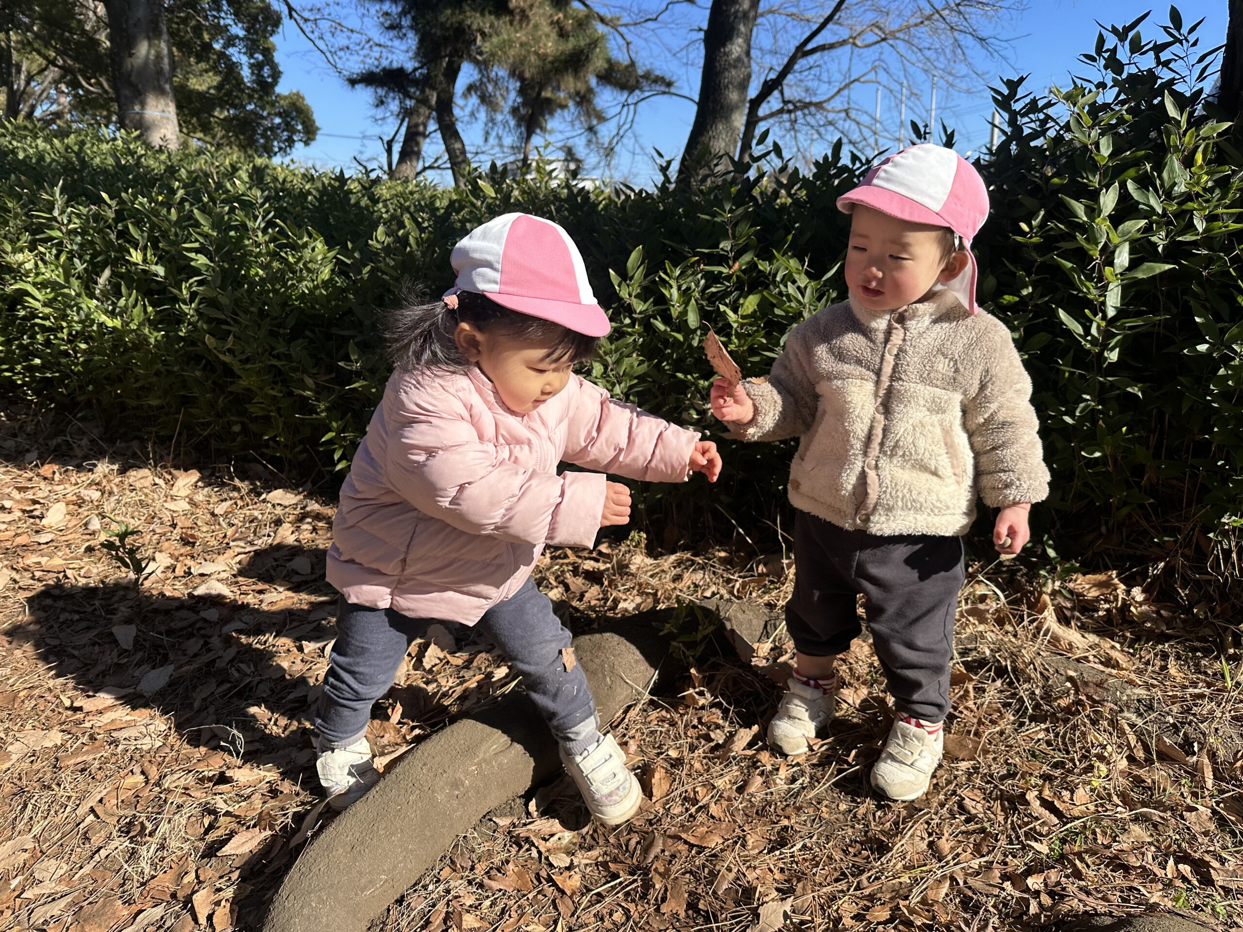 | 朝晩はまだまだ寒い日が続いていますが、日中はポカポカ陽気で元気いっぱい戸外遊びを楽しむ子ども達です。あひる組での生活も残りわずかとなりました。あんなに小さかった子ども達もグーンと成長し、身の回りの事を「自分で!」とチャレンジする姿も見られ、今ではたくさんの事ができるようになりました。お友達との関わりも増えてきて、名前を呼んでみたり、泣いている子には「はい、どーぞ!」と玩具を渡してみたり、「だいじょーぶ?」と頭を“よしよし”と撫でてあげるなど微笑ましいやり取りも!