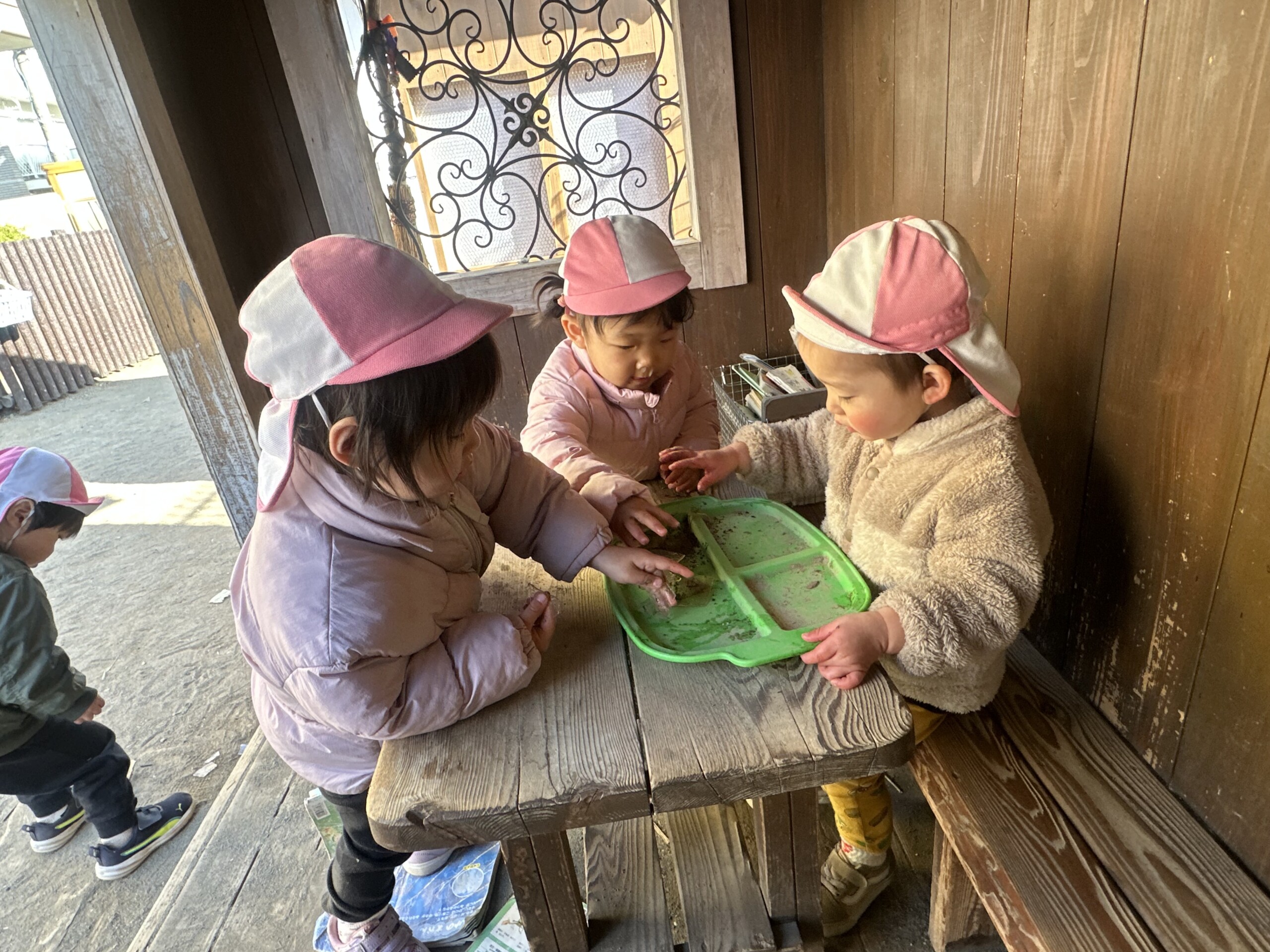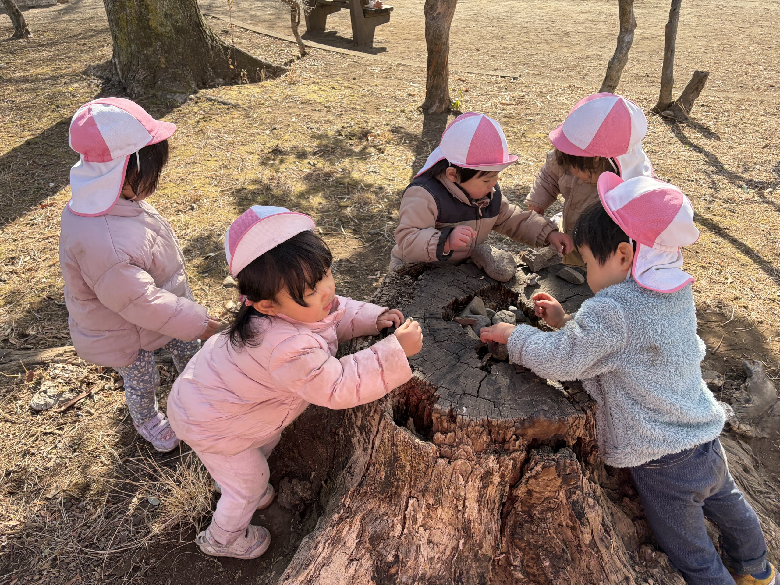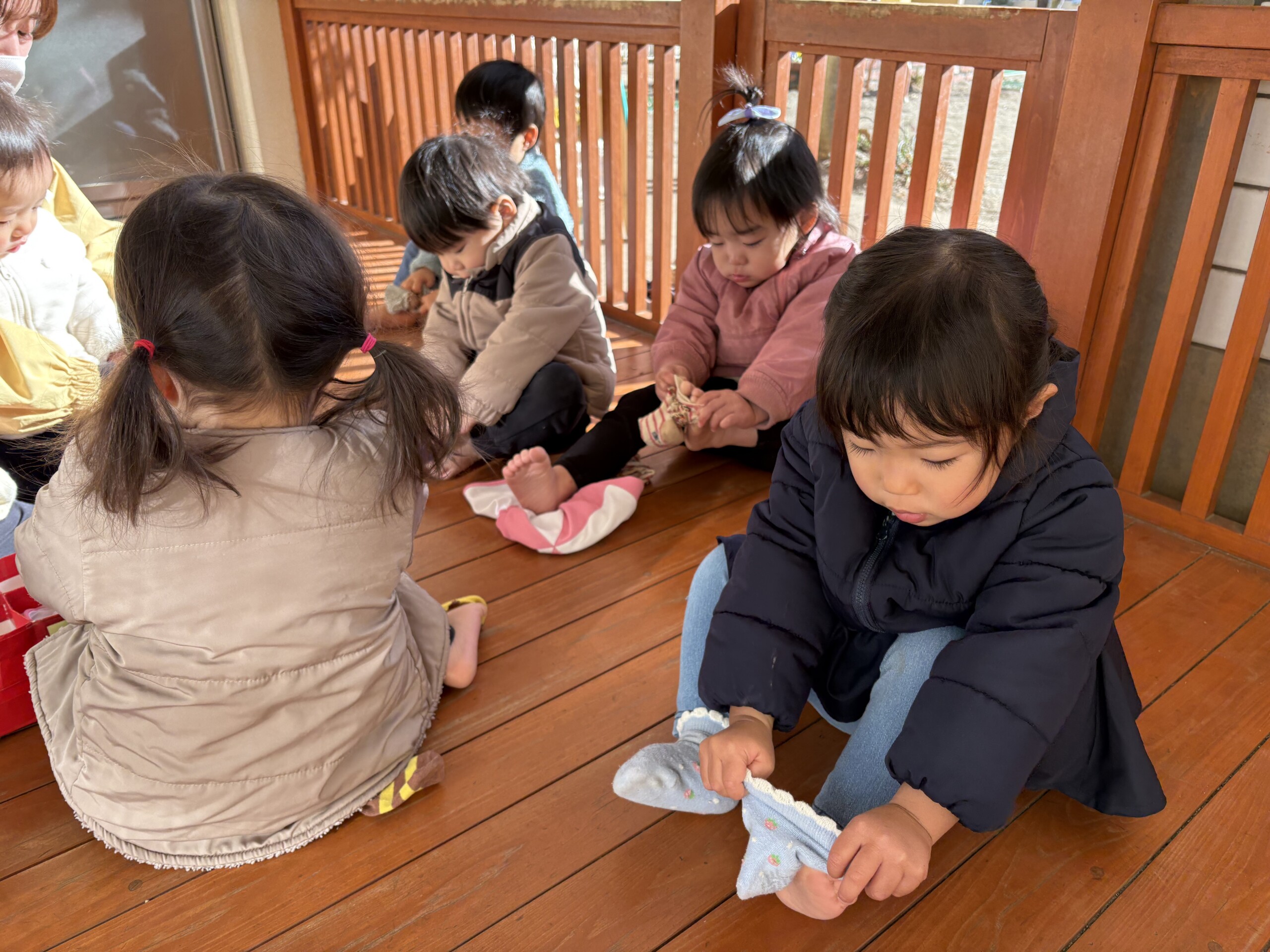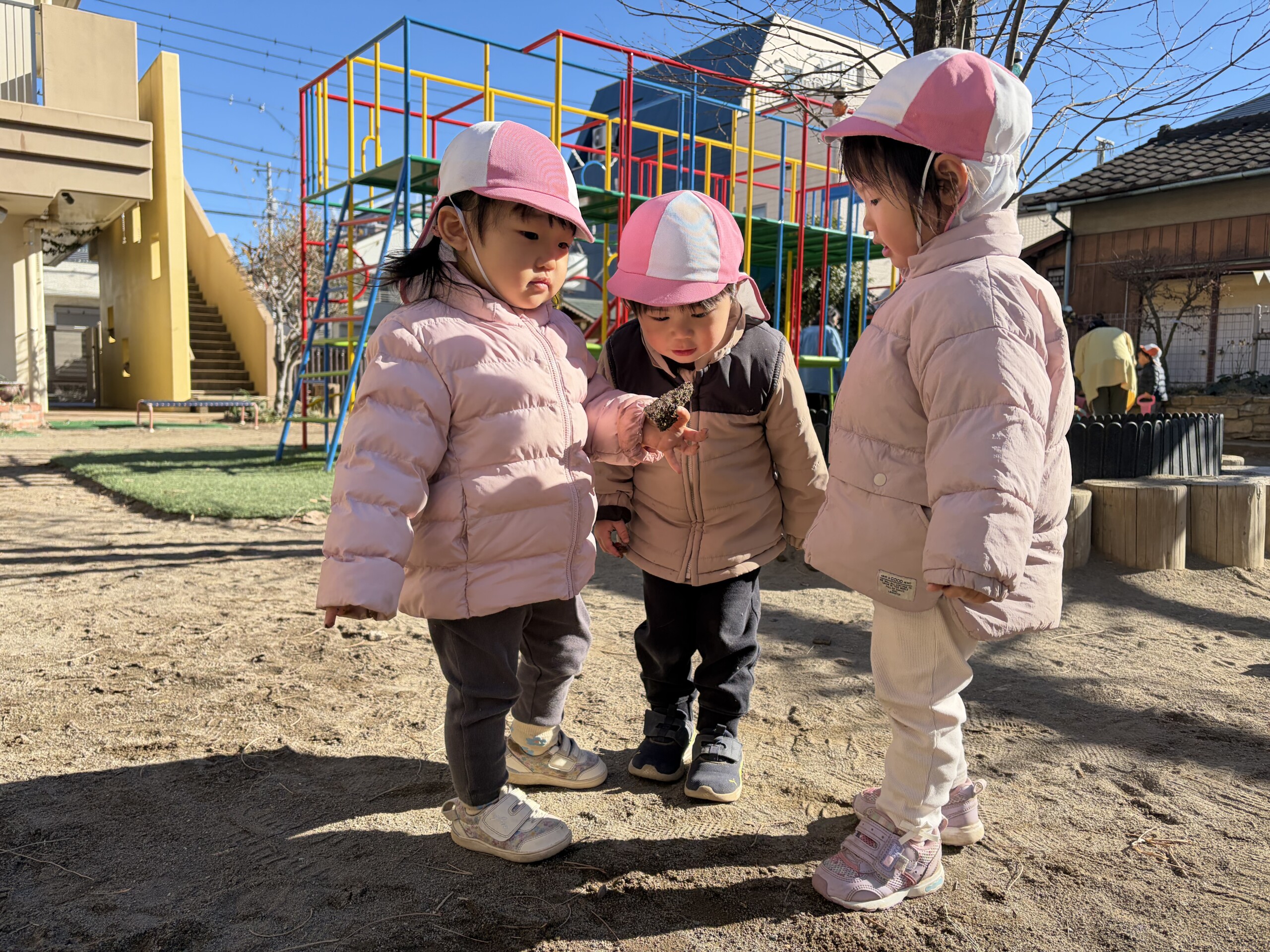 | 朝晩はまだまだ寒い日が続いていますが、日中はポカポカ陽気で元気いっぱい戸外遊びを楽しむ子ども達です。あひる組での生活も残りわずかとなりました。あんなに小さかった子ども達もグーンと成長し、身の回りの事を「自分で!」とチャレンジする姿も見られ、今ではたくさんの事ができるようになりました。お友達との関わりも増えてきて、名前を呼んでみたり、泣いている子には「はい、どーぞ!」と玩具を渡してみたり、「だいじょーぶ?」と頭を“よしよし”と撫でてあげるなど微笑ましいやり取りも!
