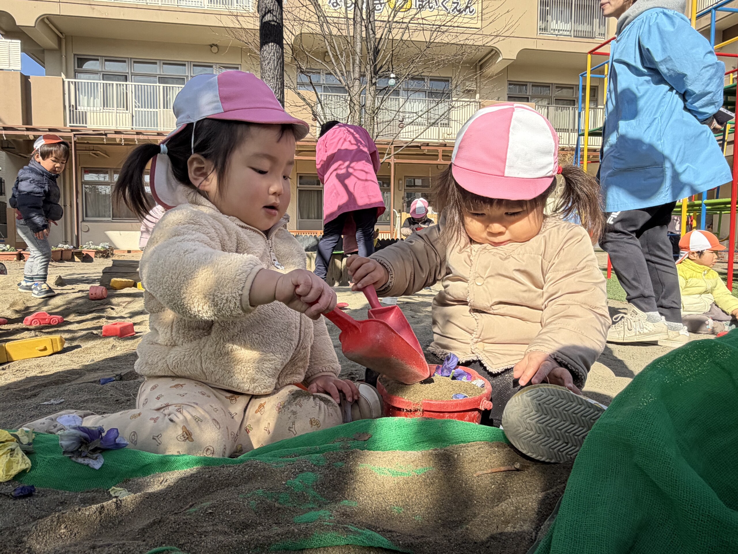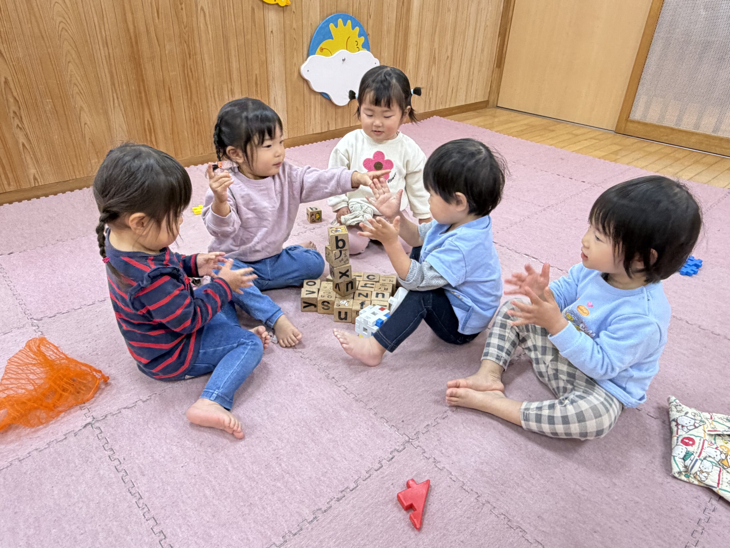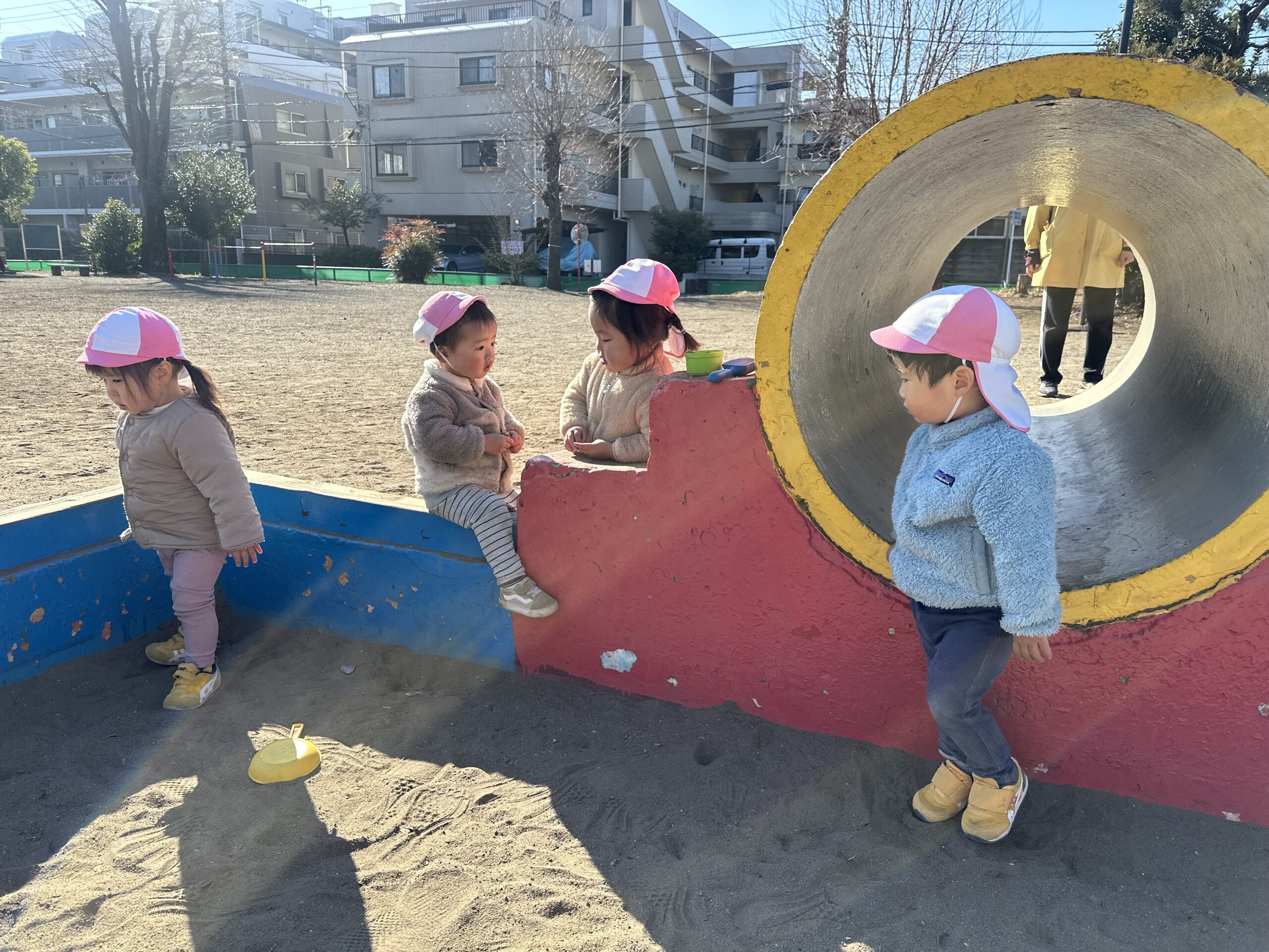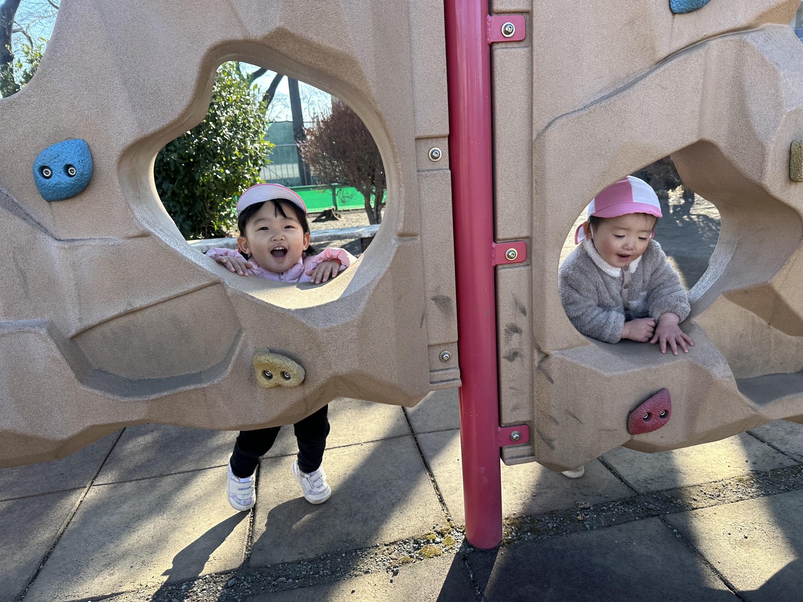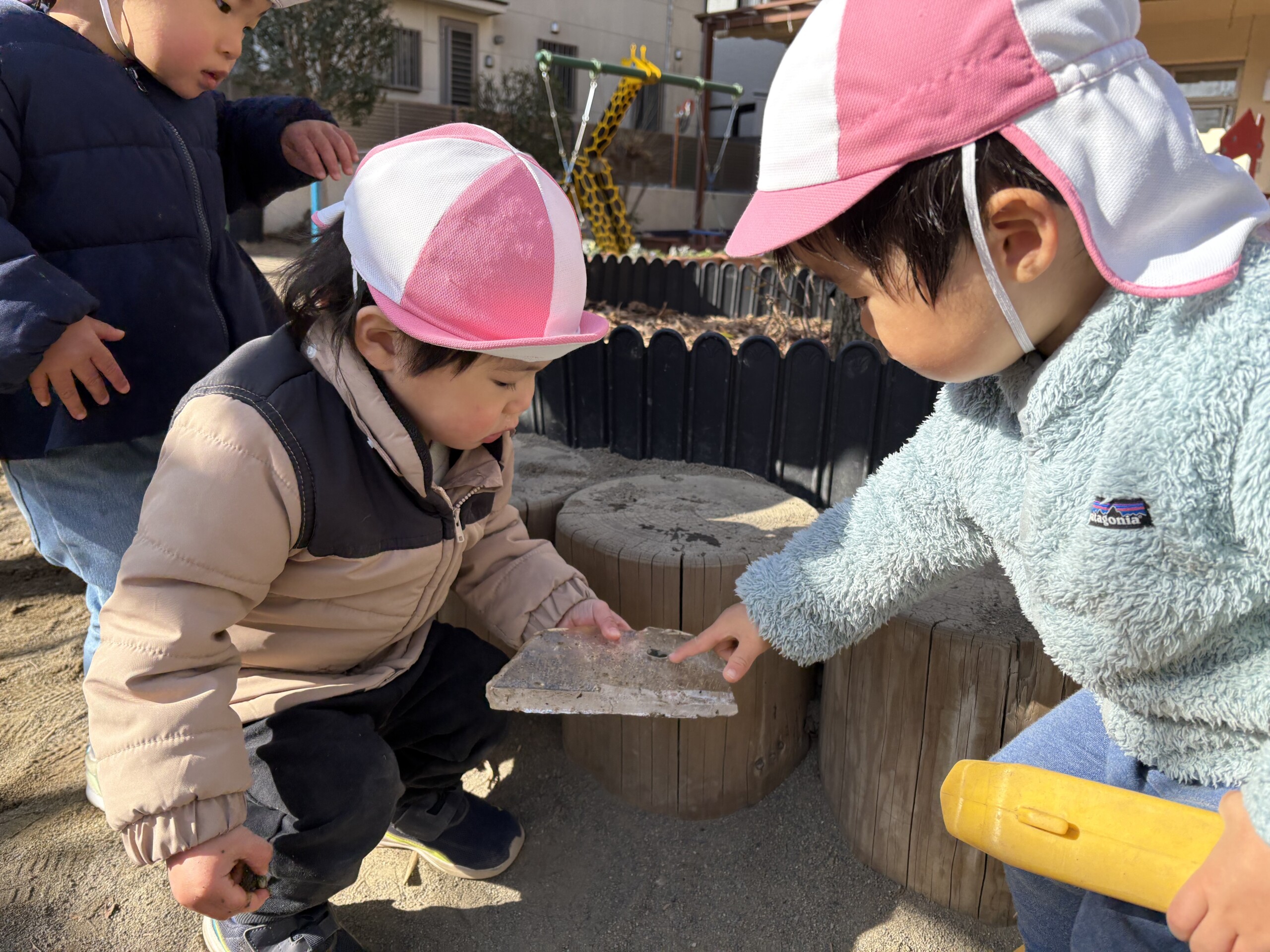 | 朝晩はまだまだ寒い日が続いていますが、日中はポカポカ陽気で元気いっぱい戸外遊びを楽しむ子ども達です。あひる組での生活も残りわずかとなりました。あんなに小さかった子ども達もグーンと成長し、身の回りの事を「自分で!」とチャレンジする姿も見られ、今ではたくさんの事ができるようになりました。お友達との関わりも増えてきて、名前を呼んでみたり、泣いている子には「はい、どーぞ!」と玩具を渡してみたり、「だいじょーぶ?」と頭を“よしよし”と撫でてあげるなど微笑ましいやり取りも!