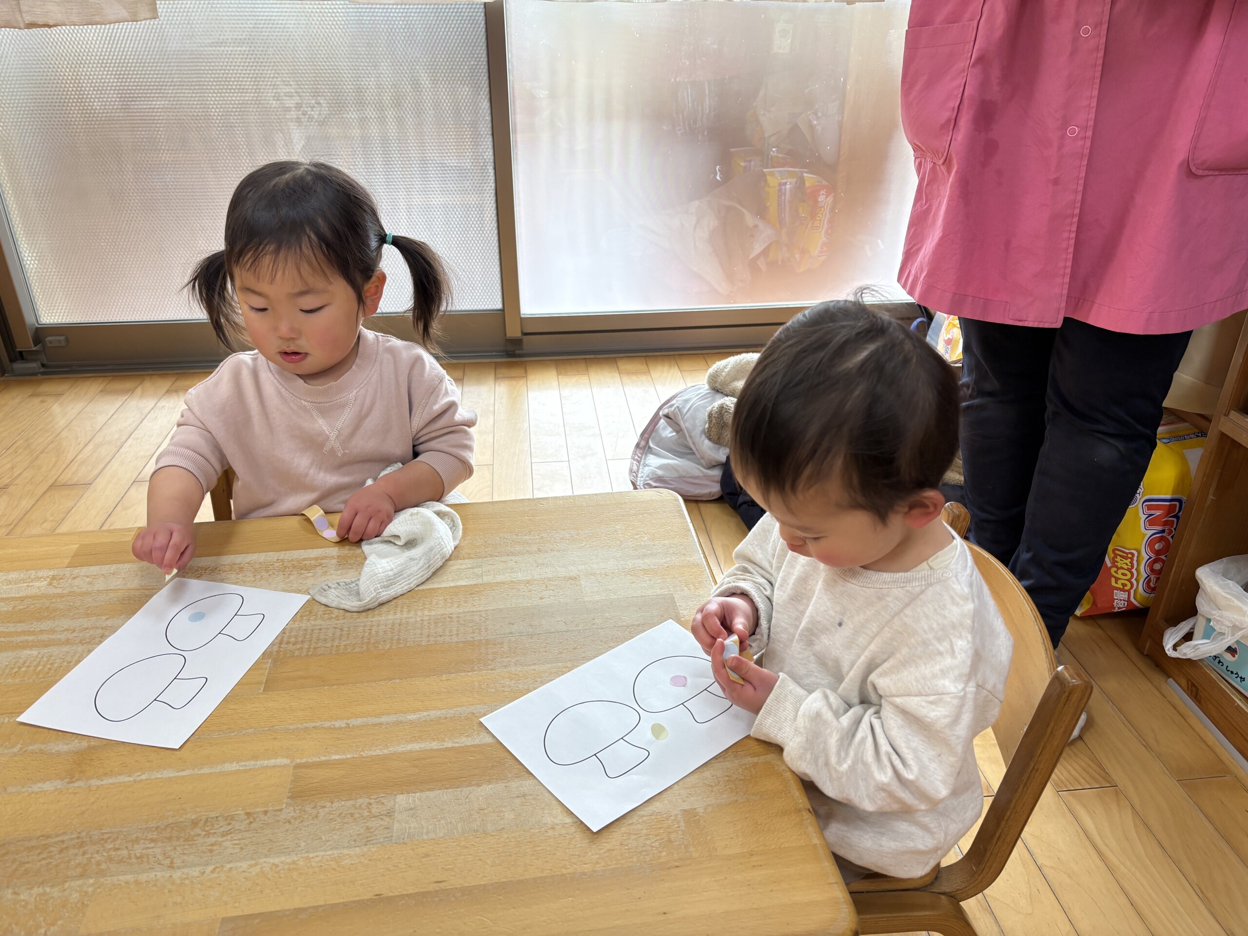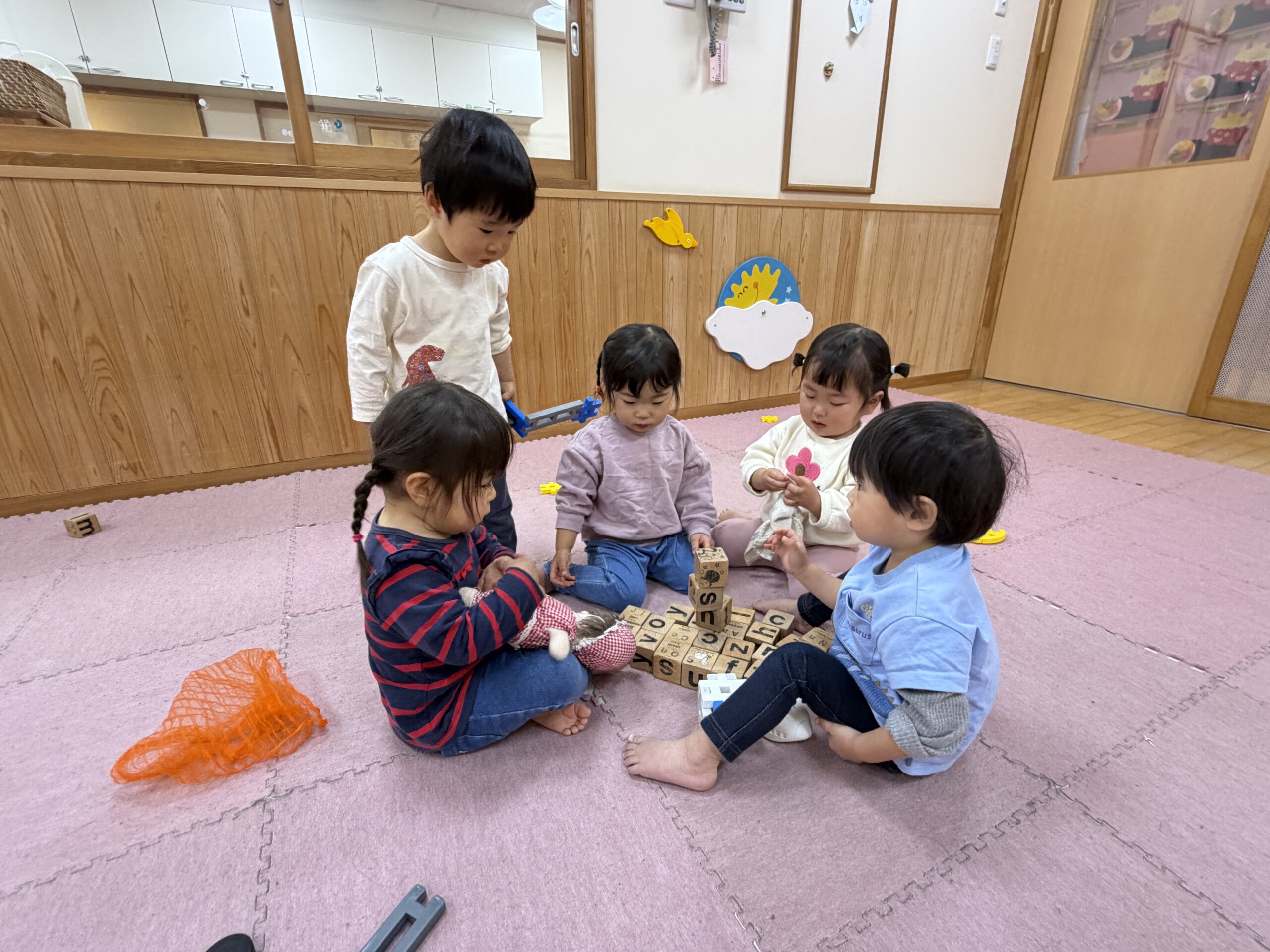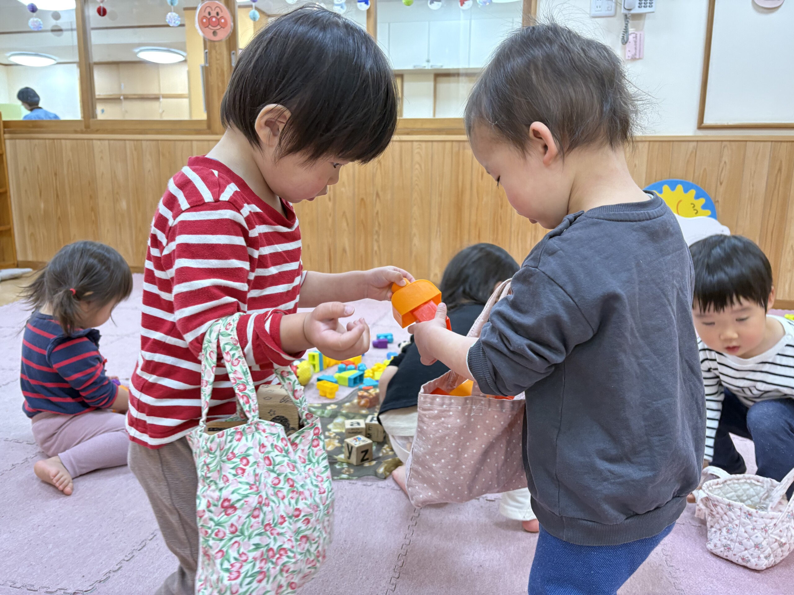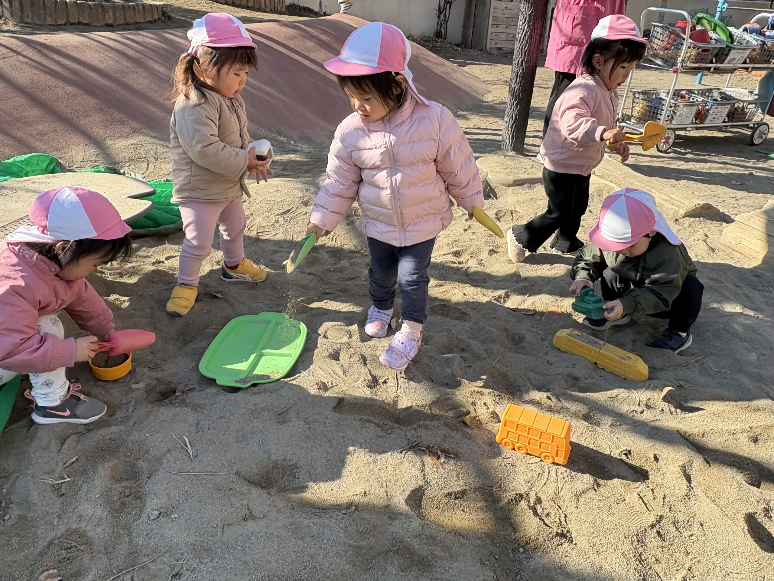| 朝晩はまだまだ寒い日が続いていますが、日中はポカポカ陽気で元気いっぱい戸外遊びを楽しむ子ども達です。あひる組での生活も残りわずかとなりました。あんなに小さかった子ども達もグーンと成長し、身の回りの事を「自分で!」とチャレンジする姿も見られ、今ではたくさんの事ができるようになりました。お友達との関わりも増えてきて、名前を呼んでみたり、泣いている子には「はい、どーぞ!」と玩具を渡してみたり、「だいじょーぶ?」と頭を“よしよし”と撫でてあげるなど微笑ましいやり取りも!