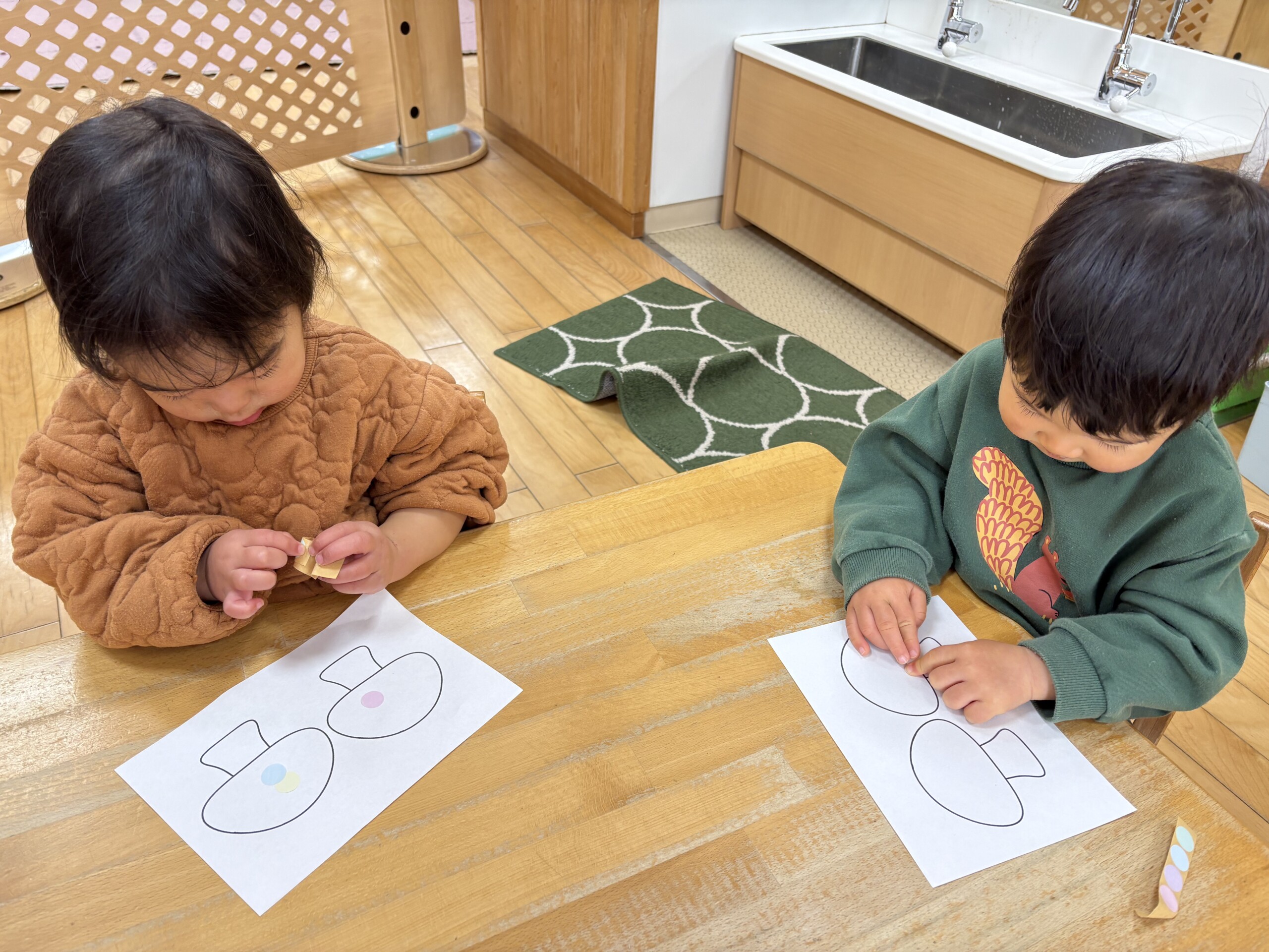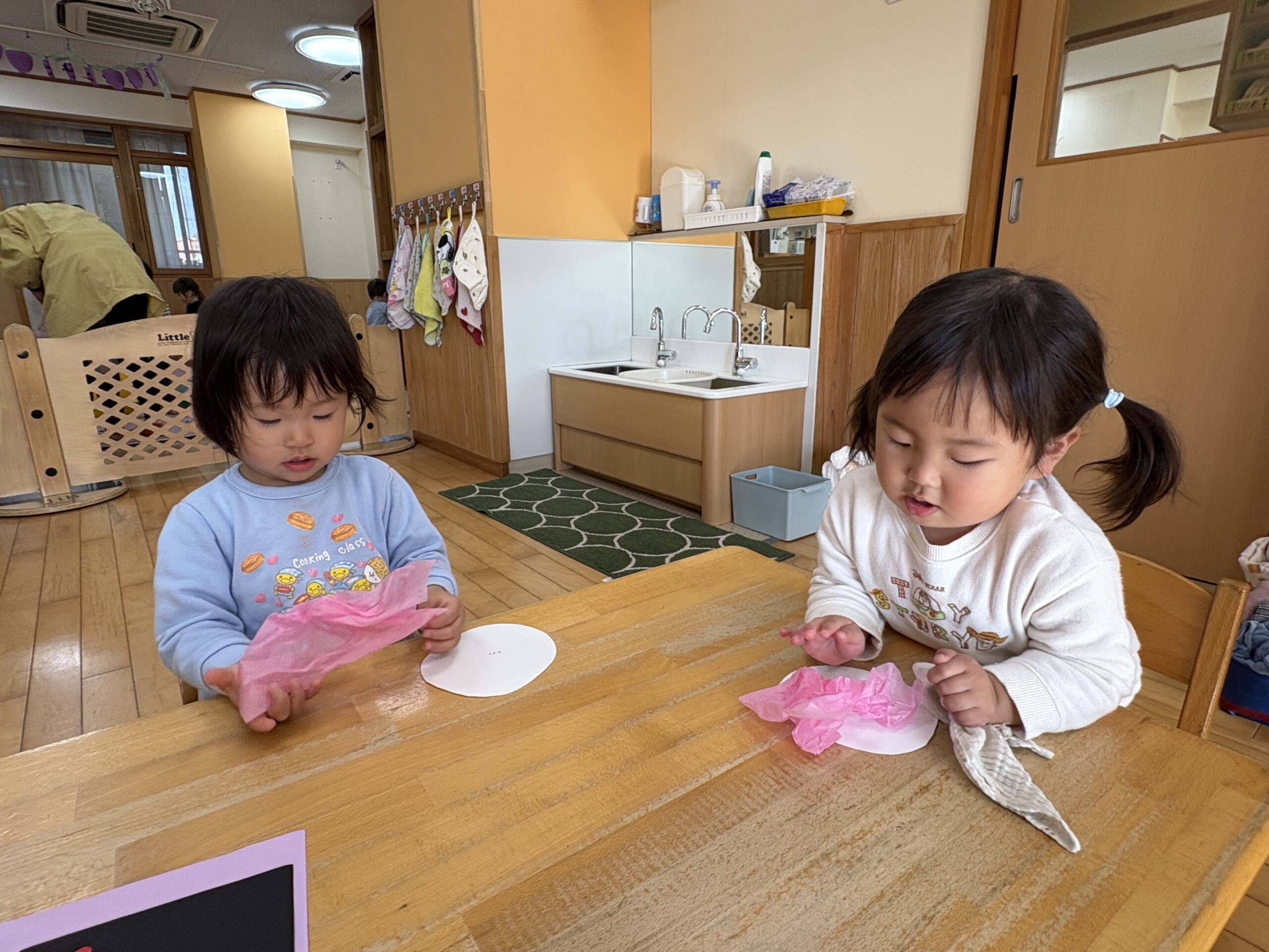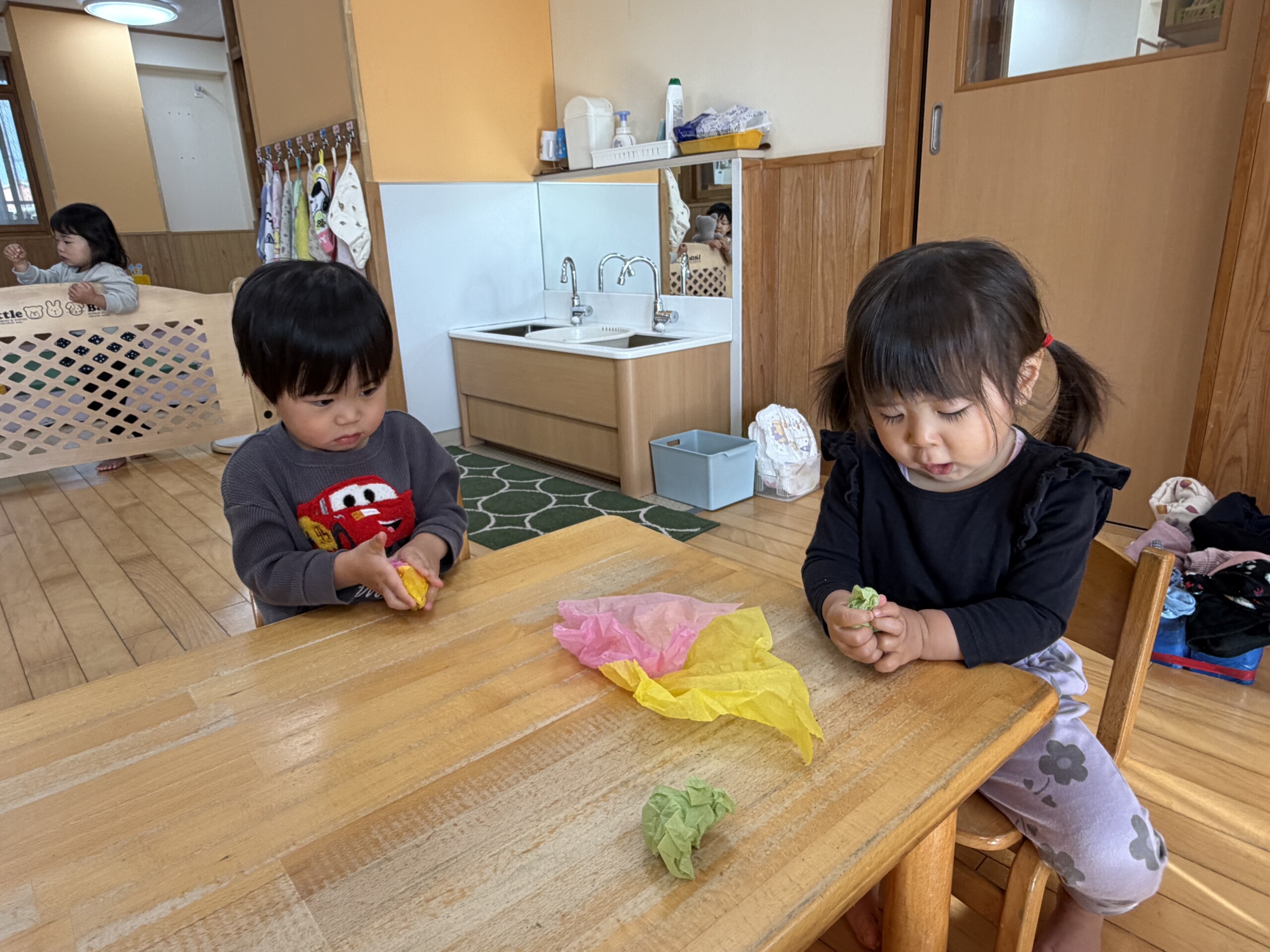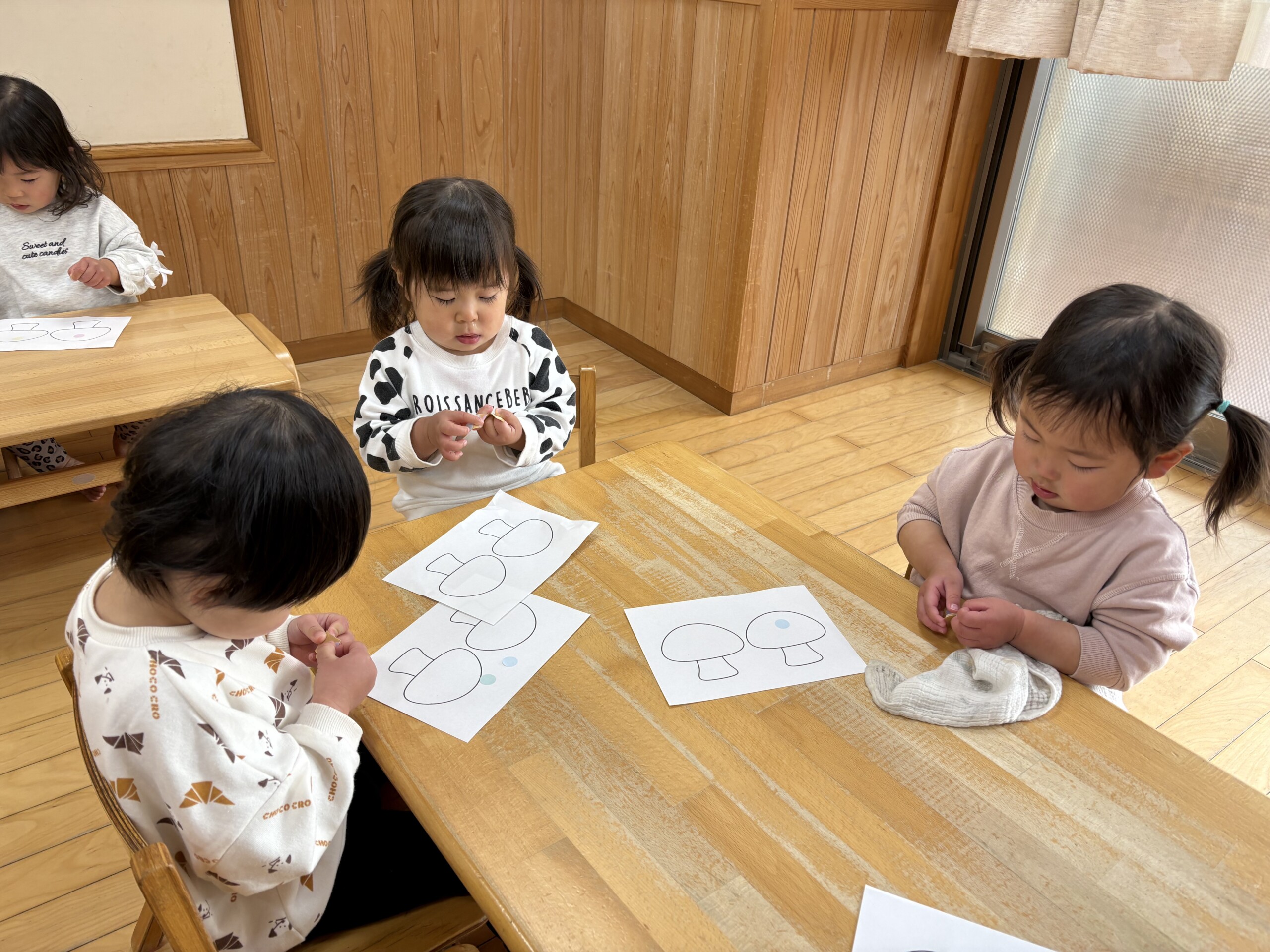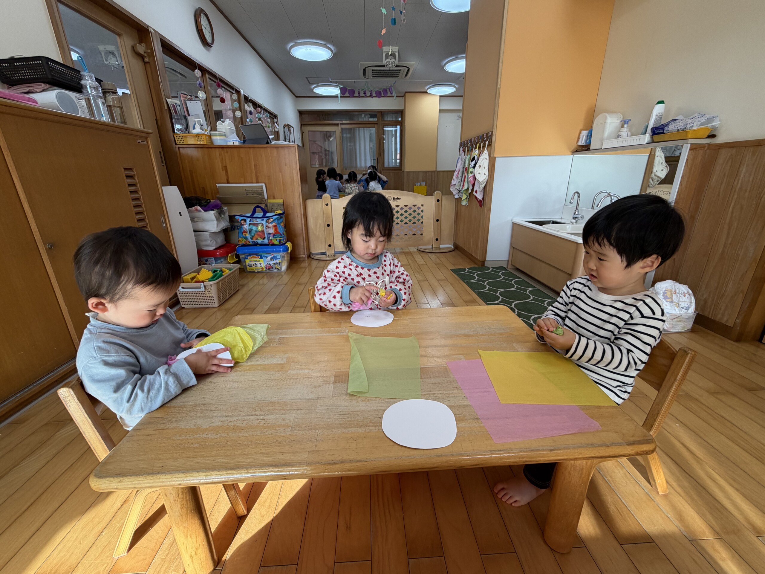 2月の製作の様子です!花紙を丸めて恵方巻きの具を作りました!