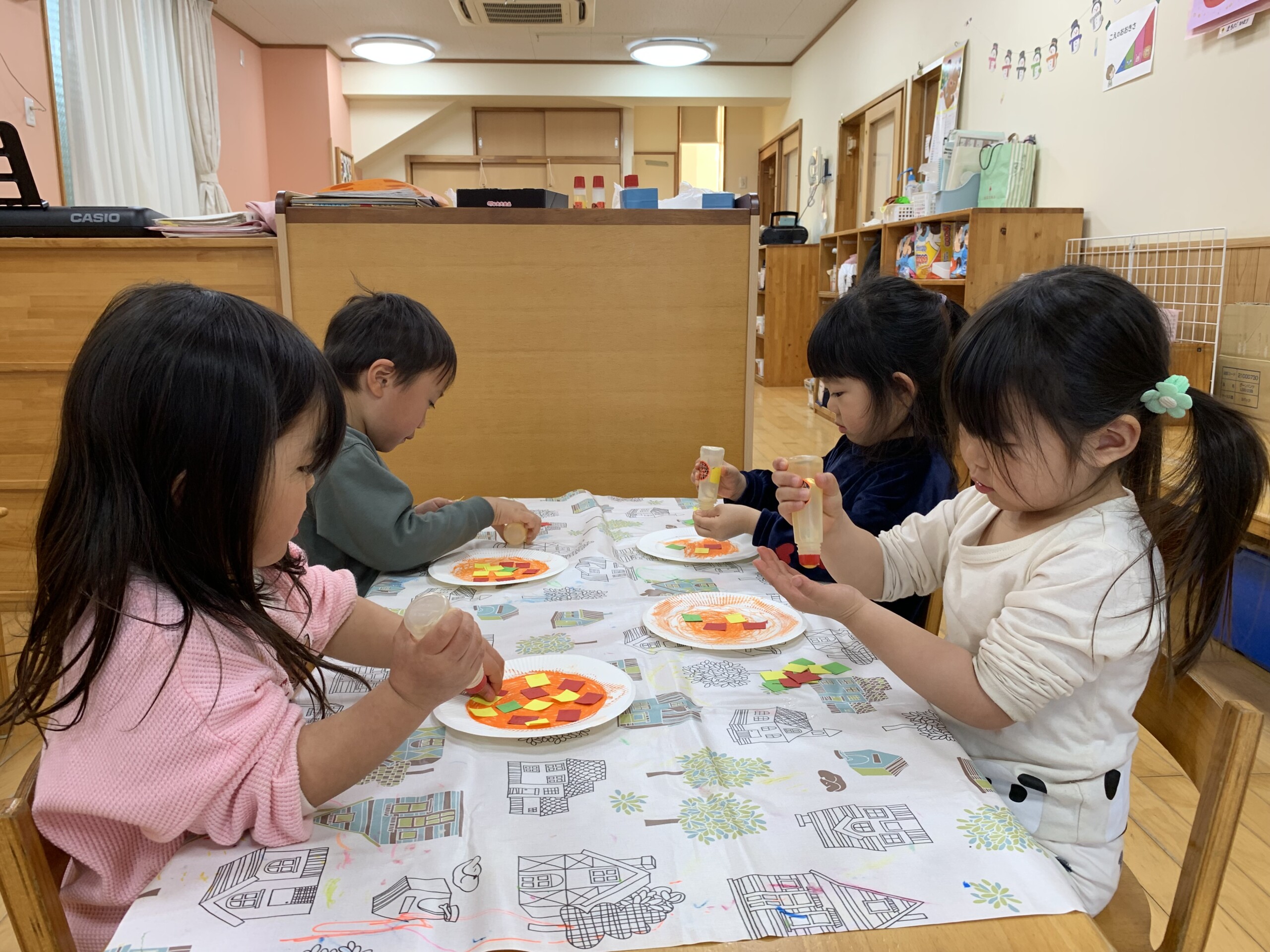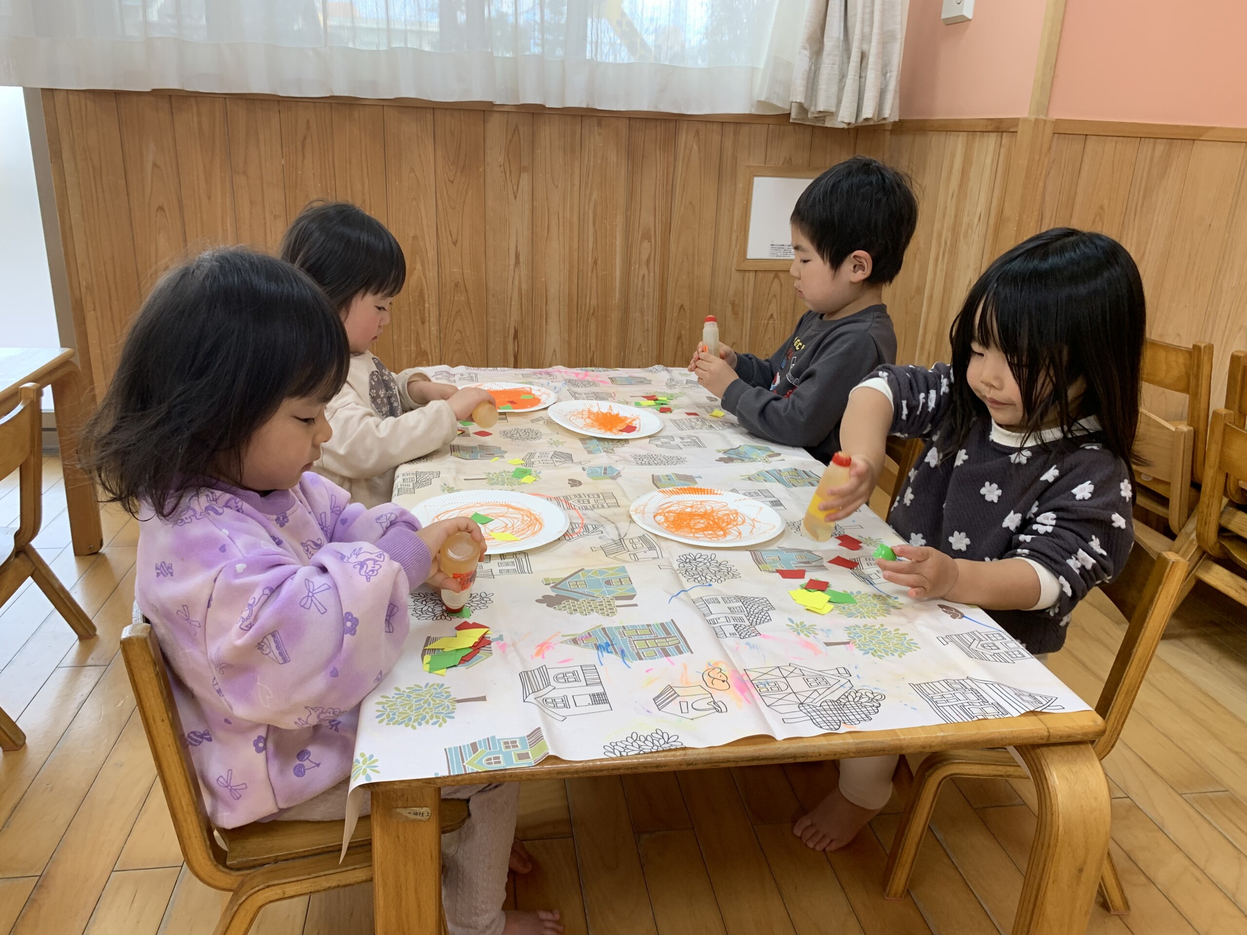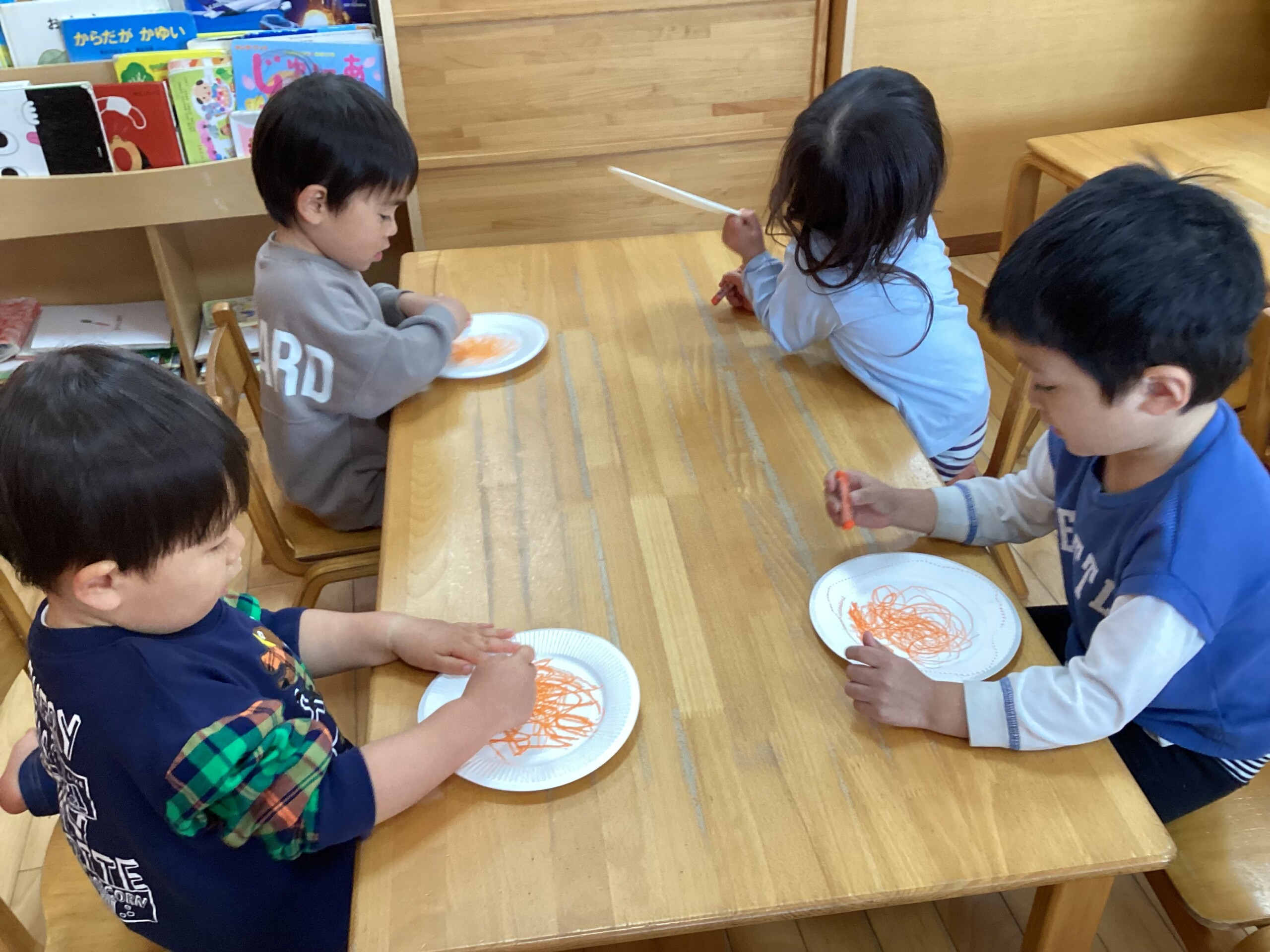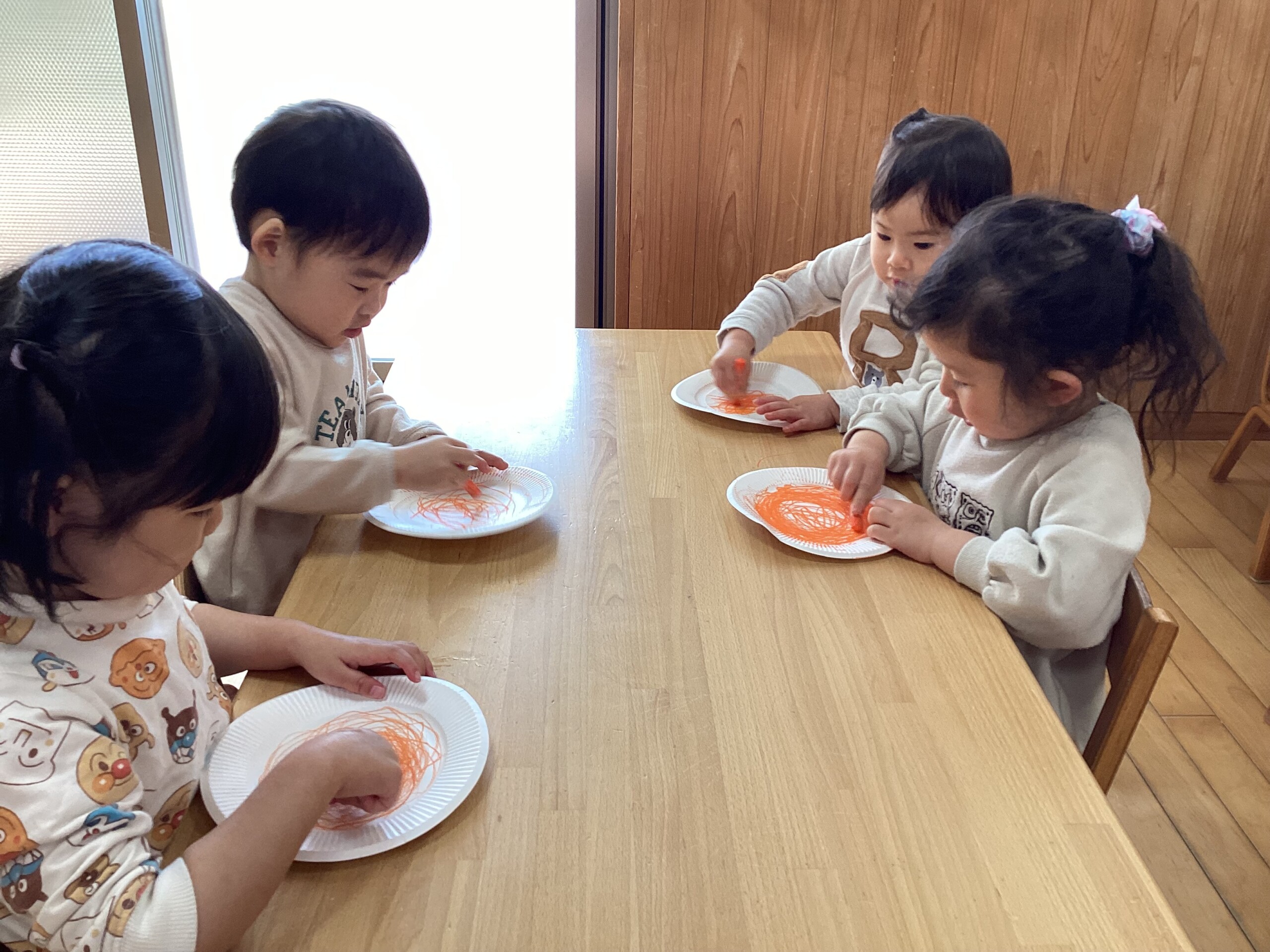 紙皿にクレヨンでスパゲッティを書いて、細長い紙をハサミで切って、のりをつけて貼りました。