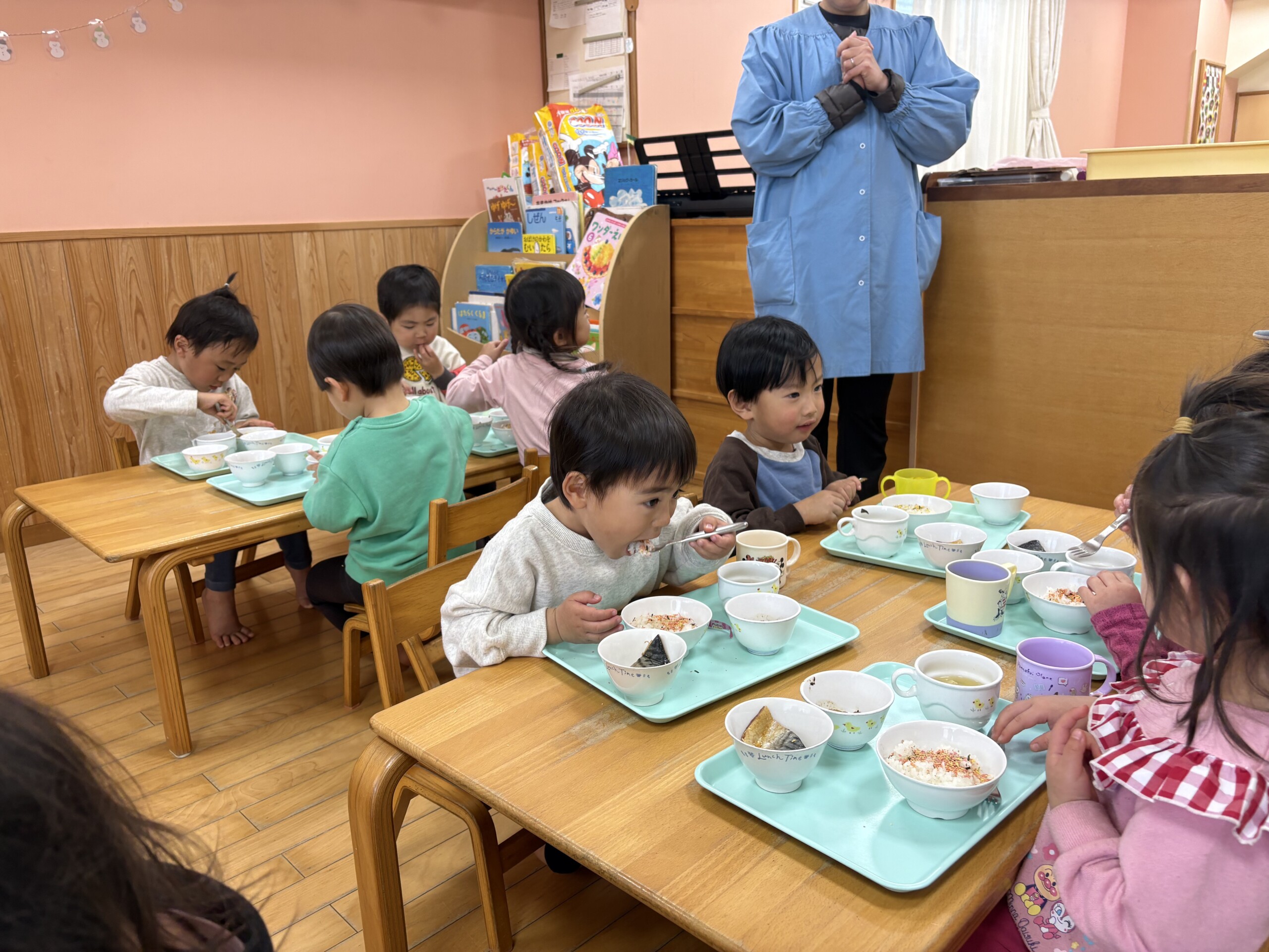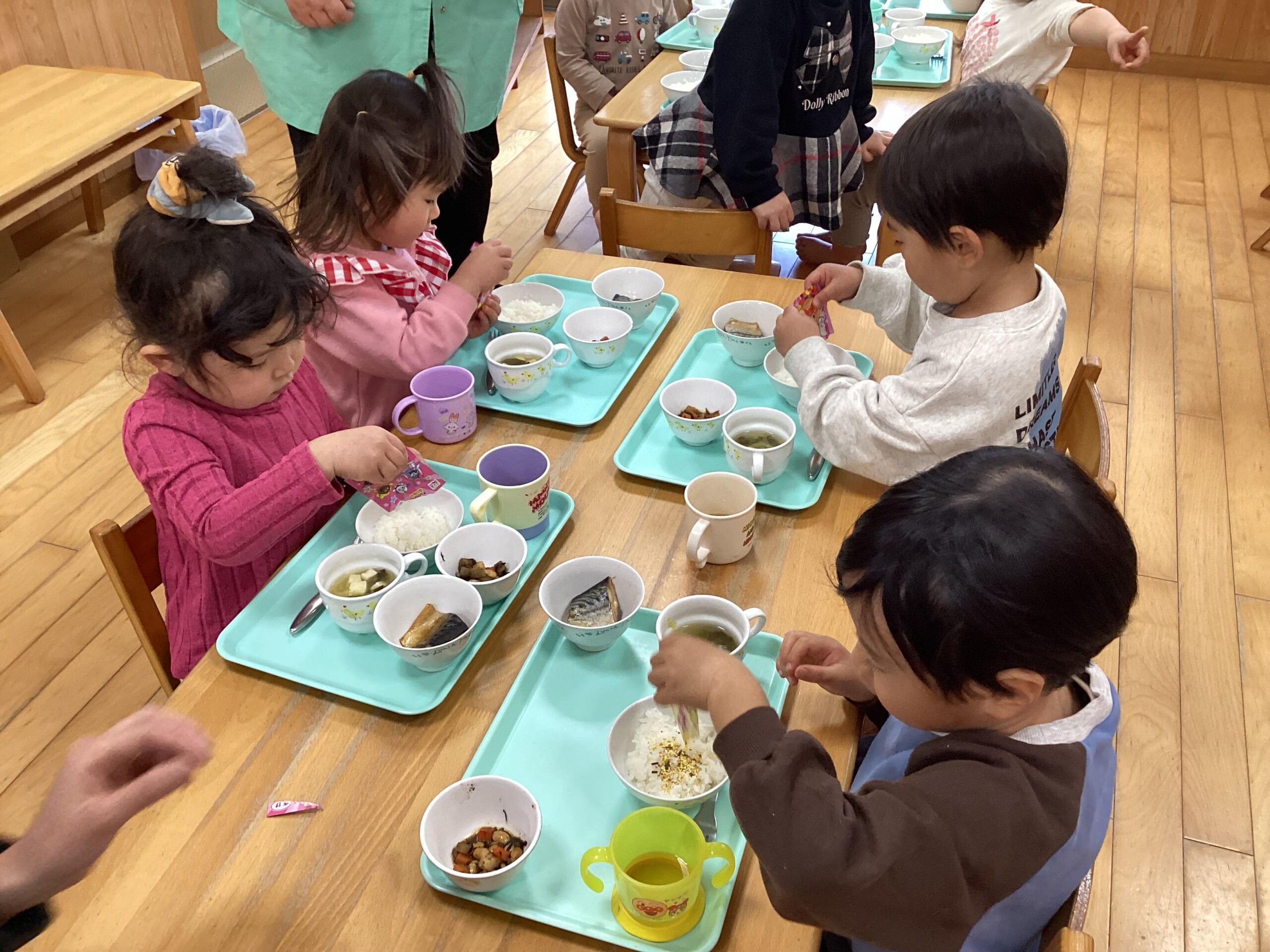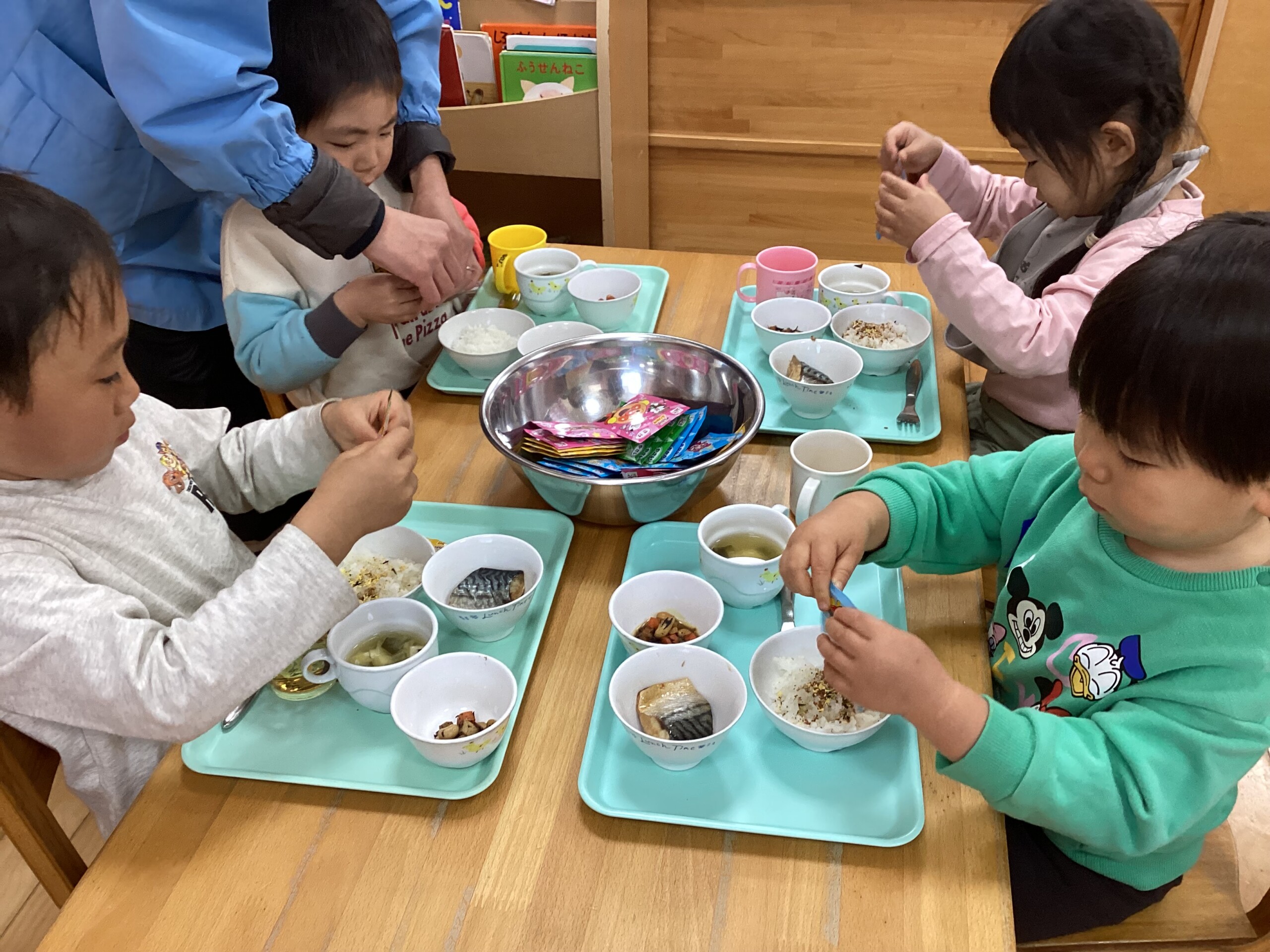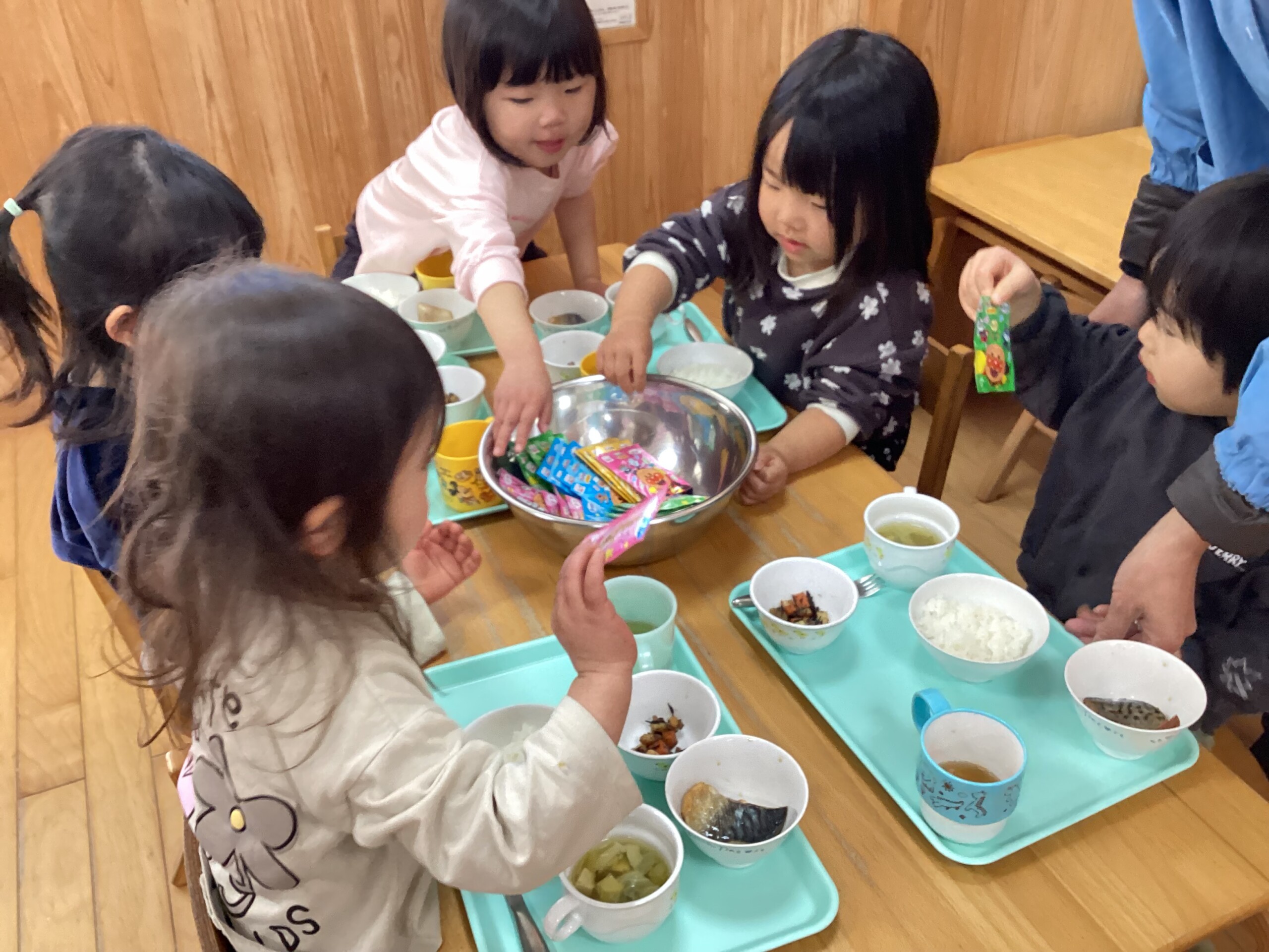 自分で好きなふりかけを選んでご飯にかけました。上手にひとりでかけられました。