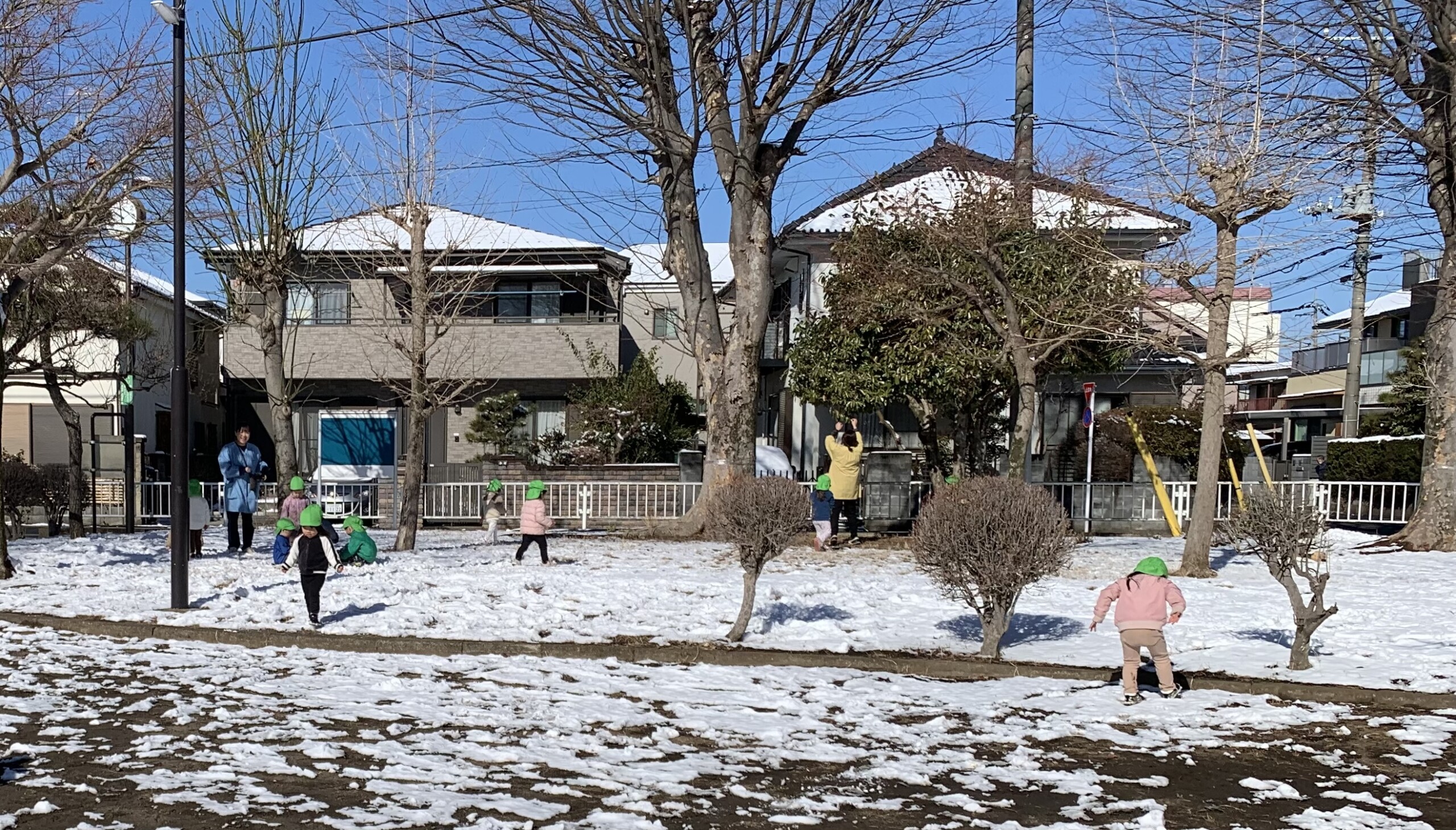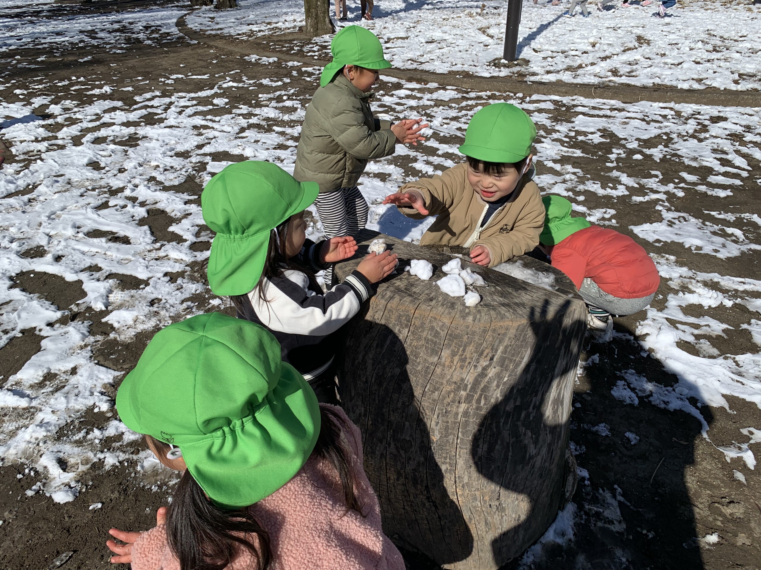 白はけ公園で雪遊びをしました。「つめたーい。」と言いながら雪の玉を作って雪合戦やおだんごやさんをしました。