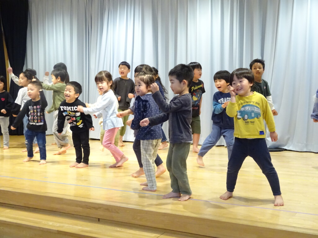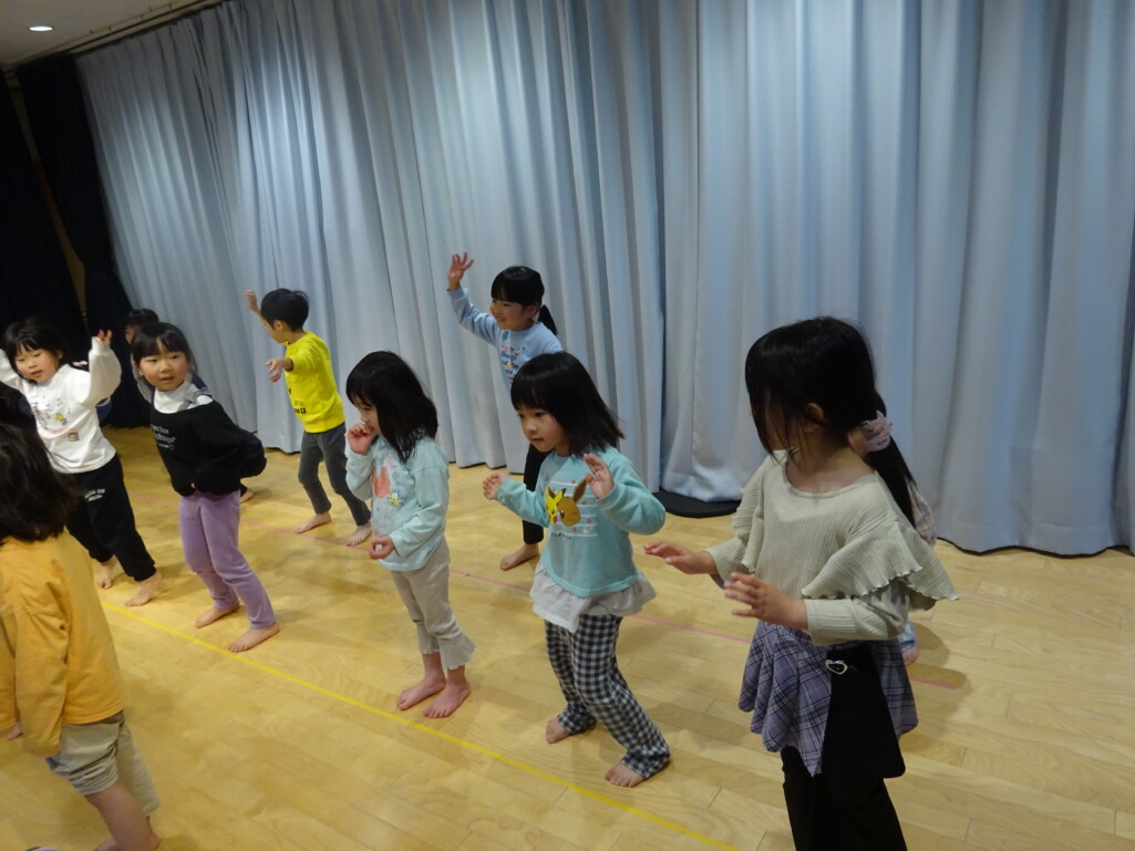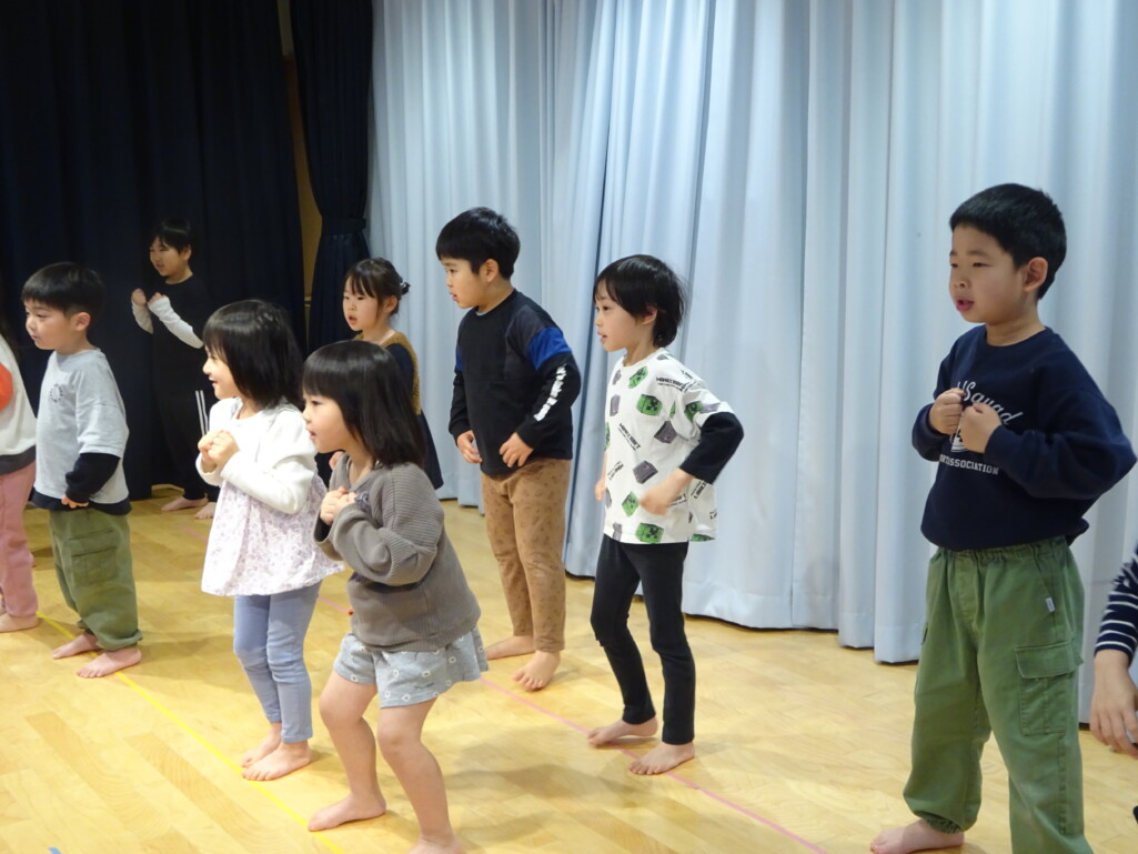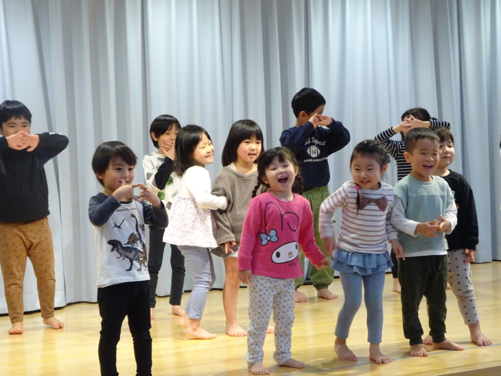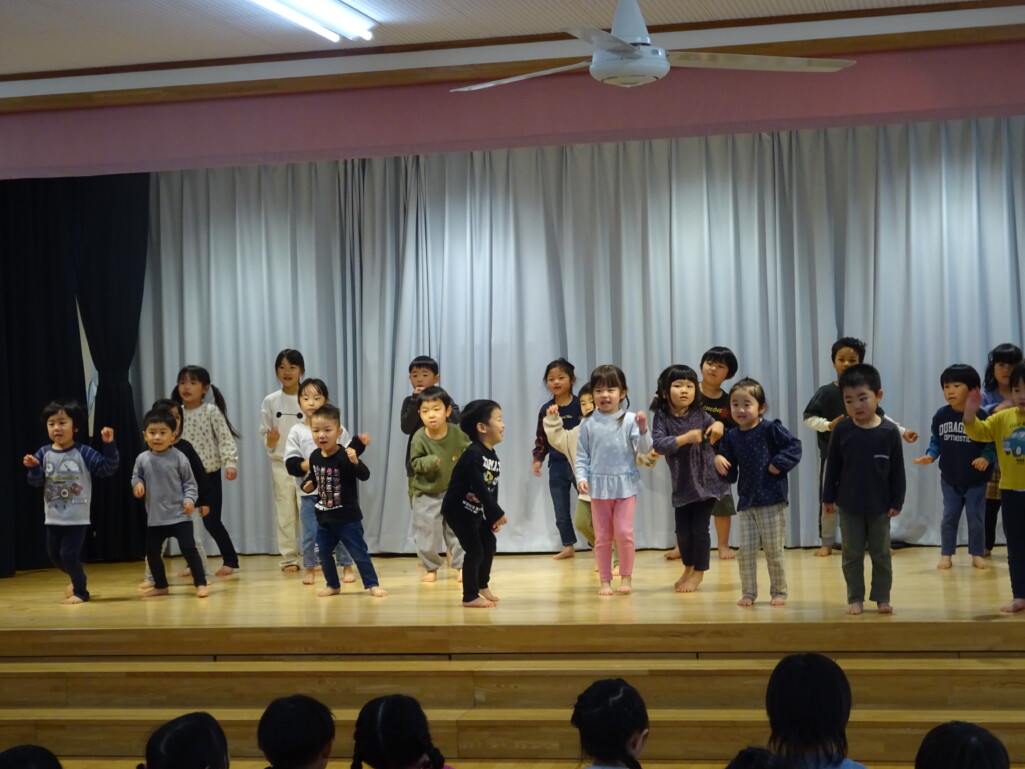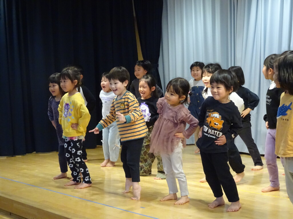 3月5日₍木)3月生まれのお友達の誕生会がありました。誕生児のお友達の紹介や『ハッピーフレンズ』の歌でお祝いをした後は、季節の歌『春が来た』を歌いました。今月のお楽しみは縦割りグループの出し物で、しか組、くま組、きりん組さんが3グループに分かれ、この日に向けて練習した『カリスマックス』『アパトゥ(APT)』『Bling-Bang-Bang-Born』のダンスの発表をしました。舞台に立つと恥ずかしそうにしている子もいましたが、どの子も自信満々で楽しそうに踊っていました。 太田
