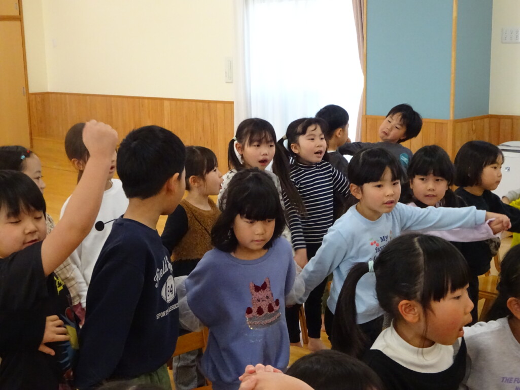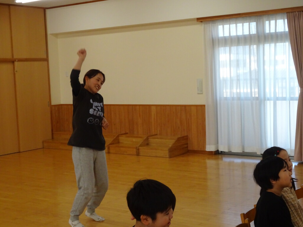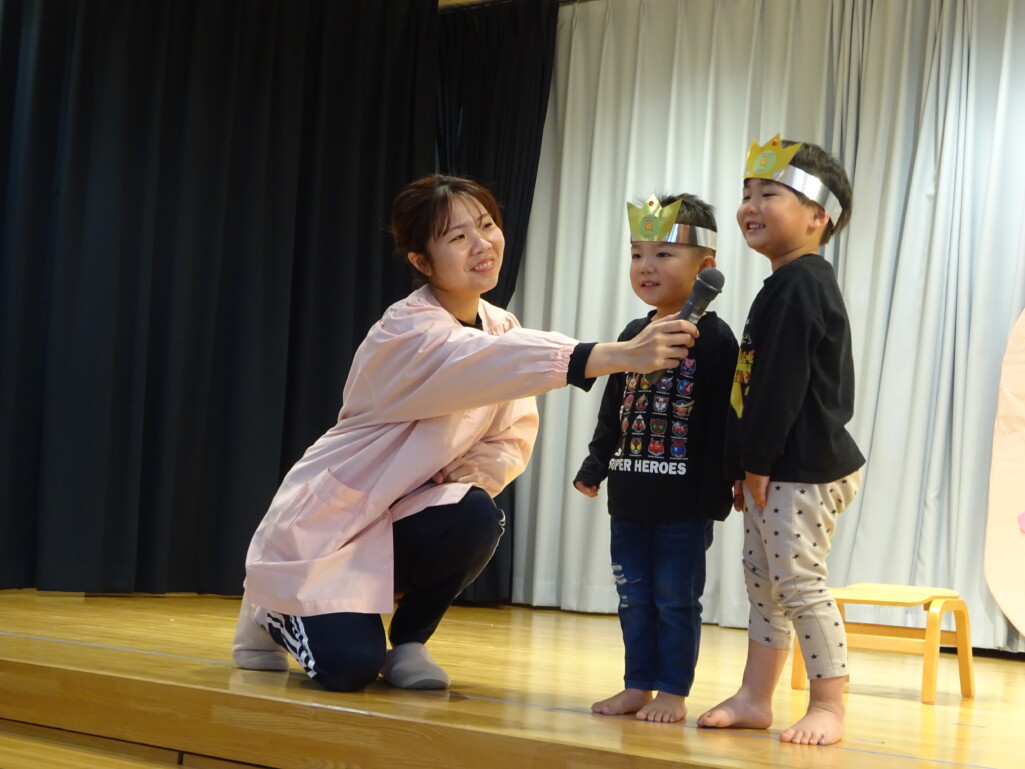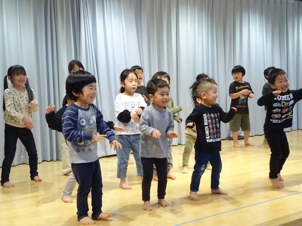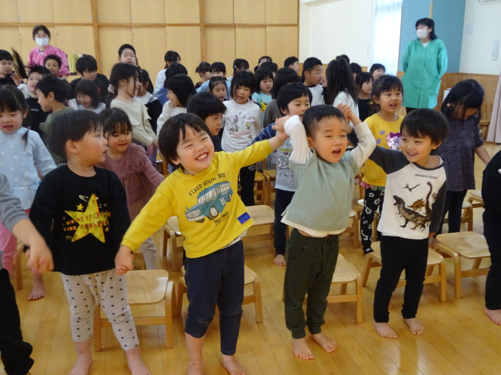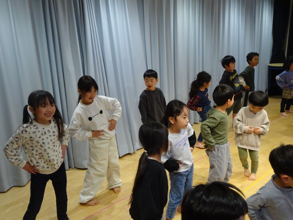 3月5日₍木)3月生まれのお友達の誕生会がありました。誕生児のお友達の紹介や『ハッピーフレンズ』の歌でお祝いをした後は、季節の歌『春が来た』を歌いました。今月のお楽しみは縦割りグループの出し物で、しか組、くま組、きりん組さんが3グループに分かれ、この日に向けて練習した『カリスマックス』『アパトゥ(APT)』『Bling-Bang-Bang-Born』のダンスの発表をしました。舞台に立つと恥ずかしそうにしている子もいましたが、どの子も自信満々で楽しそうに踊っていました。 太田