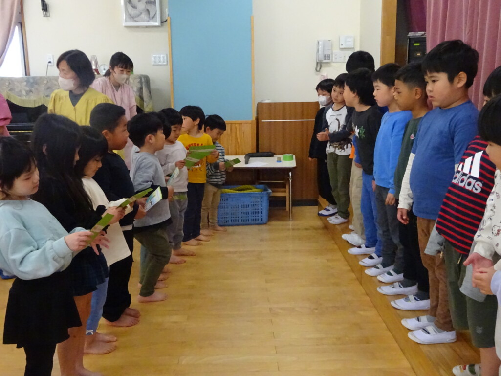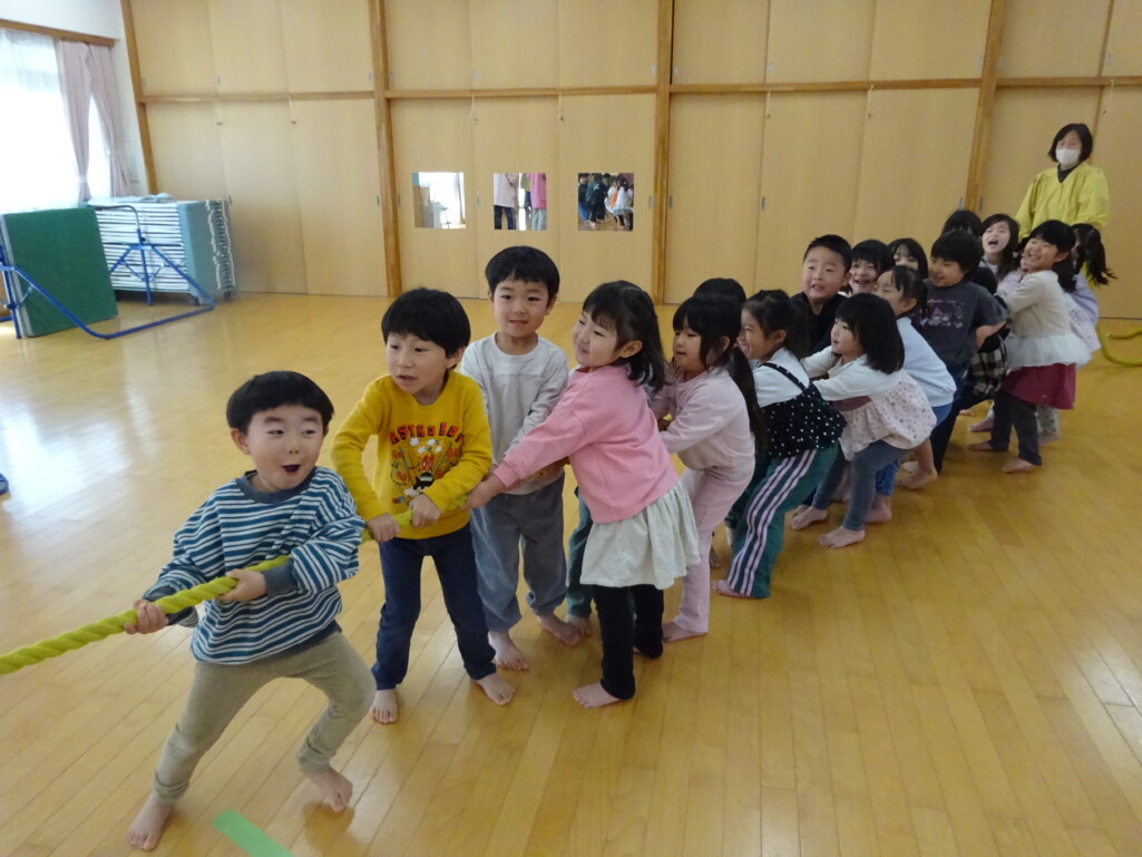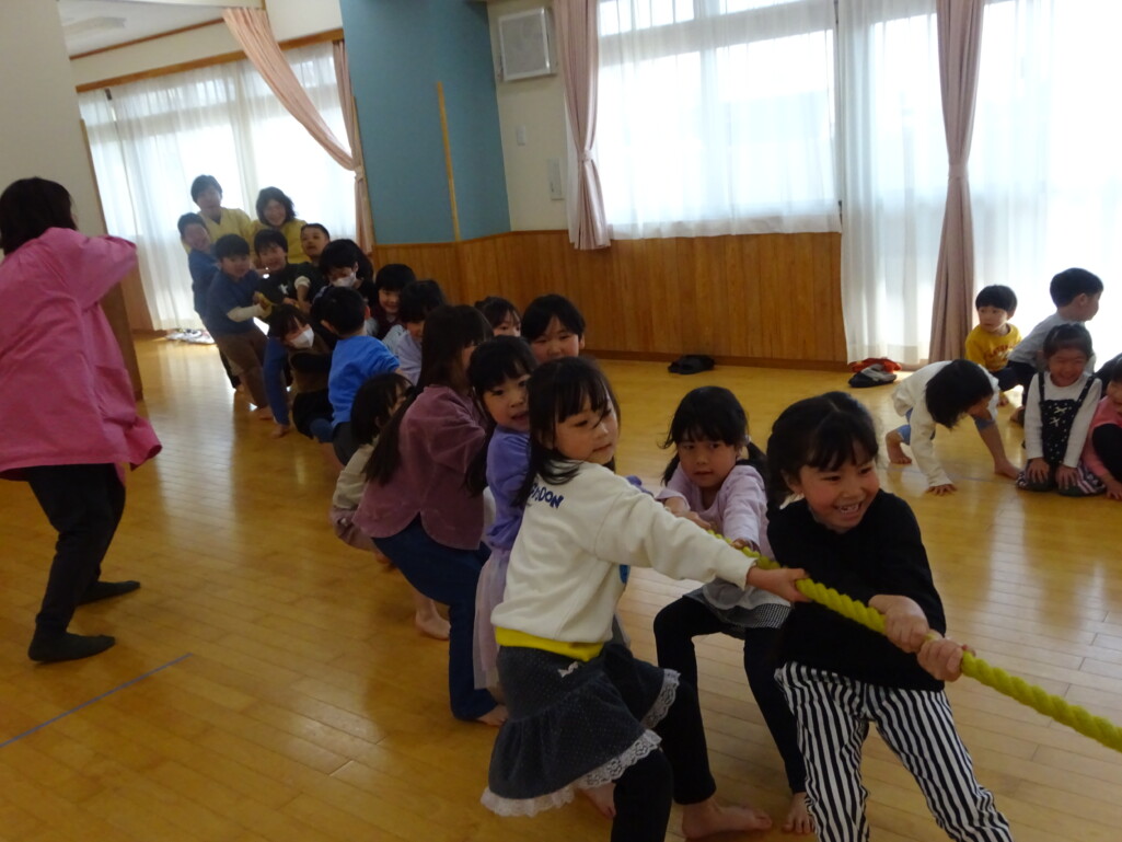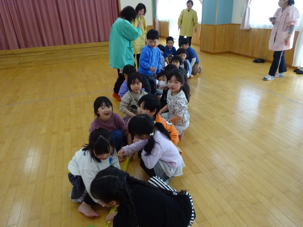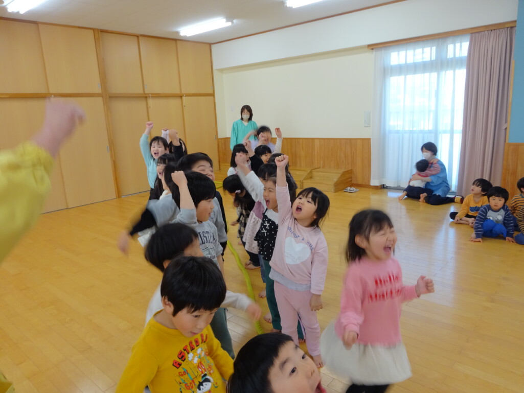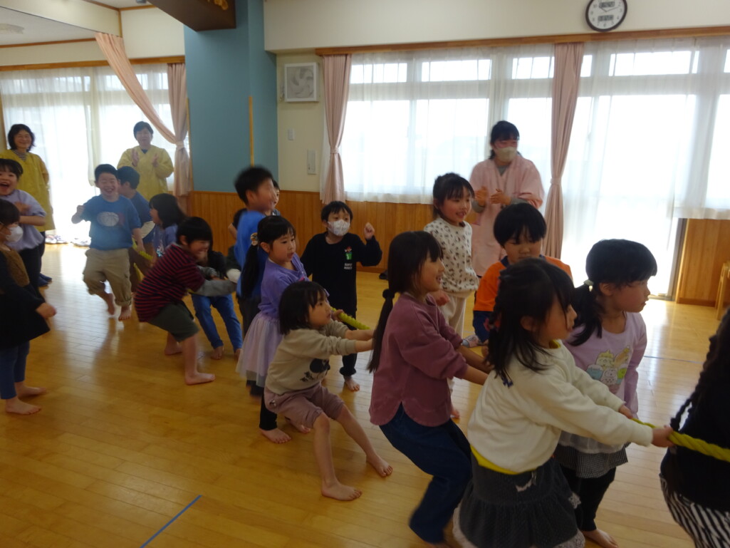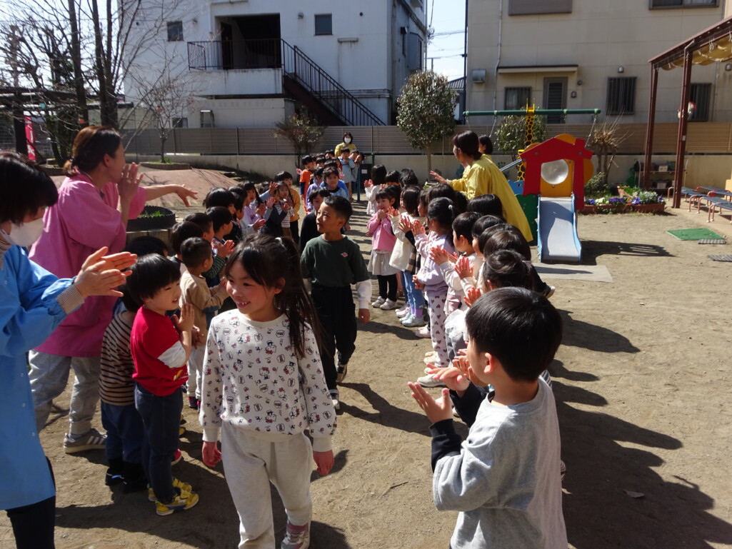 3月12日(木) みつばちホールで、5歳児きりん組さんのお別れ会がありました。しか組、くま組さんから、きりん組さんそれぞれの似顔絵付きのカードのプレゼントと、「がんばれ1ねんせい‼」と、エールをもらいました。お楽しみタイムでは、しか組さんとペアを組んで『デカパン競争』。『綱引き対決』では、くま組さんと対戦し、その後には“先生チーム”と対戦して子ども達も職員も気合が入り応援も盛り上がりました。園庭では『宝探し』をしました。園庭の所々に隠した“宝のカード”を探し、“幸せのお菓子”と交換してみんなで食べました。最後には花道をつくり、きりん組さんに“タッチ”をしてもらいながら送りました。今日の給食はバイキングで、くま組、きりん組さんは一緒に会食しました。 太田