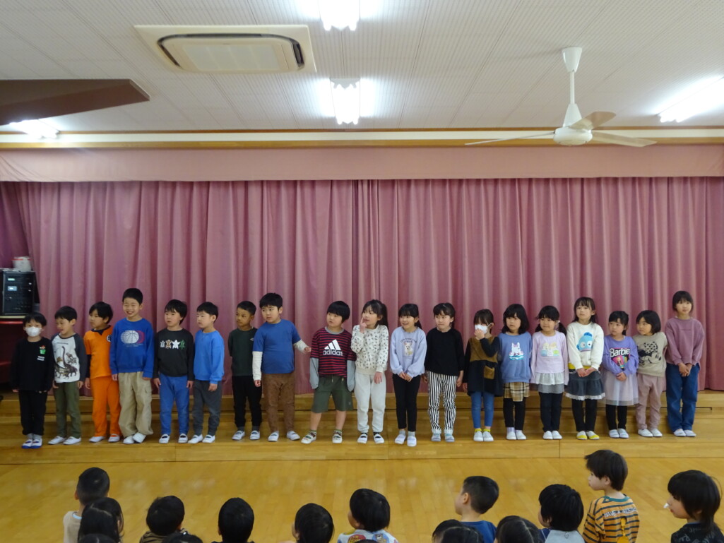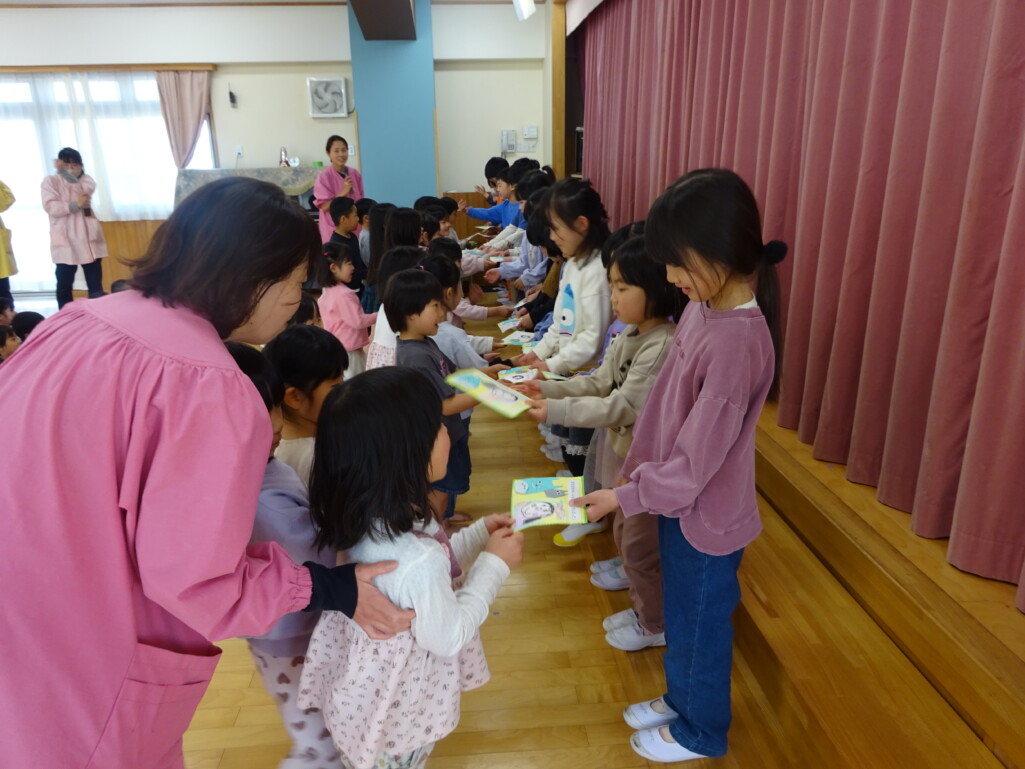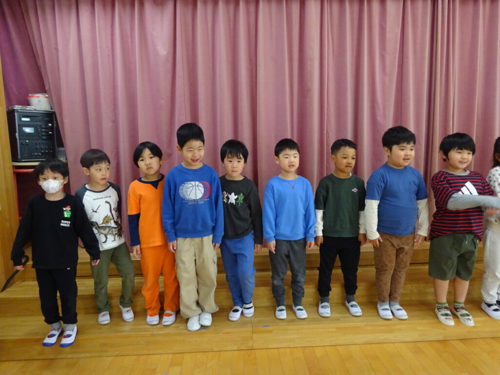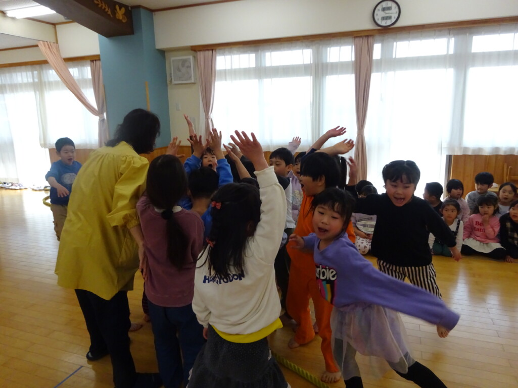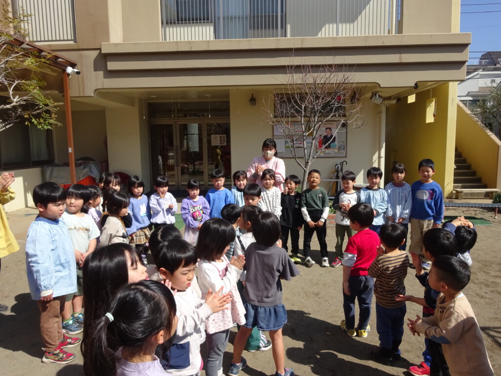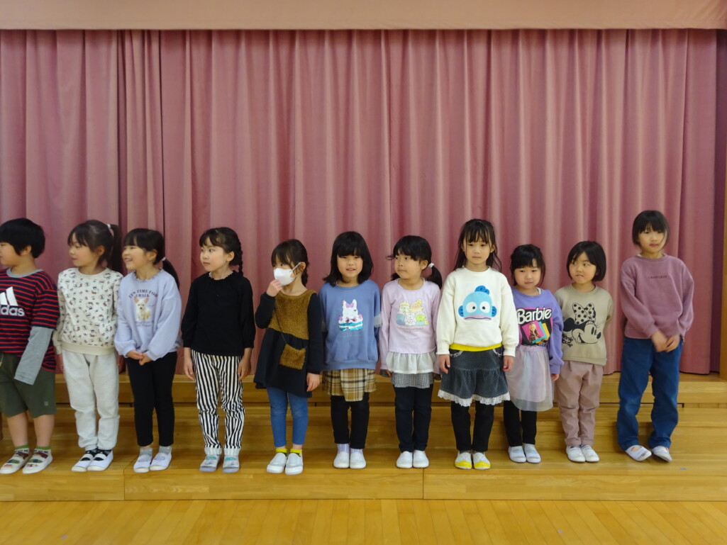 3月12日(木) みつばちホールで、5歳児きりん組さんのお別れ会がありました。しか組、くま組さんから、きりん組さんそれぞれの似顔絵付きのカードのプレゼントと、「がんばれ1ねんせい‼」と、エールをもらいました。お楽しみタイムでは、しか組さんとペアを組んで『デカパン競争』。『綱引き対決』では、くま組さんと対戦し、その後には“先生チーム”と対戦して子ども達も職員も気合が入り応援も盛り上がりました。園庭では『宝探し』をしました。園庭の所々に隠した“宝のカード”を探し、“幸せのお菓子”と交換してみんなで食べました。最後には花道をつくり、きりん組さんに“タッチ”をしてもらいながら送りました。今日の給食はバイキングで、くま組、きりん組さんは一緒に会食しました。 太田