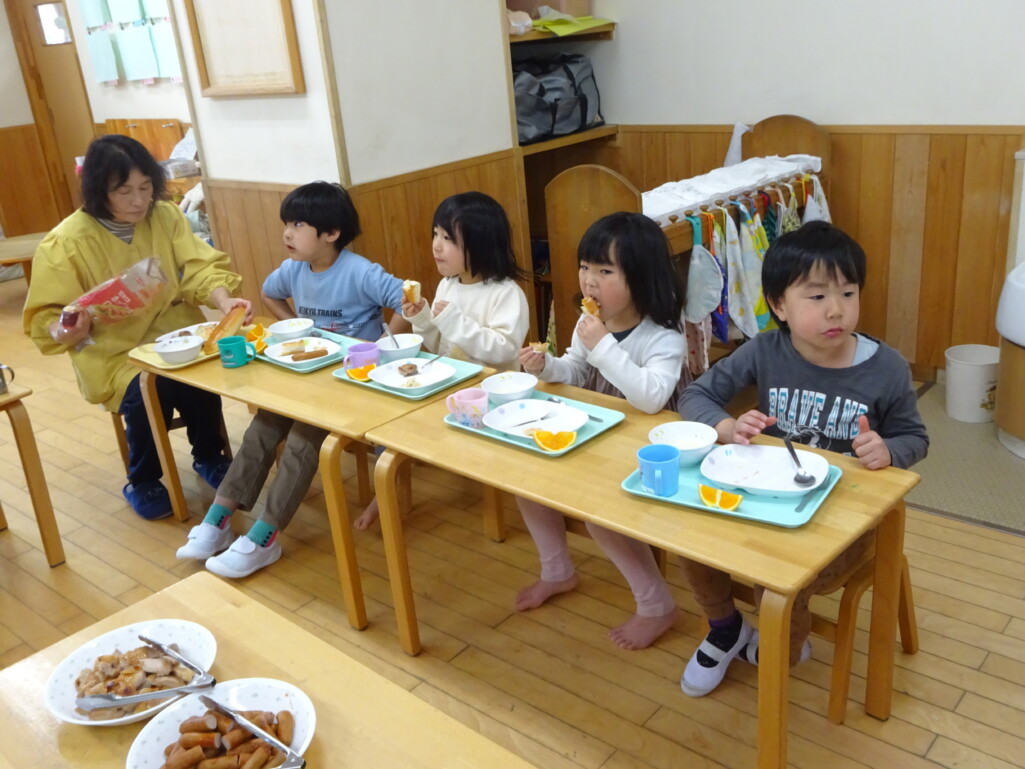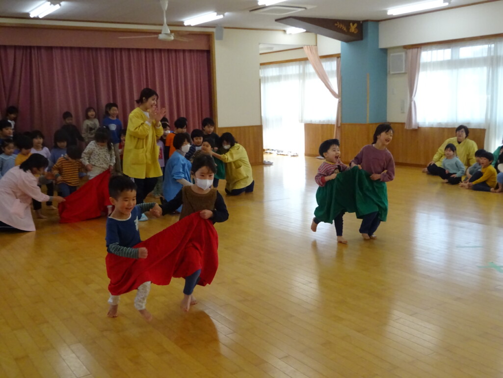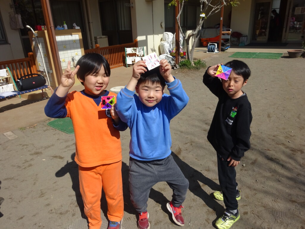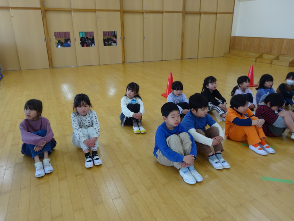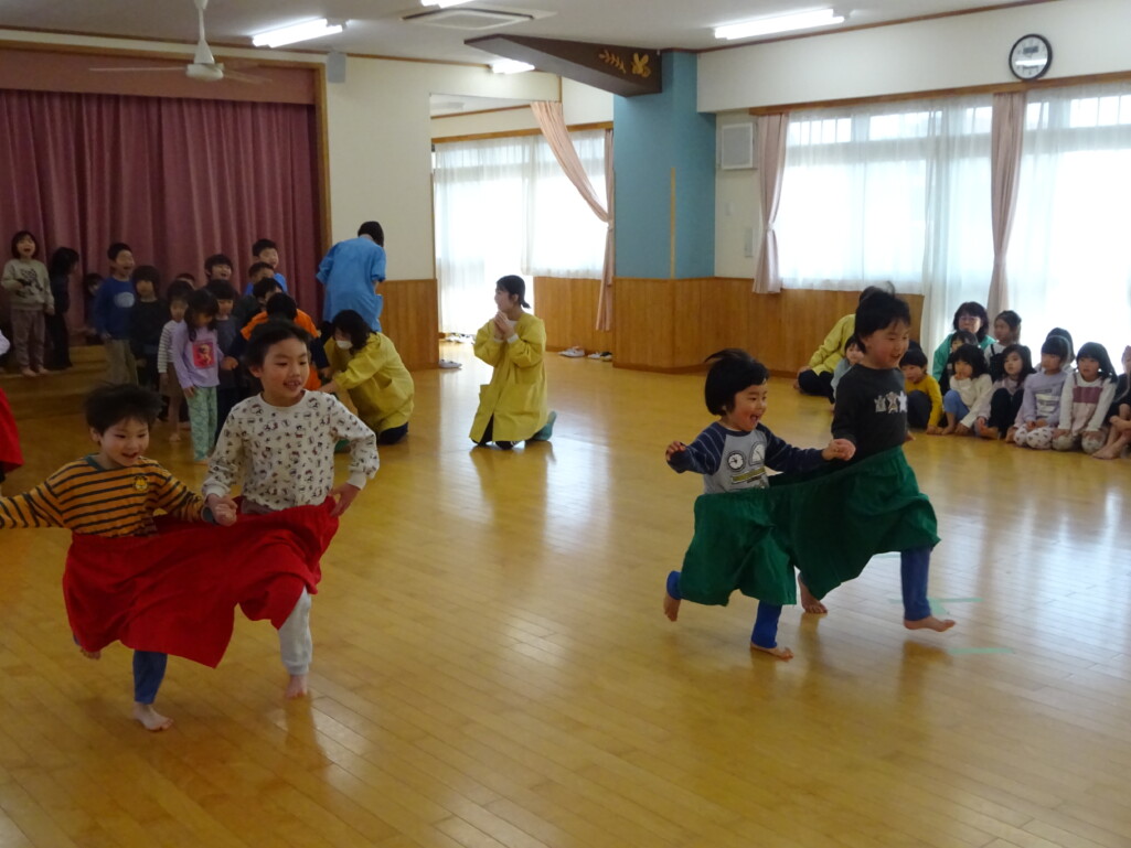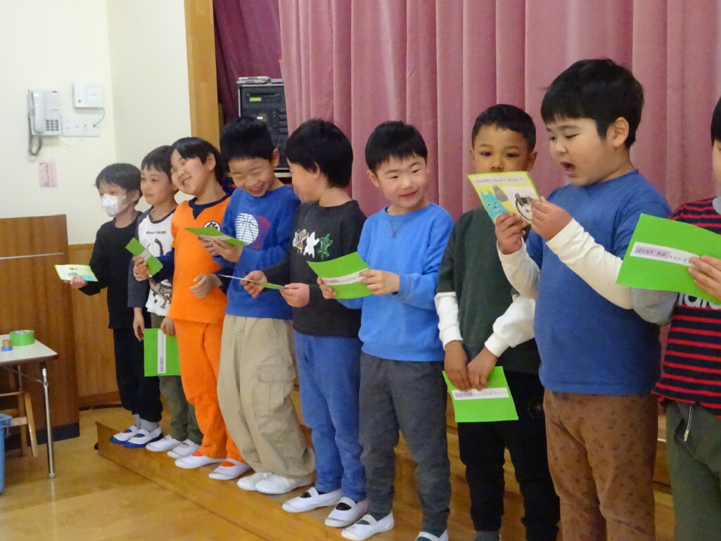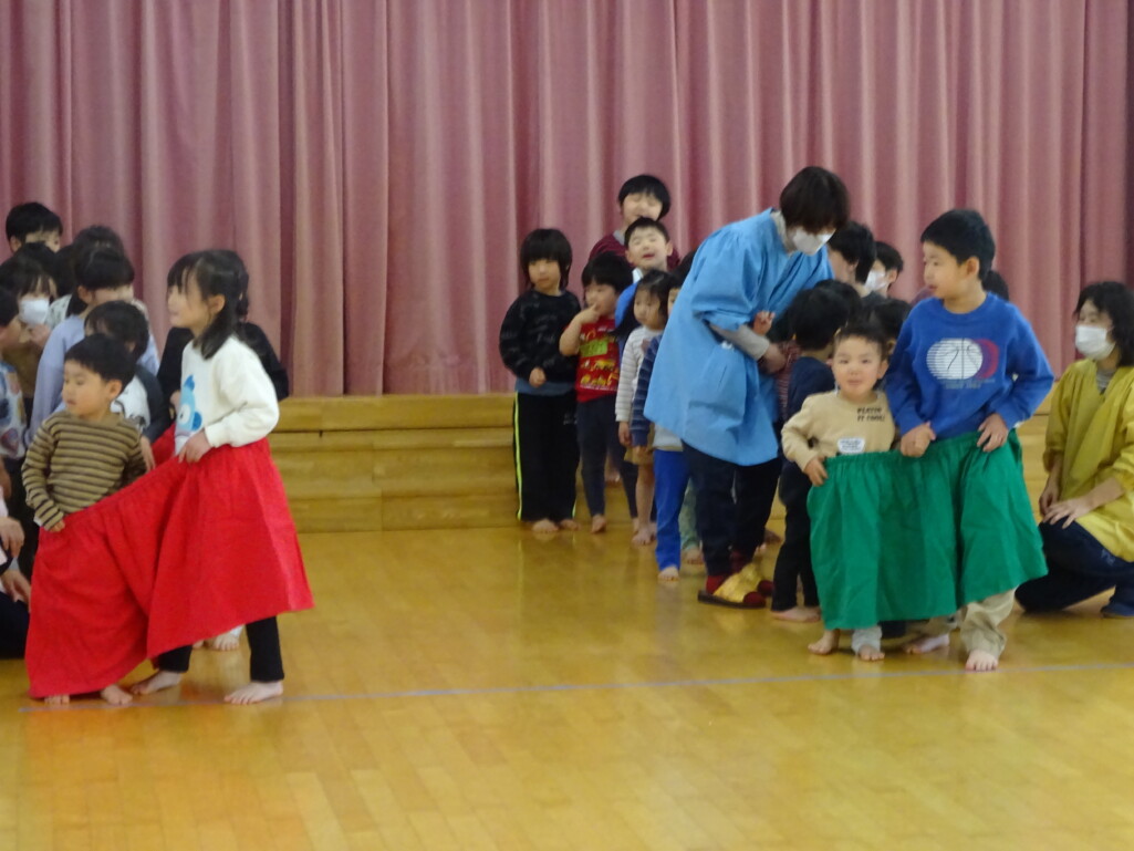 3月12日(木) みつばちホールで、5歳児きりん組さんのお別れ会がありました。しか組、くま組さんから、きりん組さんそれぞれの似顔絵付きのカードのプレゼントと、「がんばれ1ねんせい‼」と、エールをもらいました。お楽しみタイムでは、しか組さんとペアを組んで『デカパン競争』。『綱引き対決』では、くま組さんと対戦し、その後には“先生チーム”と対戦して子ども達も職員も気合が入り応援も盛り上がりました。園庭では『宝探し』をしました。園庭の所々に隠した“宝のカード”を探し、“幸せのお菓子”と交換してみんなで食べました。最後には花道をつくり、きりん組さんに“タッチ”をしてもらいながら送りました。今日の給食はバイキングで、くま組、きりん組さんは一緒に会食しました。 太田