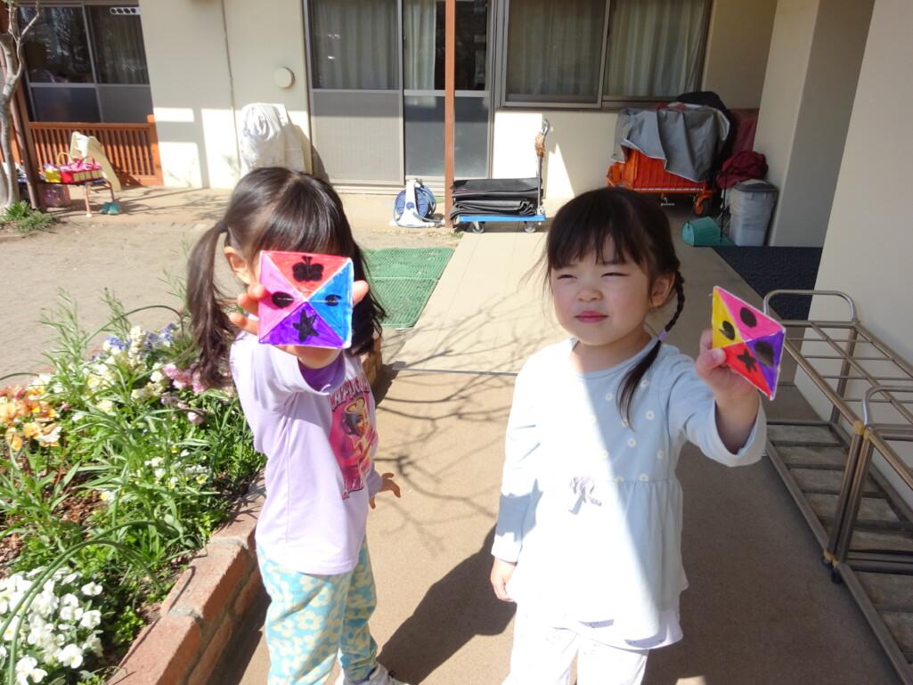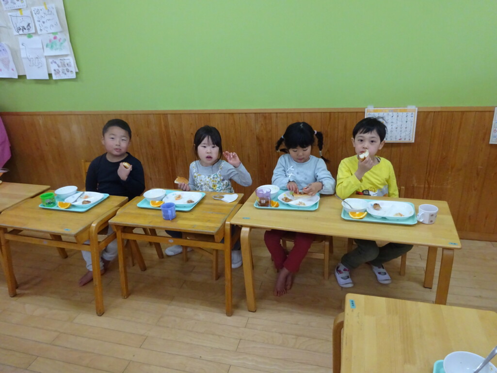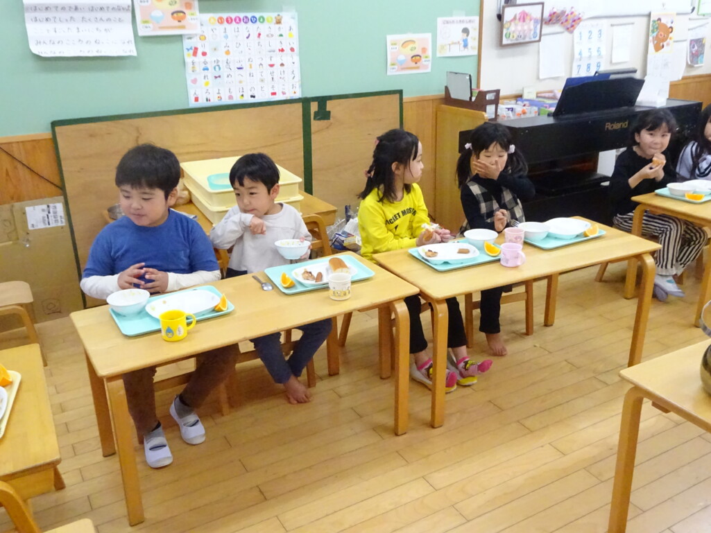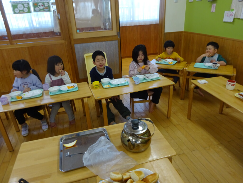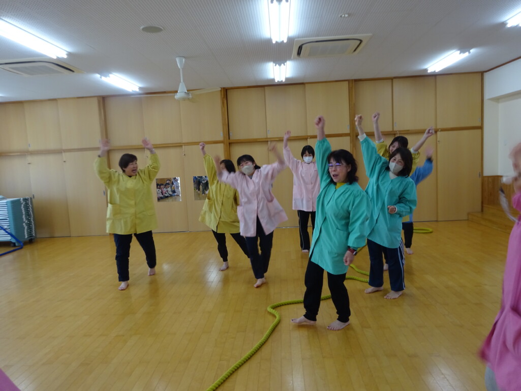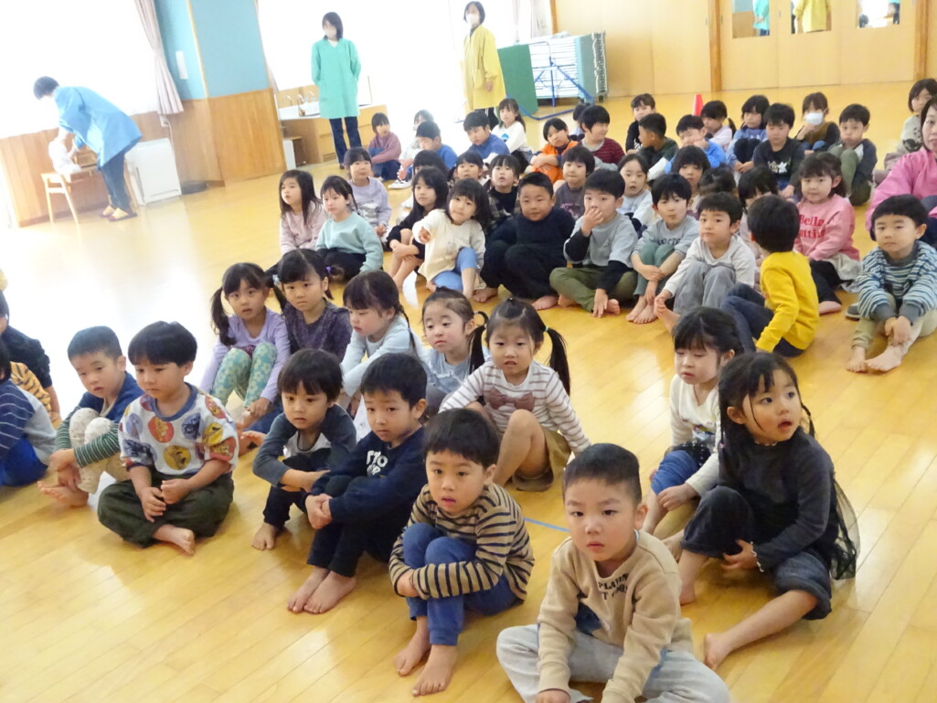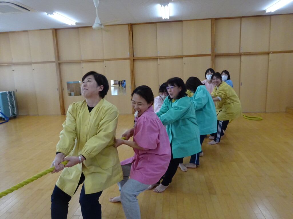 3月12日(木) みつばちホールで、5歳児きりん組さんのお別れ会がありました。しか組、くま組さんから、きりん組さんそれぞれの似顔絵付きのカードのプレゼントと、「がんばれ1ねんせい‼」と、エールをもらいました。お楽しみタイムでは、しか組さんとペアを組んで『デカパン競争』。『綱引き対決』では、くま組さんと対戦し、その後には“先生チーム”と対戦して子ども達も職員も気合が入り応援も盛り上がりました。園庭では『宝探し』をしました。園庭の所々に隠した“宝のカード”を探し、“幸せのお菓子”と交換してみんなで食べました。最後には花道をつくり、きりん組さんに“タッチ”をしてもらいながら送りました。今日の給食はバイキングで、くま組、きりん組さんは一緒に会食しました。 太田