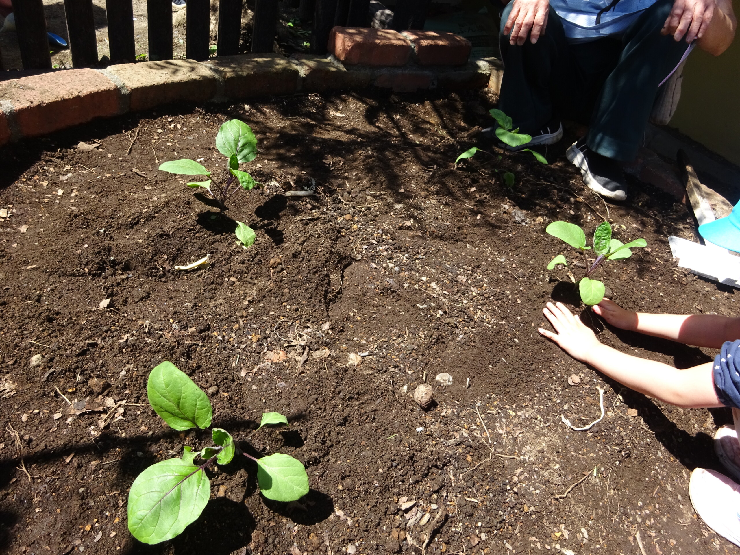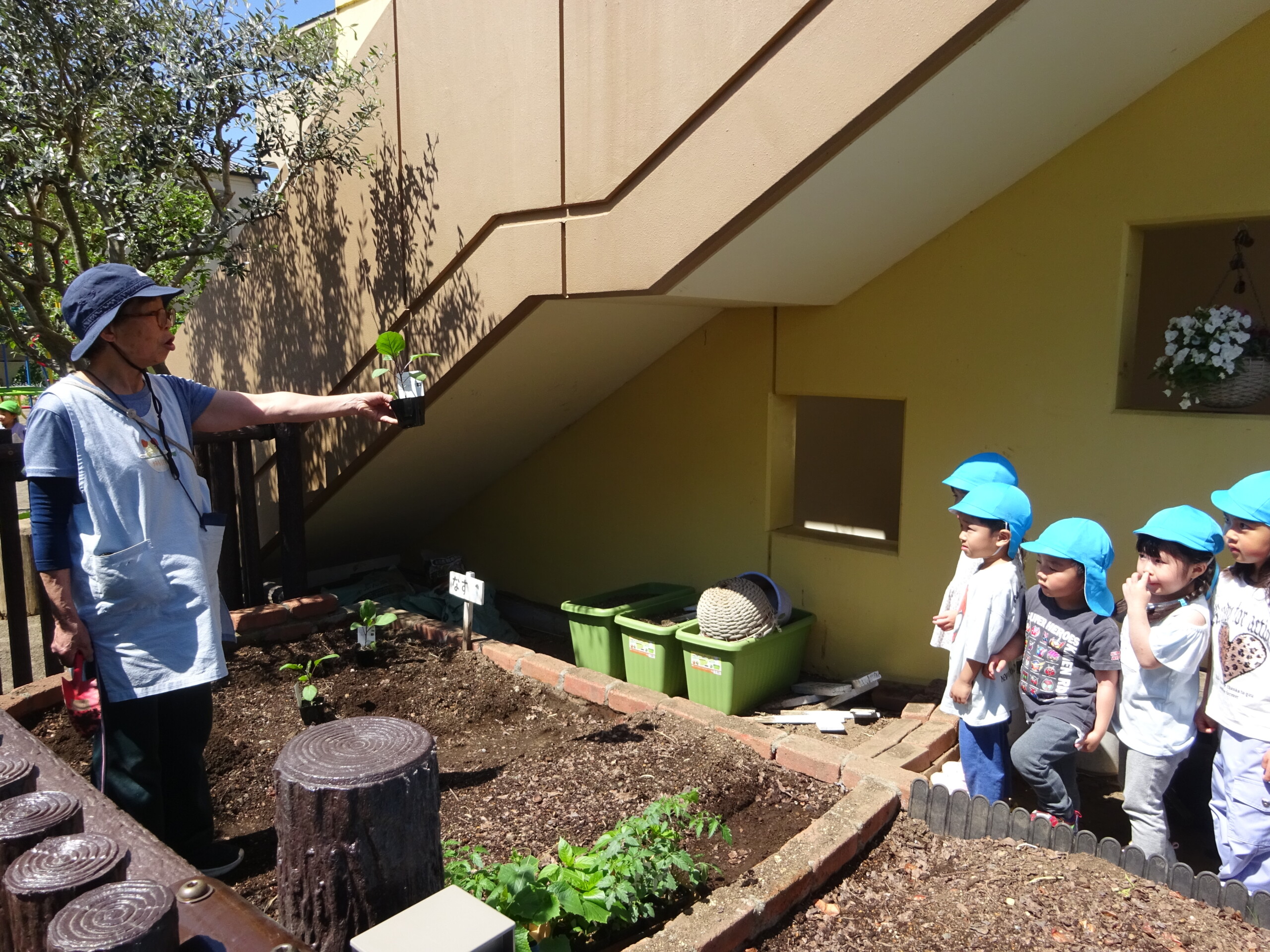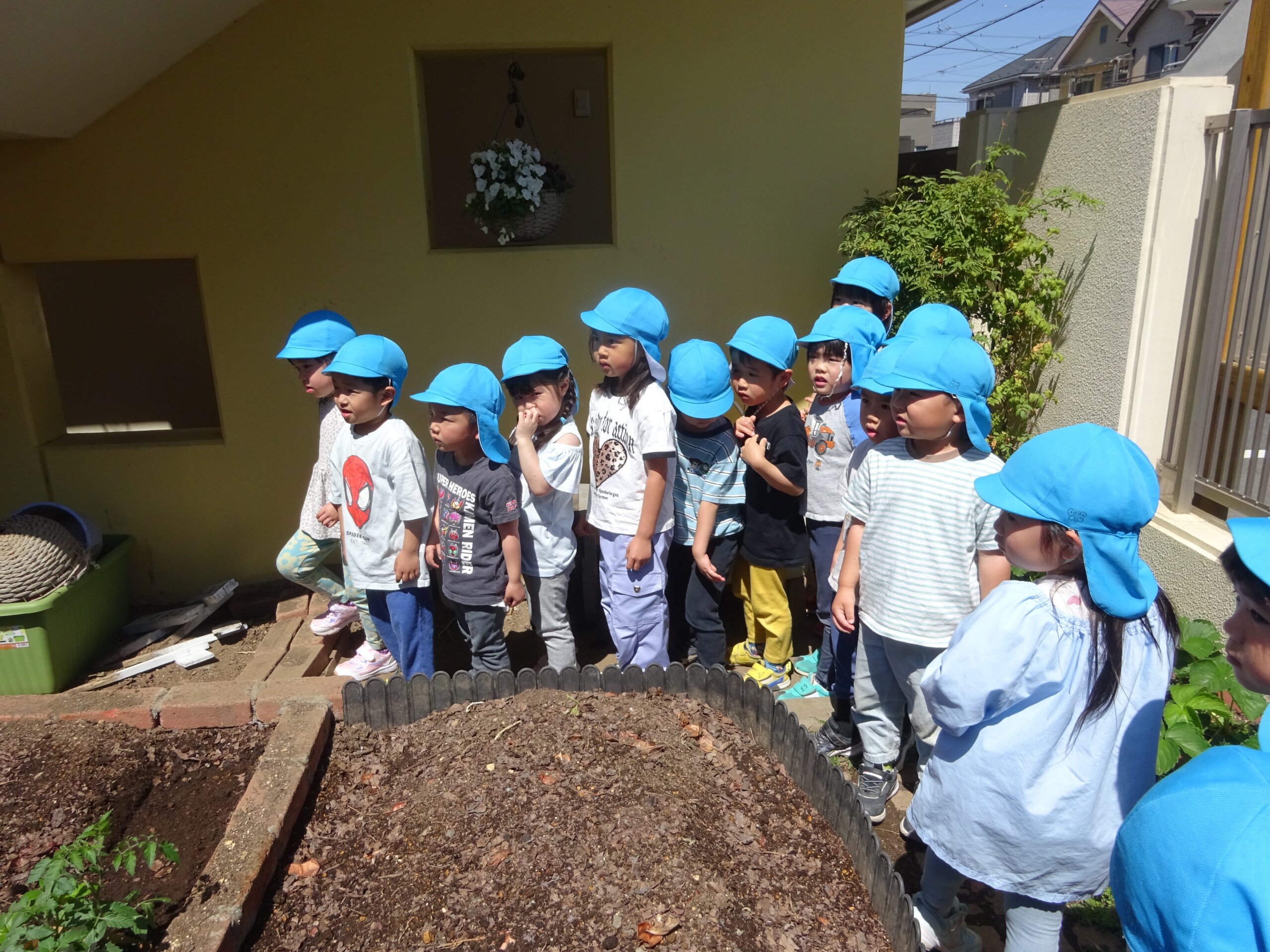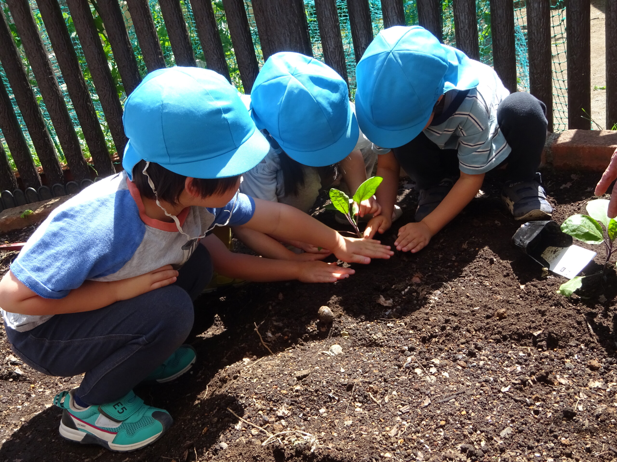 くま組さんが園庭の畑になすの植え付けをしました。なすの育ちや植え付け方の話をすると、みんな静かに聞き入っていました。子どもたち4~5名で一つの苗を丁寧に植え付けていきました。苗を囲み、仲良くワイワイと土をかぶせていく姿が楽しそうでした。おいしいナスになりますようにとお祈りしました。夏に収穫となります。園庭遊びの合間に生長を見守っていこうと思います。 中浦